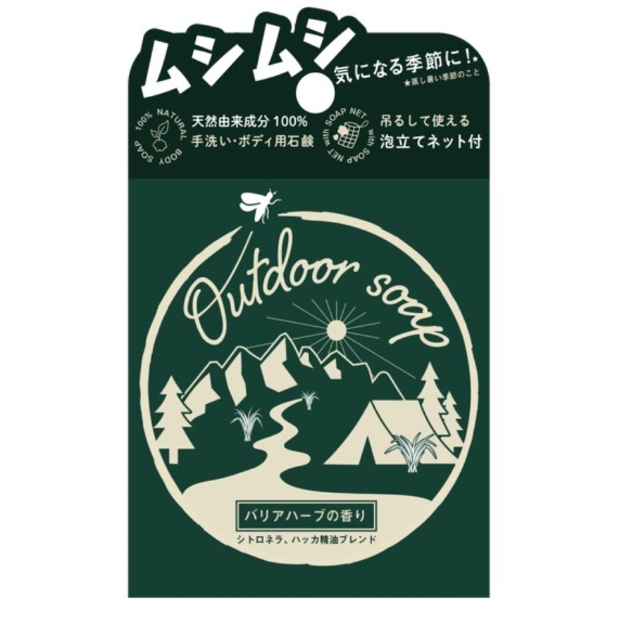 キャンプ場でも使用可能!天然由来成分100%の環境にやさしいボディ用石鹸《Outdoor soap》夏のムシムシ*悩みをスッキリと洗い流す、バリアハーブの香りが特徴。植物釜焚き無添加素地に、シトロネラやハッカ油など12種の天然精油ブレンドのハーブアロマ(4%)を配合。さらに2種の植物オイルとカオリン配合でスッキリなめらかなお肌へ。吊るして使える便利な泡立てネット付き。パッケージには、責任ある森林管理のもとで作られているFSC認証紙を採用。*蒸し暑い季節のこと
