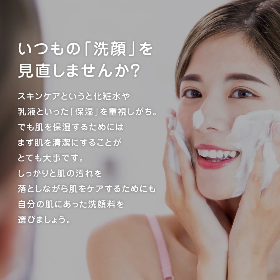 あらかじめ顔を濡らして、手のひらに適量(サクランボ大)をとり、水またはぬるま湯でよく泡立ててからお顔を包み込むように洗います。その後充分に洗い流してください。