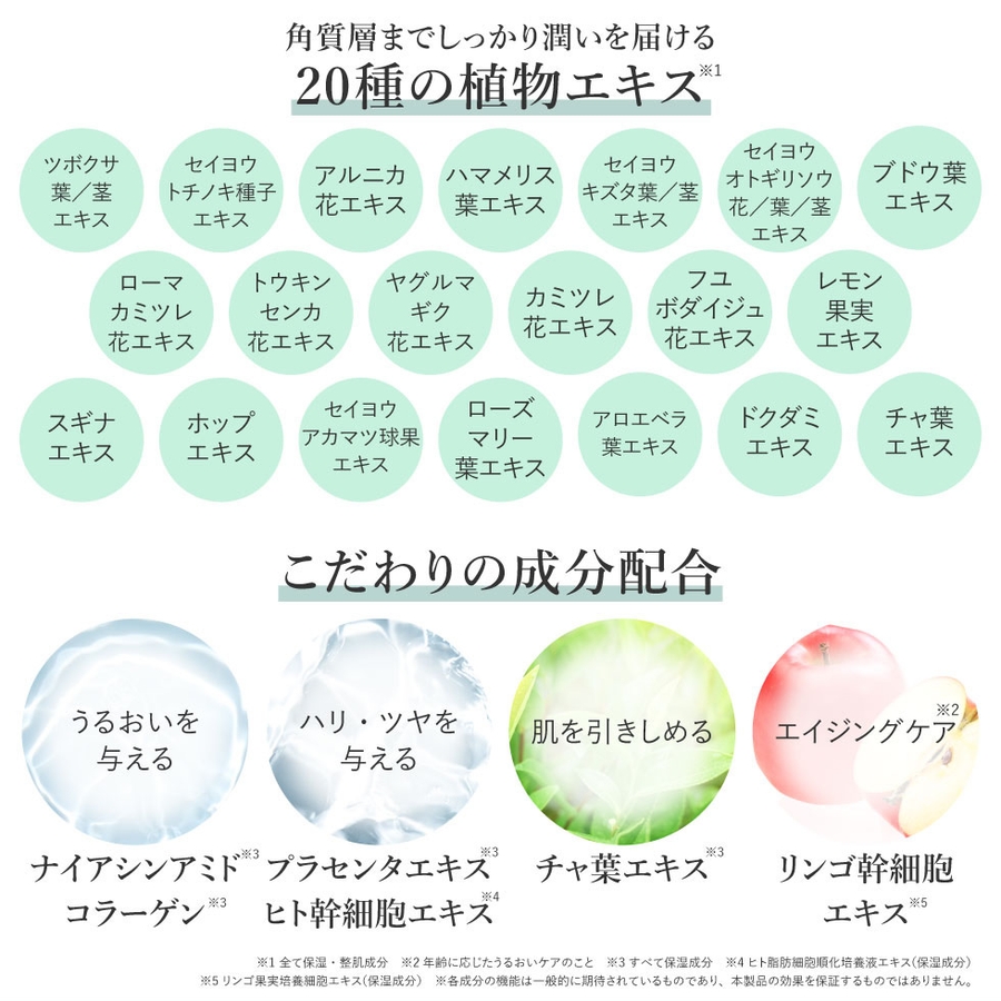 水、DPG、グリセリン、ジグリセリン、ツボクサ葉/茎エキス、ソルビトール、PEG/PPG/ポリブチレングリコール-8/5/3グリセリン、リンゴ果実培養細胞エキス、ナイアシンアミド、ヒト脂肪細胞順化培養液エキス、セイヨウトチノキ種子エキス、アルニカ花エキス、ハマメリス葉エキス、セイヨウキズタ葉/茎エキス、セイヨウオトギリソウ花/葉/茎エキス、ブドウ葉エキス、ローマカミツレ花エキス、トウキンセンカ花エキス、ヤグルマギク花エキス、カミツレ花エキス、フユボダイジュ花エキス、レモン果実エキス、スギナエキス、ホップエキス、セイヨウアカマツ球果エキス、ローズマリー葉エキス、アロエベラ葉エキス、ドクダミエキス、チャ葉エキス、加水分解コラーゲン、プラセンタエキス、PCA-Na、3-O-エチルアスコルビン酸、レシチン、(クエン酸/乳酸/リノール酸/オレイン酸)グリセリル、オリーブ果実油、カプリリルグリコール、トロポロン、BG,1,2-ヘキサンジオール、キサンタンガム、クエン酸、クエン酸Na、ポリソルベート60、ポリソルベート80、ヒドロキシアセトフェノン、フェノキシエタノール