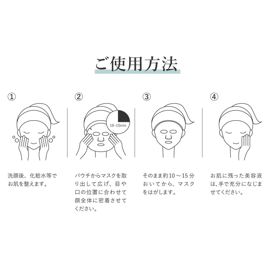 ②パウチからマスクを取り出して広げ、目や口の位置に合わせて顔全体に密着させてください。