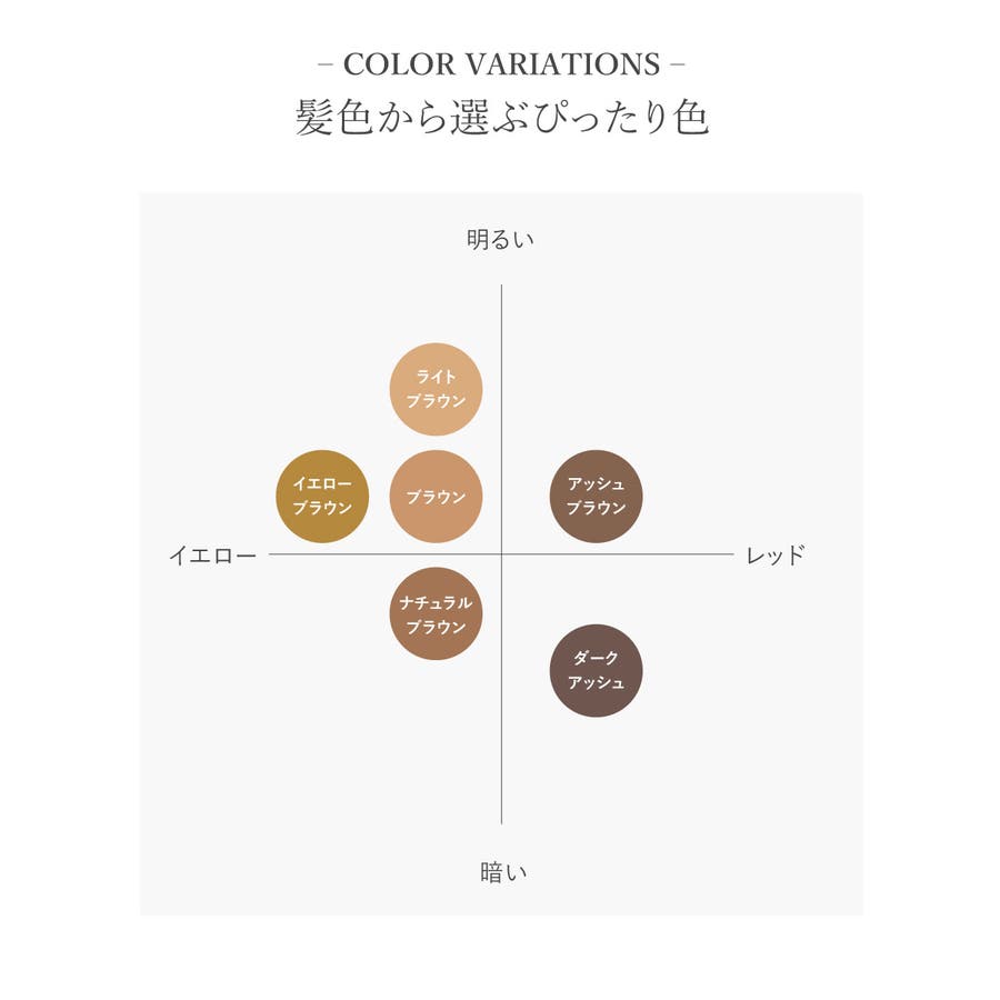 カラー | ライトブラウン / ブラウン / ダークアッシュ / アッシュブラウン / ナチュラルブラウン / イエローブラウン |