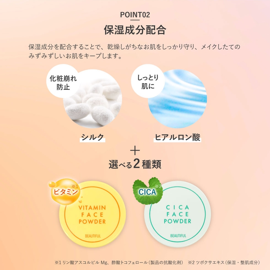 タルク、マイカ、コーンスターチ、シリカ、パルミチン酸エチルヘキシル、リン酸アスコルビルMg、シルク、ヒアルロン酸、酢酸トコフェロール、フェノキシエタノール、メチルパラベン、プロピルパラベン、香料、酸化チタン