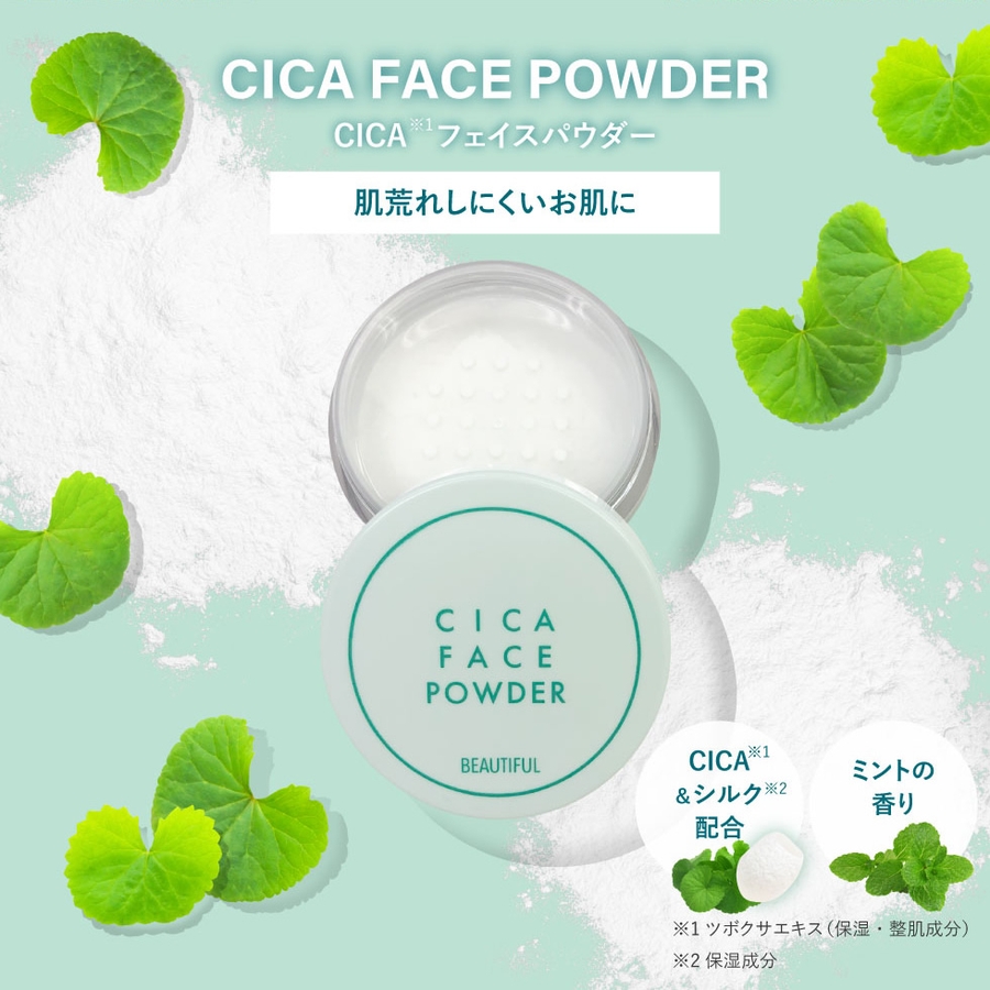 タルク、マイカ、コーンスターチ、シリカ、パルミチン酸エチルヘキシル、ツボクサエキス、シルク、ヒアルロン酸、酢酸トコフェロール、フェノキシエタノール、メチルパラベン、プロピルパラベン、香料、酸化チタン