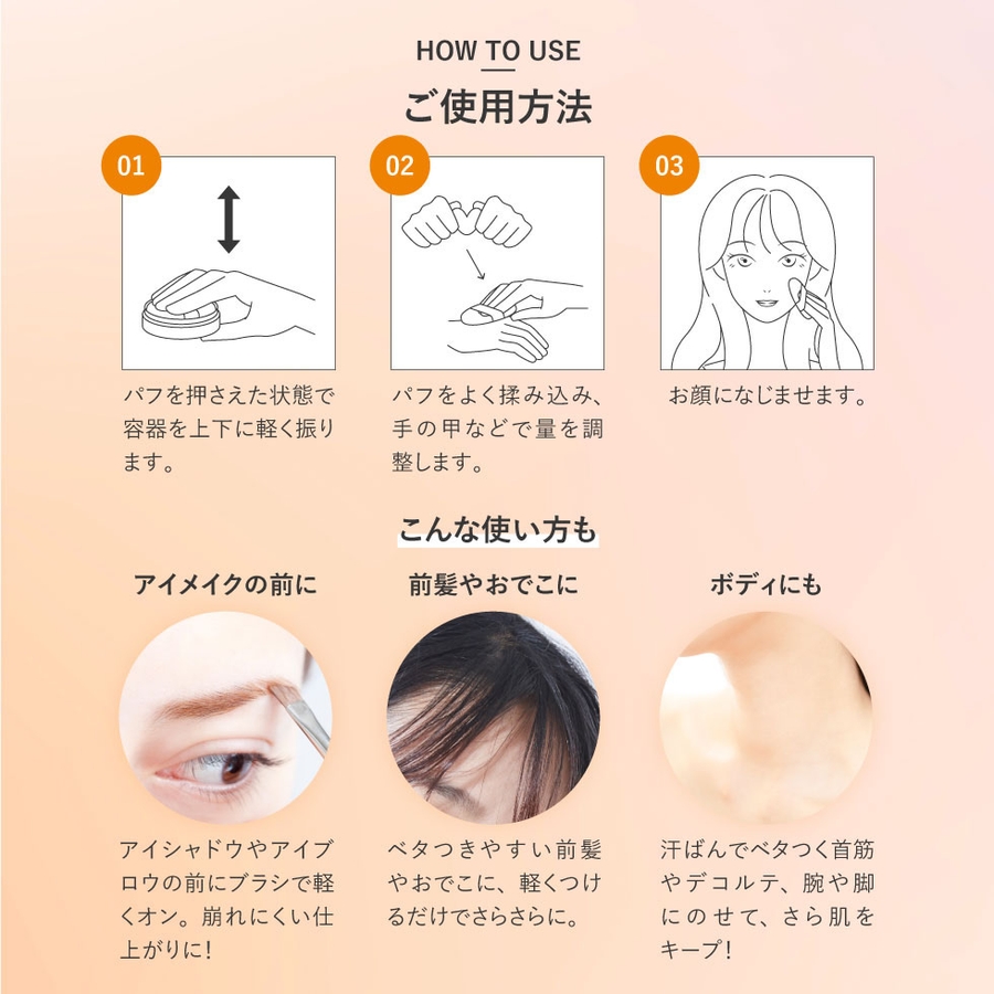 1.パフを押さえた状態で容器を上下に軽く振って、パウダーをとります。