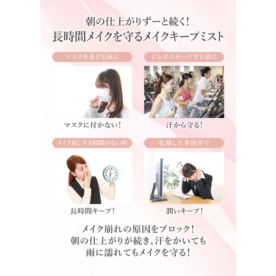 メイクの仕上げにお使いください。顔から15cmくらいはなし、目・口をとじて顔全体にムラなくスプレーします。(4〜5プッシュが目安です。)※スプレーの後は、肌に触れずにそのまま乾かしてください。※落とすときは、クレンジング料をお使いください。