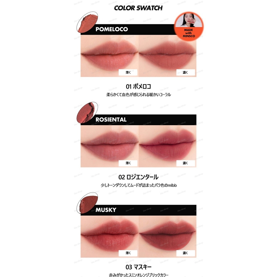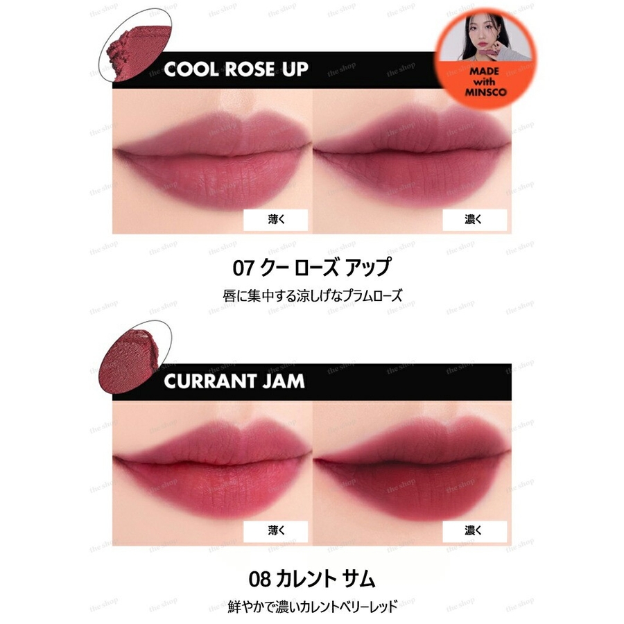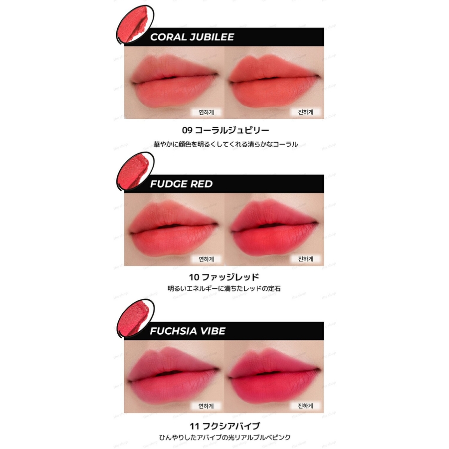| color | 01 ポメロコ / 03 ムスキー / 05 ビビキャンディー / 06 モーヴィッシュ / 07 クールローズアップ / 08 カラントジャム / 09 コーラルジュビリー / 10 ファッジレッド / 11 フューシャバイブ |
