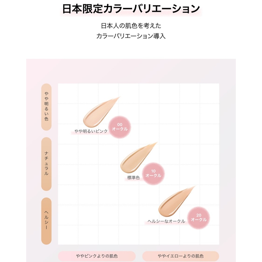 素材 | #00オークル 水、酸化チタン、メトキシケイヒ酸エチルヘキシル、シラカンバ樹液、ジエチルアミノヒドロキシベンゾイル安息香酸ヘキシル、DPG、オクトクリレン、フェニルトリメチコン、水添ポリ(C6-14オレフィン)、ナイアシンアミド、キャンデリラロウ、ジメチコン、シクロペンタシロキサン、BG、ポリメチルシルセスキオキサン、アロエベラ葉エキス、スクワラン、トリイソステアリン、1,2-ヘキサンジオール、シルクエキス、シクロヘキサシロキサン、プロパンジオール、酸化鉄、セチルPEG/PPG-10/1ジメチコン、グルタミン酸Na、(VP/ヘキサデセン)コポリマー、水酸化Al、アルキル(C30-45)メチコン、(ジメチコン/(PEG-10/15))クロスポリマー、アニス酸、ステアリン酸、オレフィン(C30-45)、カプリル酸グリセリル、グリセリン、シラカンバ樹皮エキス、トリエトキシカプリリルシラン、トウキンセンカ花エキス、メマツヨイグサ花エキス、チャボトケイソウエキス、センチフォリアバラ花エキス、ダマスクバラ花エキス、ロサアルバ花エキス、香料、アルミナ、パンテノール、酢酸トコフェロール、セラミドNP、ツボクサエキス、ヘプタン酸ステアリル、アデノシン、(ミリストイル/パルミトイル)オキソ(ステアラミド/アラカミド)MEA、コレステロール、ヒアルロン酸Na、加水分解ヒアルロン酸、ポリヒドロキシステアリン酸、ホクベイフウロソウエキス、乳酸桿菌培養溶解質、ヘマトコッカスプルビアリスエキス、リノール酸、アスタキサンチン、3-O-エチルアスコルビン酸、窒化ホウ素、加水分解コラーゲン、加水分解エラスチン、加水分解カラスムギタンパク、加水分解シルク、シルクアミノ酸、シルク、トリ(カプリル/カプリン酸)グリセリル、マカデミア種子油、水添レシチン、レチノール、スイゼンジノリ細胞外多糖体、アブラナ種子ステロール、ダイズ油、ラウリン酸ポリグリセリル-10、エチルヘキシルグリセリン、レシチン、ラウロイルグルタミン酸ジ(オクチルドデシル/フィトステリル/ベヘニル)、ステアリン酸水酸化(Al/Mg)、テトラ(ジ-t-ブチルヒドロキシヒドロケイヒ酸)ペンタエリスリチル、セチルリン酸K、EDTA-2Na、アスコルビルリン酸Na、アセチルヘキサペプチド-8、キトサン、クエン酸トリス(テトラメチルヒドロキシピペリジノール)、パルミチン酸レチノール、合成ヒト遺伝子組換ポリペプチド-60、レチナール #10オークル 水、酸化チタン、メトキシケイヒ酸エチルヘキシル、シラカンバ樹液、ジエチルアミノヒドロキシベンゾイル安息香酸ヘキシル、DPG、オクトクリレン、フェニルトリメチコン、水添ポリ(C6-14オレフィン)、ナイアシンアミド、キャンデリラロウ、ジメチコン、シクロペンタシロキサン、BG、ポリメチルシルセスキオキサン、アロエベラ葉エキス、スクワラン、トリイソステアリン、1,2-ヘキサンジオール、シルクエキス、シクロヘキサシロキサン、酸化鉄、プロパンジオール、セチルPEG/PPG-10/1ジメチコン、グルタミン酸Na、(VP/ヘキサデセン)コポリマー、水酸化Al、アルキル(C30-45)メチコン、(ジメチコン/(PEG-10/15))クロスポリマー、アニス酸、ステアリン酸、オレフィン(C30-45)、カプリル酸グリセリル、グリセリン、シラカンバ樹皮エキス、トリエトキシカプリリルシラン、トウキンセンカ花エキス、メマツヨイグサ花エキス、チャボトケイソウエキス、センチフォリアバラ花エキス、ダマスクバラ花エキス、ロサアルバ花エキス、香料、アルミナ、パンテノール、酢酸トコフェロール、セラミドNP、ツボクサエキス、ヘプタン酸ステアリル、アデノシン、(ミリストイル/パルミトイル)オキソ(ステアラミド/アラカミド)MEA、コレステロール、ヒアルロン酸Na、加水分解ヒアルロン酸、ポリヒドロキシステアリン酸、ホクベイフウロソウエキス、乳酸桿菌培養溶解質、ヘマトコッカスプルビアリスエキス、リノール酸、アスタキサンチン、3-O-エチルアスコルビン酸、窒化ホウ素、加水分解コラーゲン、加水分解エラスチン、加水分解カラスムギタンパク、加水分解シルク、シルクアミノ酸、シルク、トリ(カプリル/カプリン酸)グリセリル、マカデミア種子油、水添レシチン、レチノール、スイゼンジノリ細胞外多糖体、アブラナ種子ステロール、ダイズ油、ラウリン酸ポリグリセリル-10、エチルヘキシルグリセリン、レシチン、ラウロイルグルタミン酸ジ(オクチルドデシル/フィトステリル/ベヘニル)、ステアリン酸水酸化(Al/Mg)、テトラ(ジ-t-ブチルヒドロキシヒドロケイヒ酸)ペンタエリスリチル、セチルリン酸K、EDTA-2Na、アスコルビルリン酸Na、アセチルヘキサペプチド-8、キトサン、クエン酸トリス(テトラメチルヒドロキシピペリジノール)、パルミチン酸レチノール、合成ヒト遺伝子組換ポリペプチド-60、レチナール #20オークル 水、酸化チタン、メトキシケイヒ酸エチルヘキシル、シラカンバ樹液、ジエチルアミノヒドロキシベンゾイル安息香酸ヘキシル、DPG、オクトクリレン、フェニルトリメチコン、水添ポリ(C