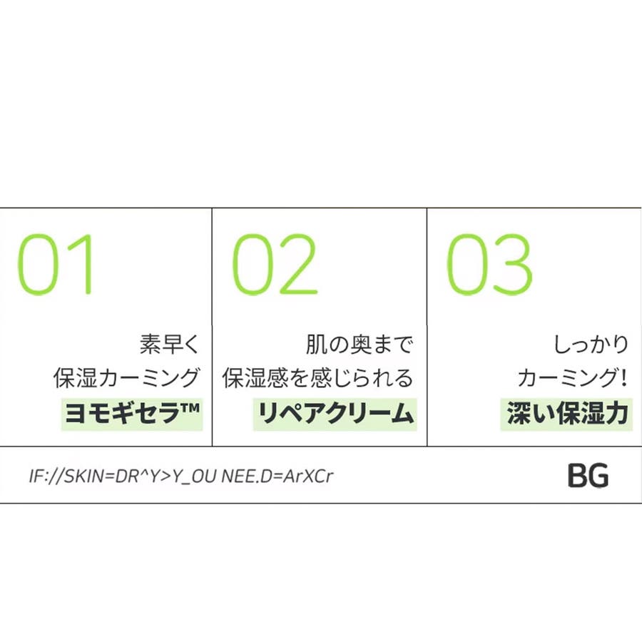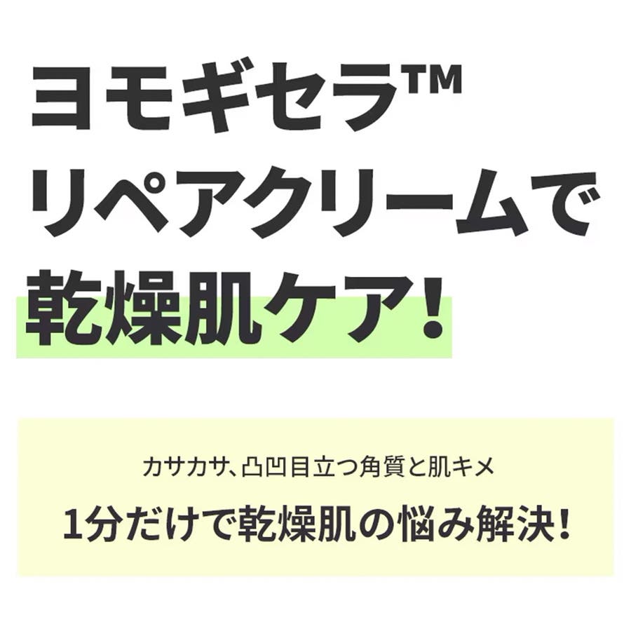 ヨモギセラ™成分は、普段のヨモギより2倍早い保湿カーミングを与える。②ヨモギセラ™リペアクリームで乾燥肌ケア!