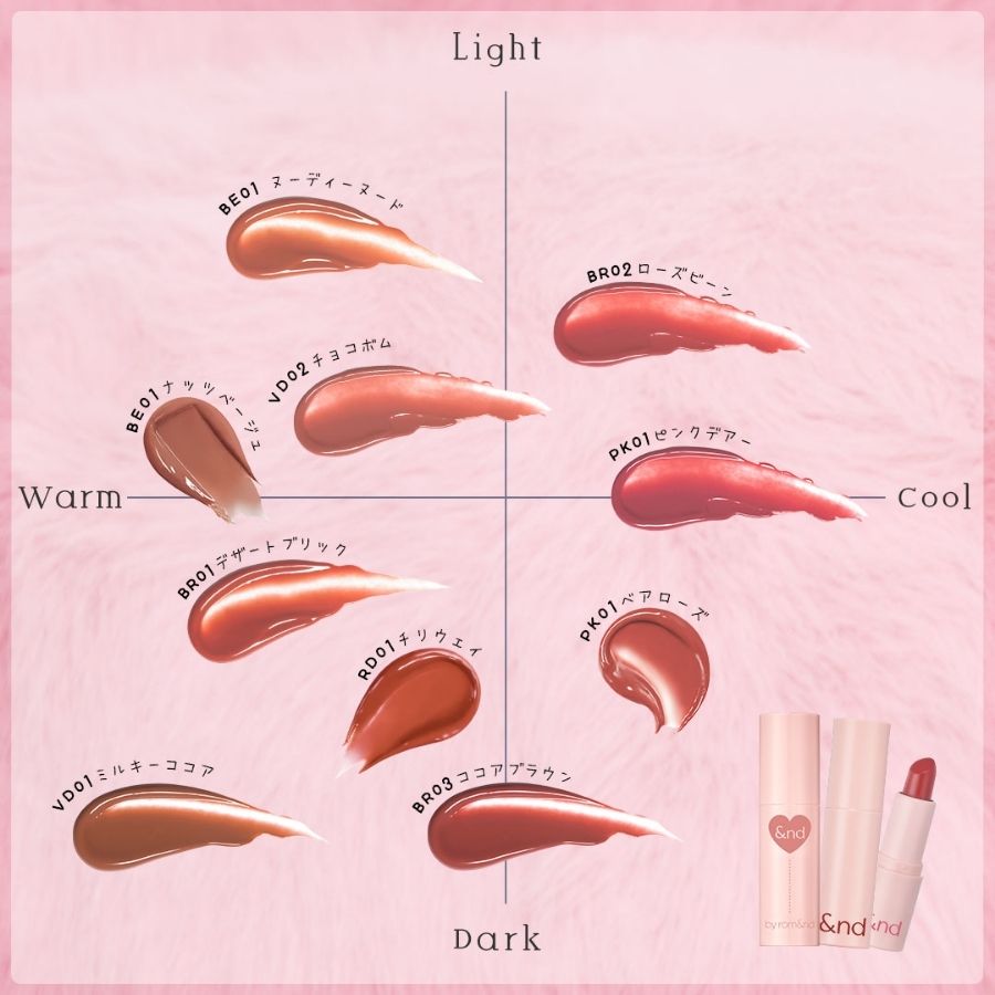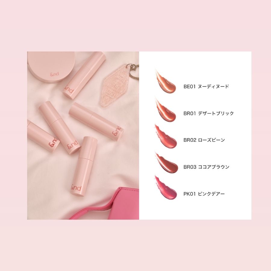 | カラー | BE01 ヌーディヌード / PK01 ピンクデアー / BR01 デザートブリック / BR02 ローズビーン / BR03 ココアブラウン |