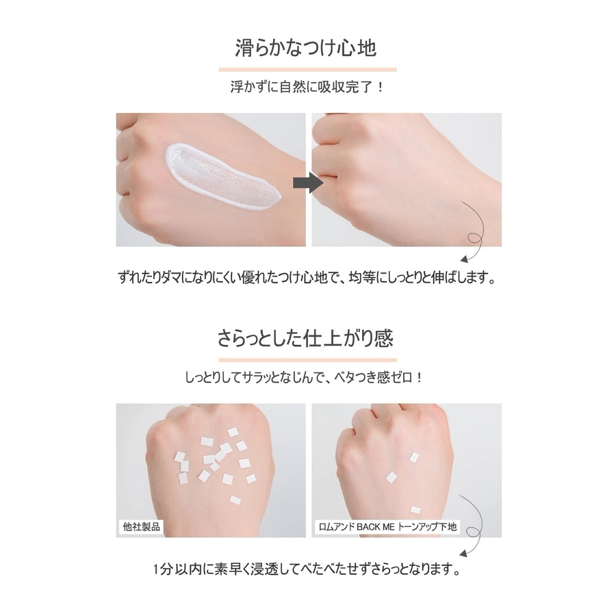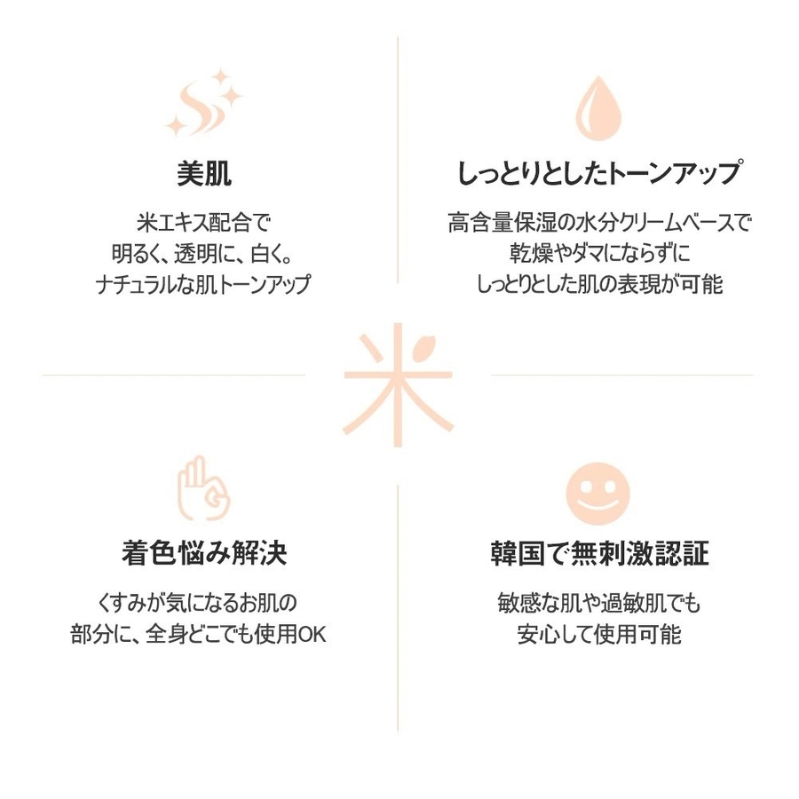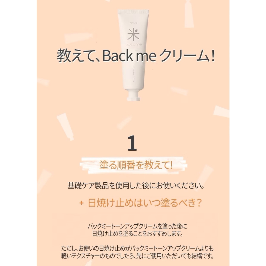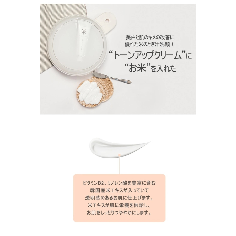 「バックミートーンアップクリーム」はコメエキス(整肌・保湿成分)配合で肌を明るく整え、しっとりとしたツヤ感を与えます。