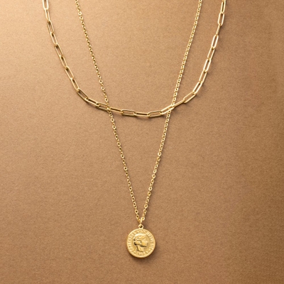 コインモチーフ&オーバルチェーンの2セットネックレス。重ねての着用はもちろん、それぞれ単品でもお使い頂ける嬉しい3WAY仕様◎錆びにくく傷に強いステンレス製で、デイリーに使える組み合わせがひと品です。