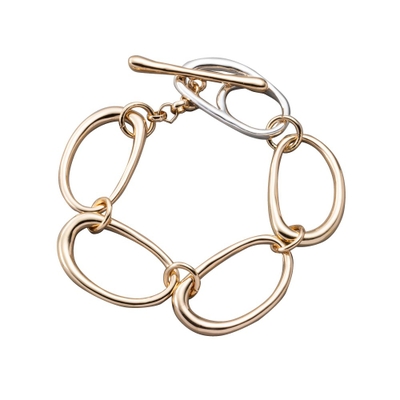 クラフト感ある少し歪な形のオーバルチェーンが連なるブレスレット。チェーンと留め具部分のコンビカラーが抜け感のあるお洒落な手元を演出◎存在感バツグンなルックスでいつものスタイリングをクラスアップしてくれます。低アレルギーのニッケルフリー素材を使用しているので、長時間の着用も安心です。