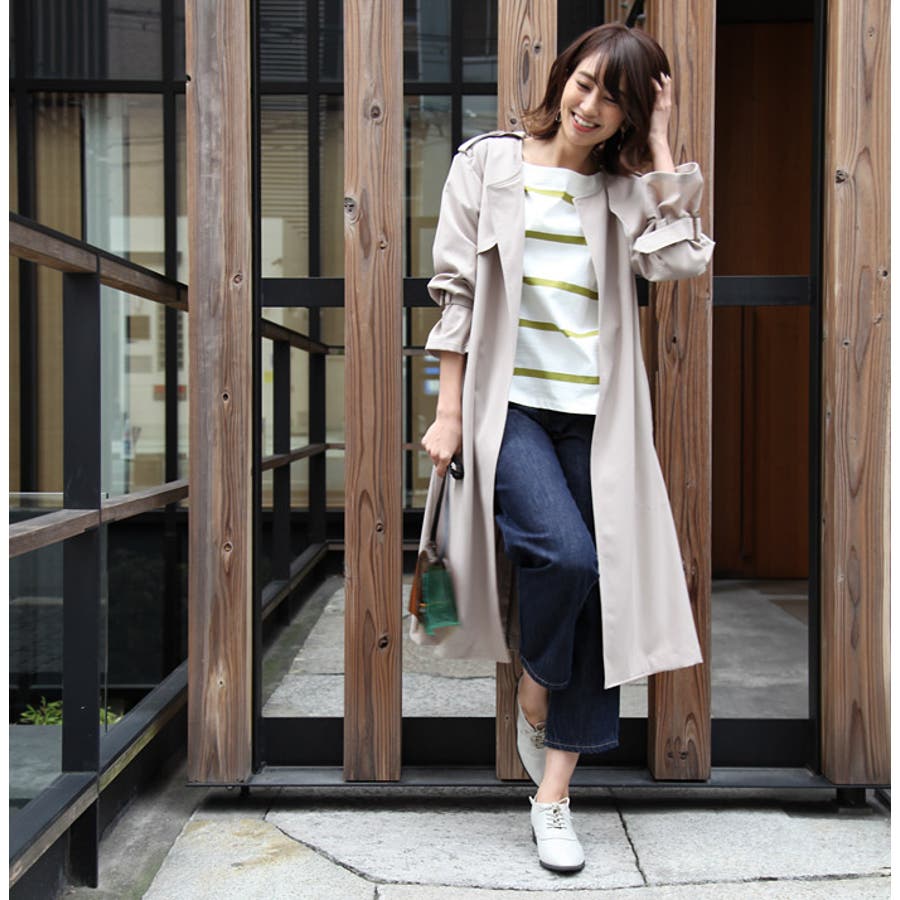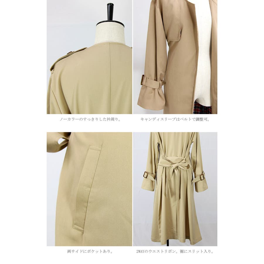 定番アウター、ロングトレンチコートがアップデート。キャンディースリーブとノーカラーが上品で女性らしい印象を与えます。