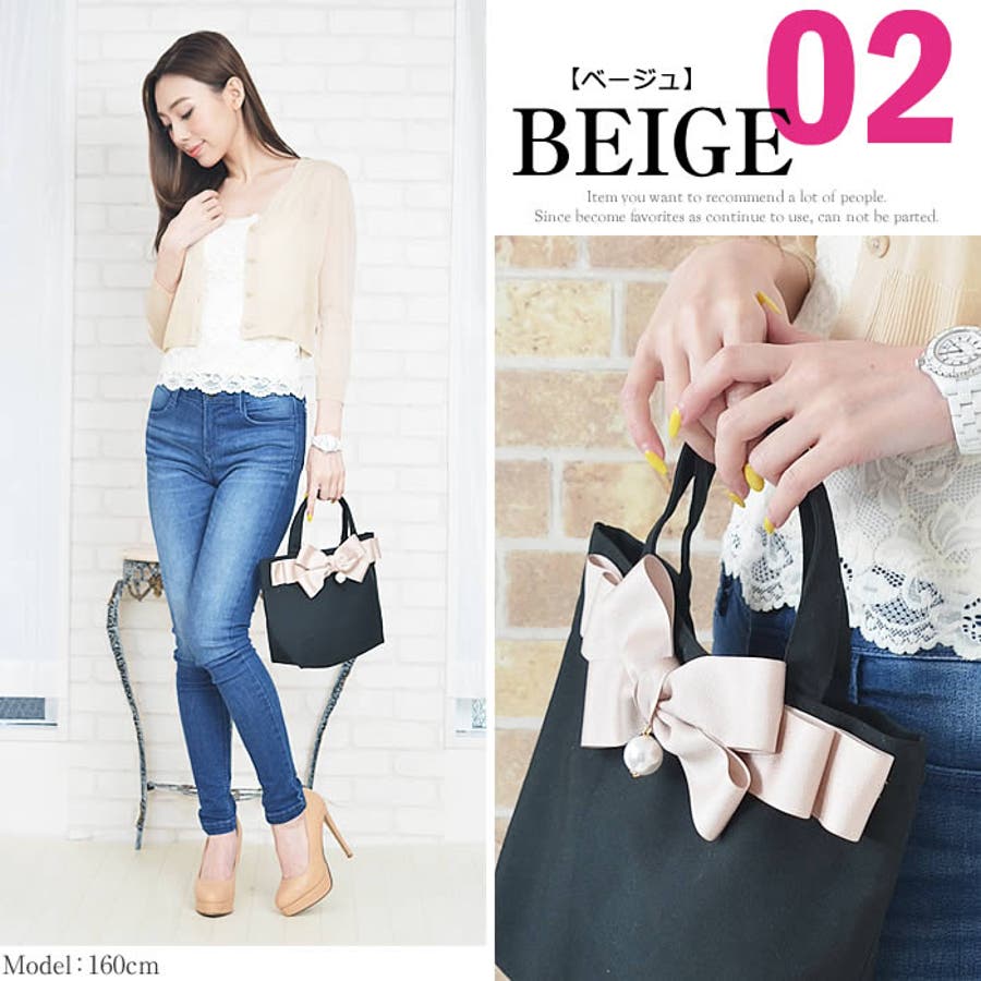 幅広のグログランリボンとパールがアクセントになった便利なミニトートバッグ。