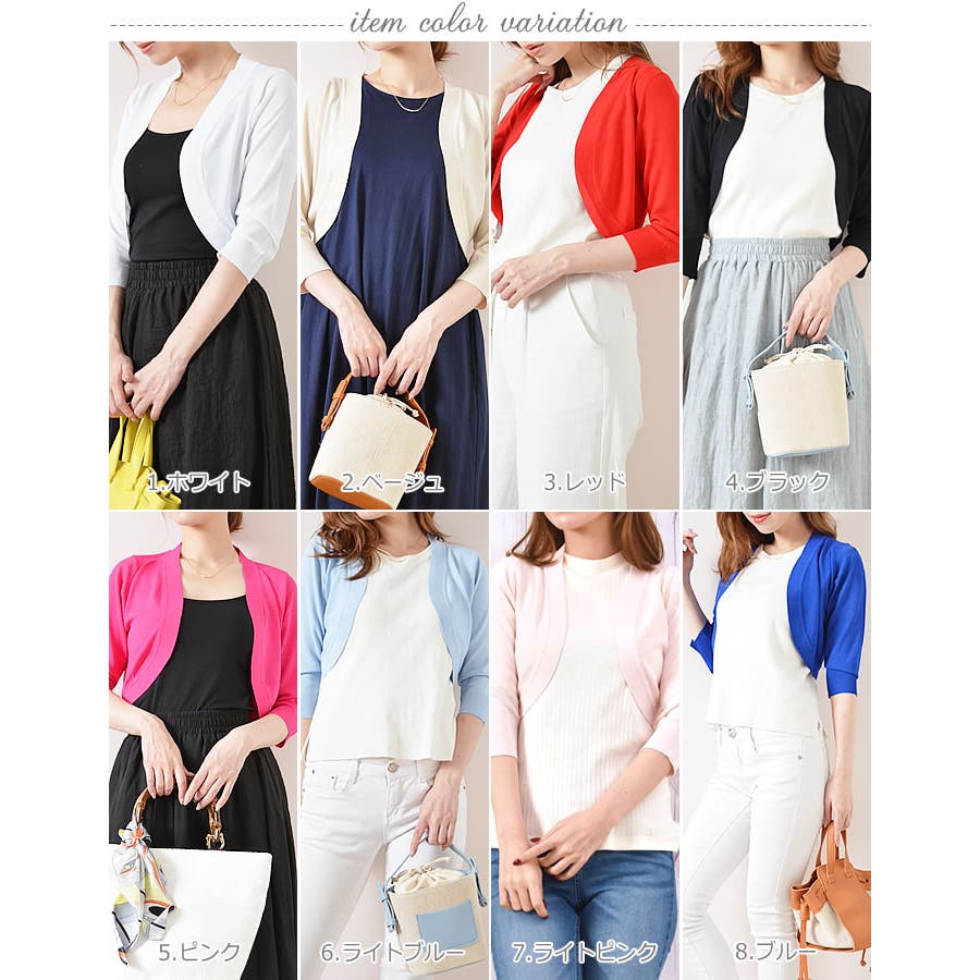 カラー | 01.ホワイト/七分袖 / 02.ベージュ/七分袖 / 03.レッド/七分袖 / 04.ブラック/七分袖 / 05.ピンク/七分袖 / 06.ライトブルー/七分袖 / 07.ライトピンク/七分袖 / 08.ブルー/七分袖 |