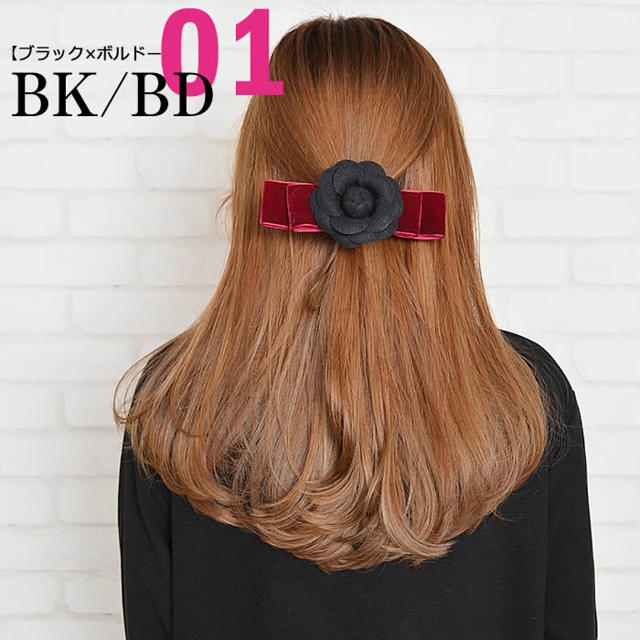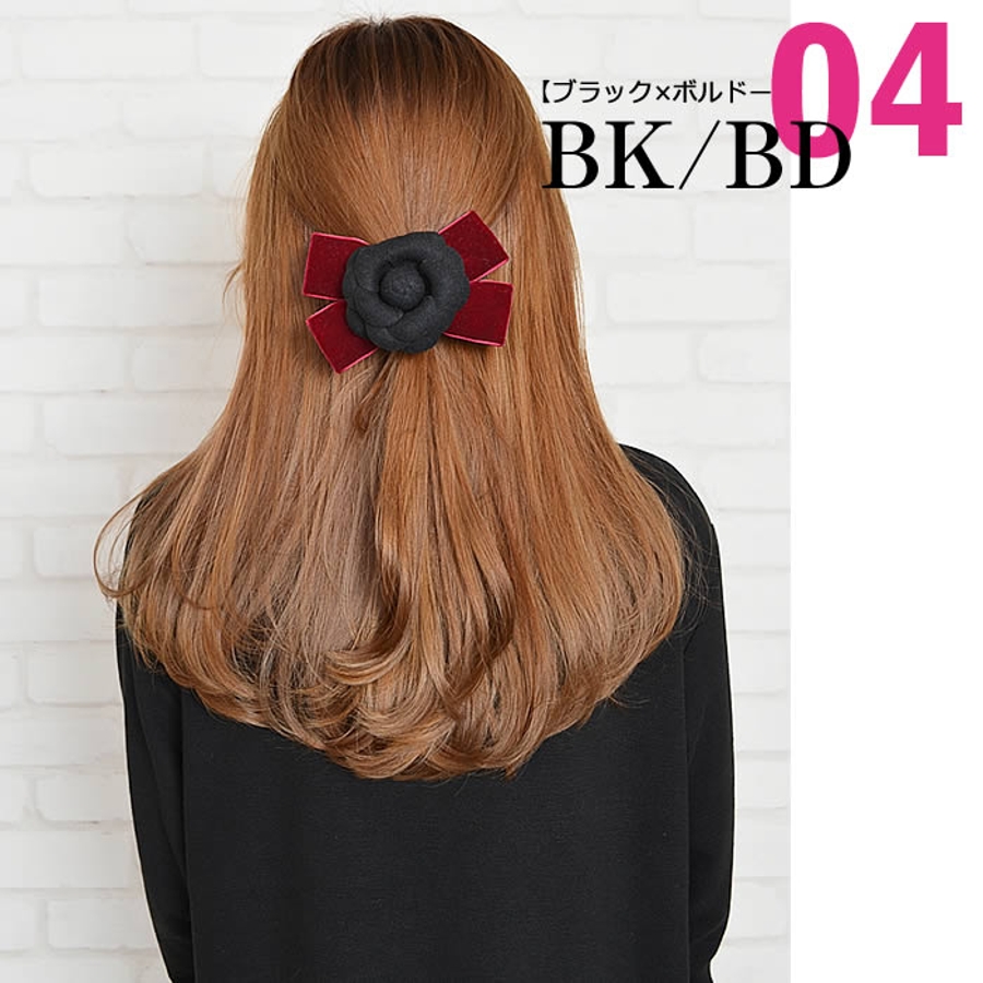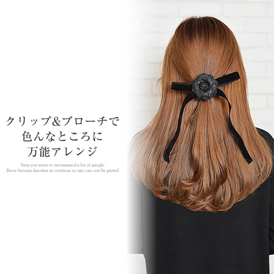 クリップとブローチが付いて色んなところに万能アレンジ♪カメリア付きリボンコサージュ。