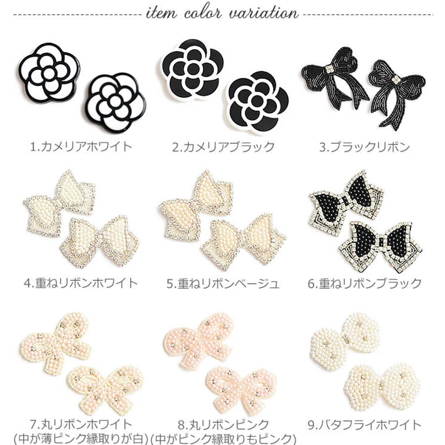 ■カラー:1.カメリアホワイト・2.カメリアブラック・3.ブラックリボン・4.重ねリボンホワイト・5.重ねリボンベージュ・6.重ねリボンブラック・7.丸リボンホワイト・8.丸リボンピンク・9.バタフライホワイト・10.縁リボンホワイト・11.縁リボンブラック・12.縁カメリアホワイト・13.ロングリボンホワイト・14.ロングリボンブラック・15.ドットリボンホワイト・16.ドットリボンブラック・17.縁カメリアブラック