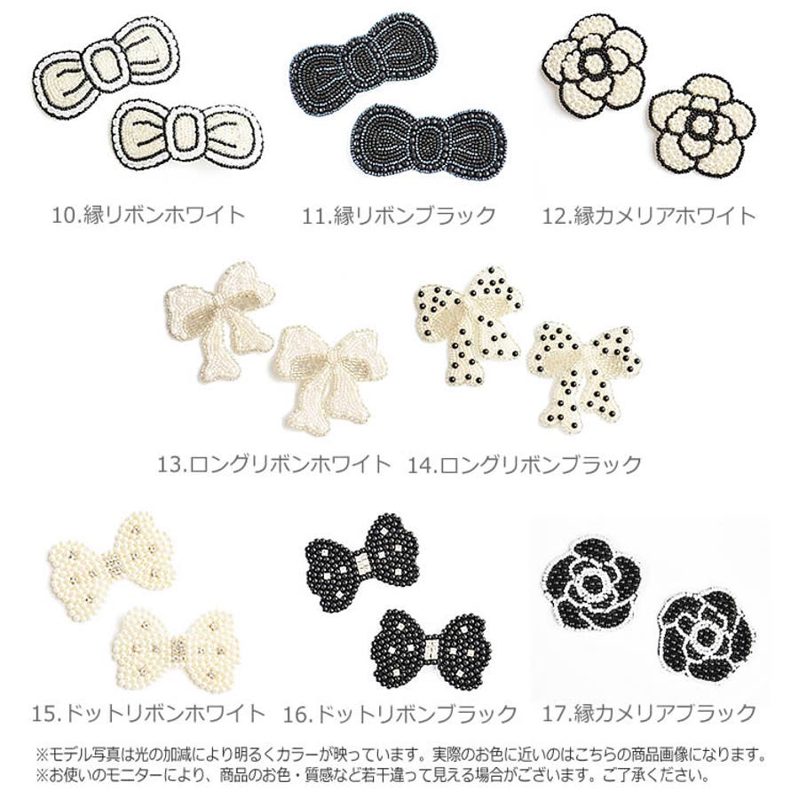 ■サイズ:【1・2 カメリア】縦4.5×横4.6cm 【3 ブラックリボン】縦7×横6.5cm 【4~6重ねリボン】縦5.3×横8.8cm 【7・8 丸リボン】縦4.8×横7cm 【9 バタフライ】縦4.5×横7.5cm 【10・11縁リボン】縦4.5×横9.4cm 【12・17 縁カメリア】縦6.3×横6.3cm 【13・14ロングリボン】縦7×横7.3cm 【15・16 ドットリボン】 縦5.2×横7.9cm