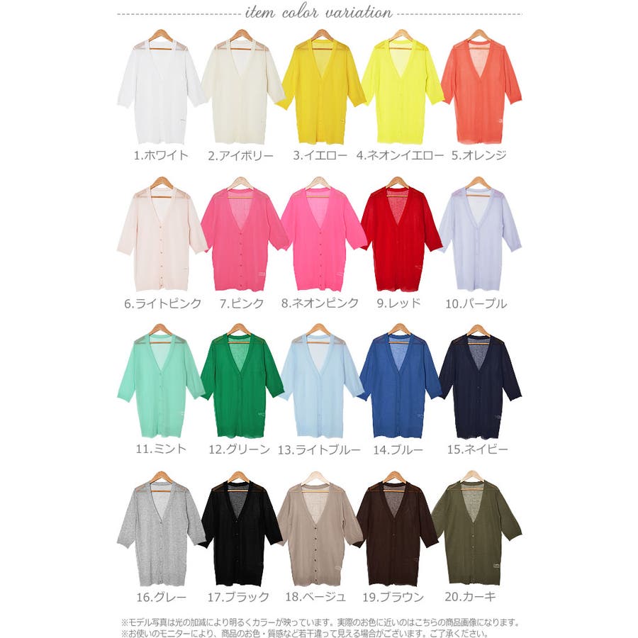 ■カラー:1.ホワイト・2.アイボリー・3.イエロー・4.ネオンイエロー・5.オレンジ・6.ライトピンク・7.ピンク・8.ネオンピンク・9.レッド・10.パープル・11.ミント・12.グリーン・13.ライトブルー・14.ブルー・15.ネイビー・16.グレー・17.ブラック・18.ベージュ・19.ブラウン・20.カーキ