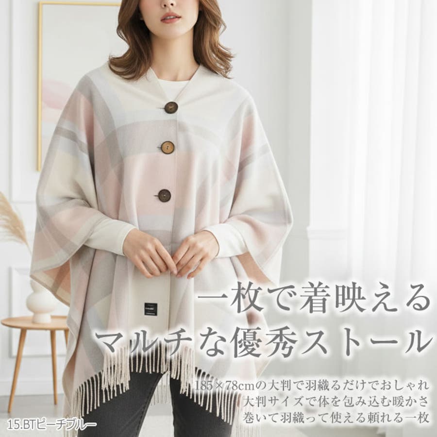 暖かなしっかり素材でふんわり心地よいBIGボタン付き大判チェックストール♪
