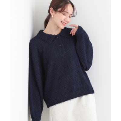 毛足のあるカールヤーン糸を使用した、1枚で印象的な長袖のポロニット。