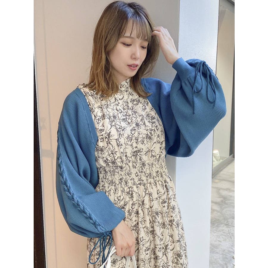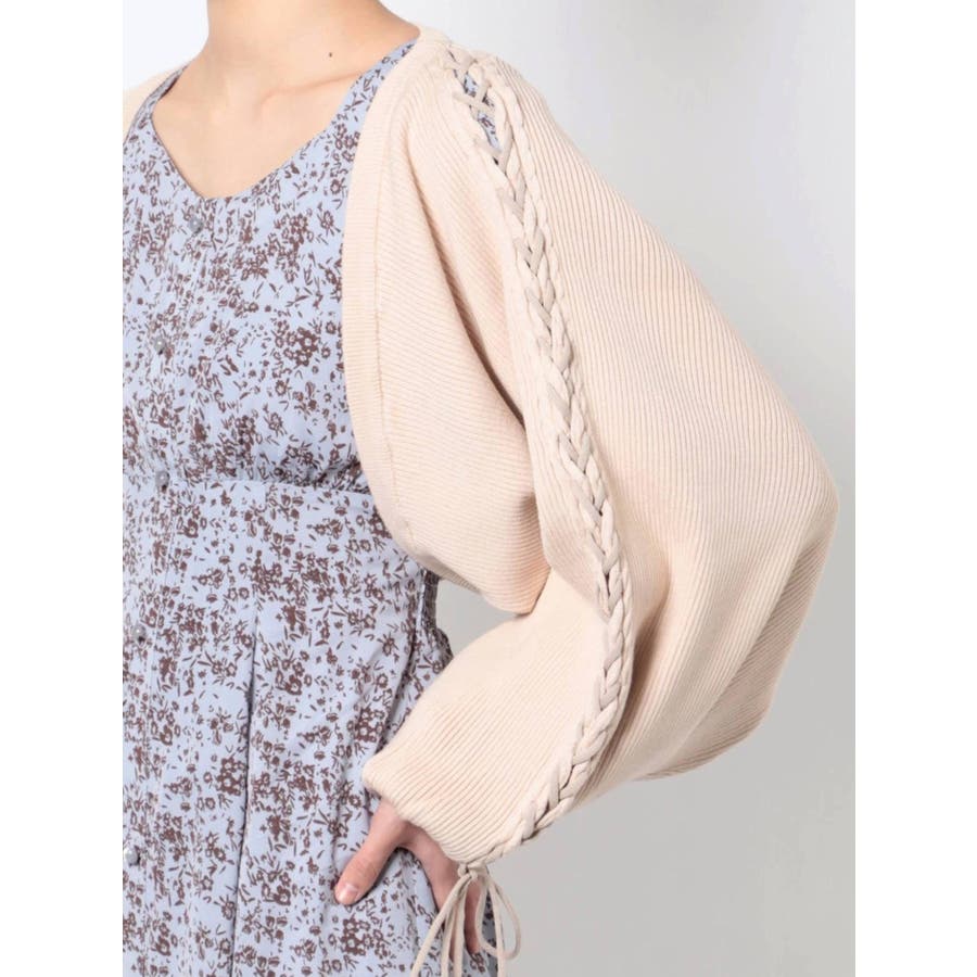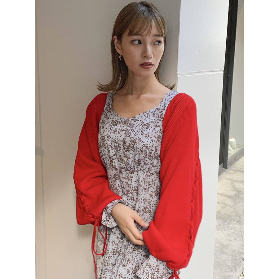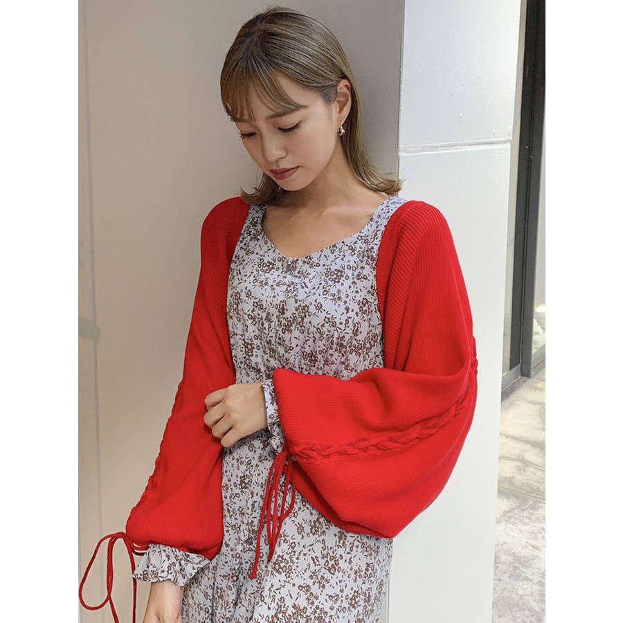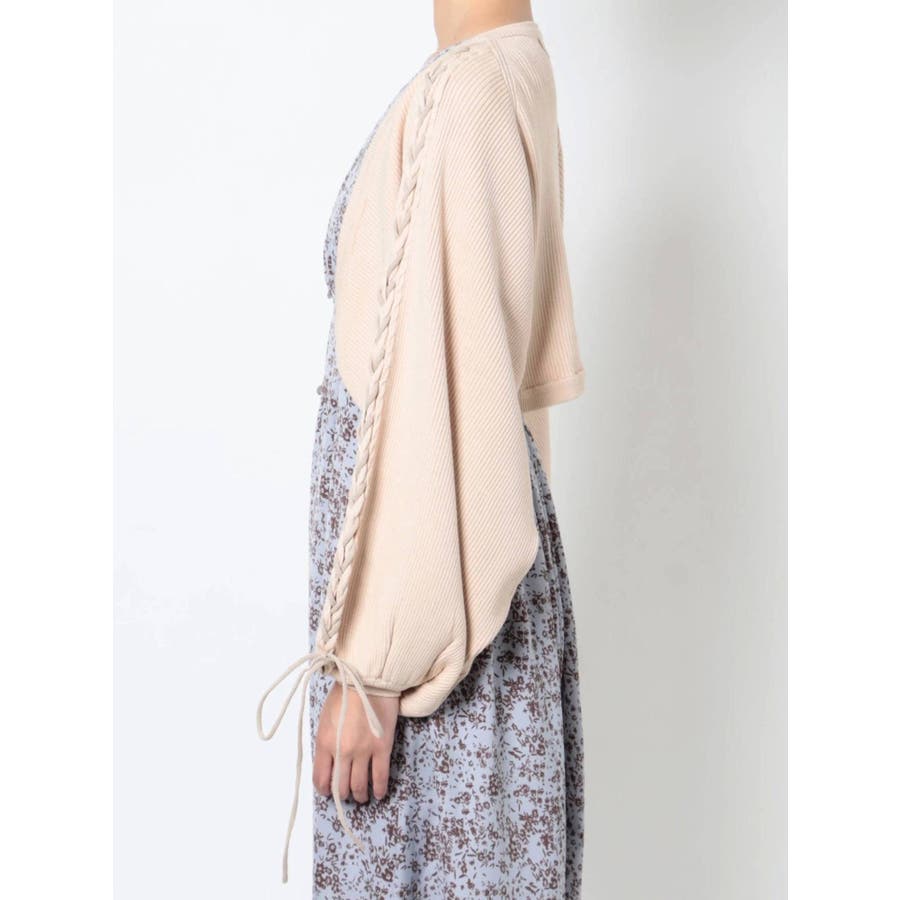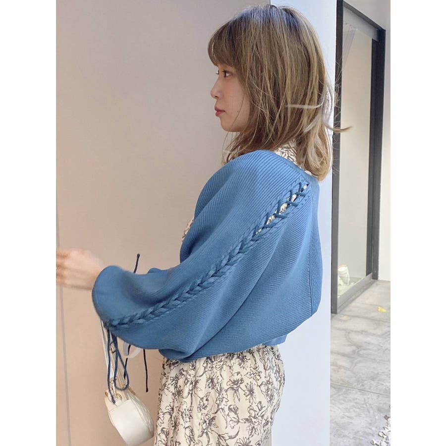 ボリューム感のあるたぷっと袖がガーリーなアイテム?腕全体にレースアップを入れ込んで抜け感を出しました。ショート丈でスタイルアップを演出します。さらっとした糸でキレイ目な印象に。【スタイリング】シャツワンピースなどに合わせてコーデに使っても可愛いです。ブラウスアイテムなども簡単に温かみを待たせてくれるのでおすすめです。
