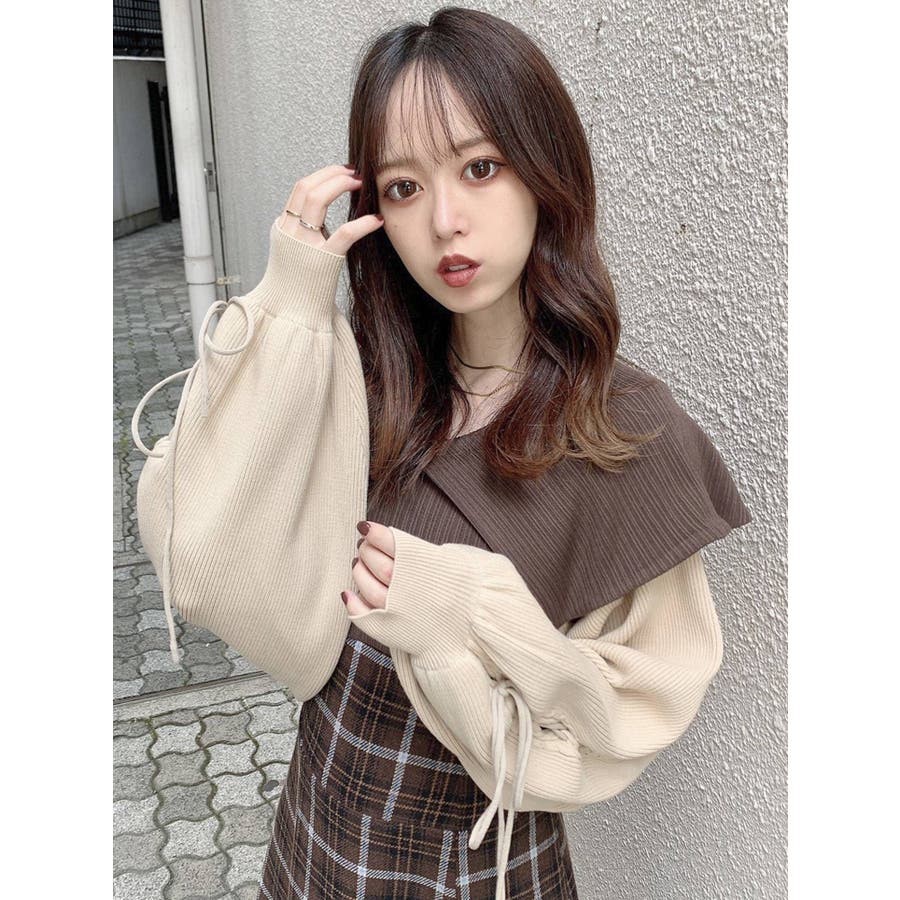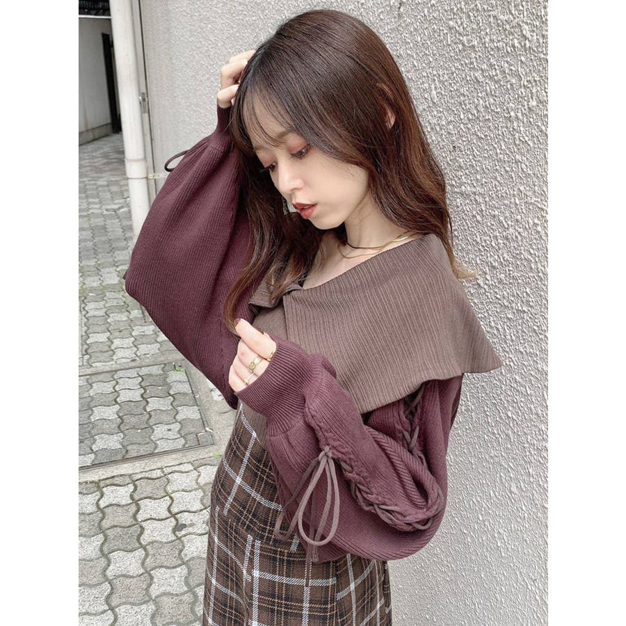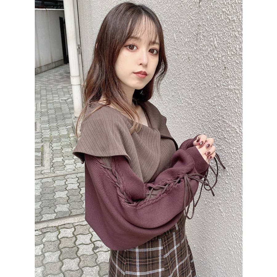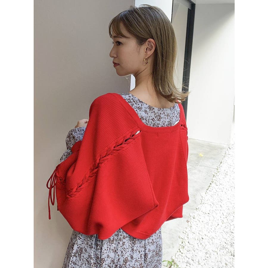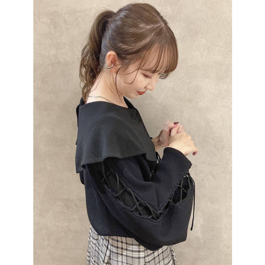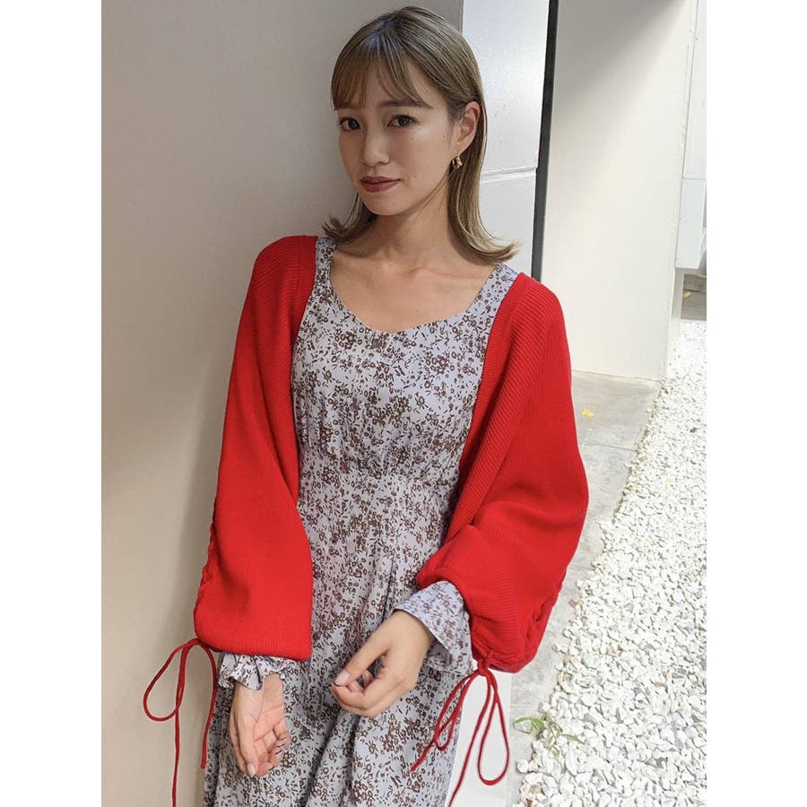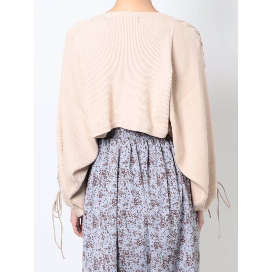 ボリューム感のあるたぷっと袖がガーリーなアイテム?腕全体にレースアップを入れ込んで抜け感を出しました。ショート丈でスタイルアップを演出します。さらっとした糸でキレイ目な印象に。【スタイリング】シャツワンピースなどに合わせてコーデに使っても可愛いです。ブラウスアイテムなども簡単に温かみを待たせてくれるのでおすすめです。
