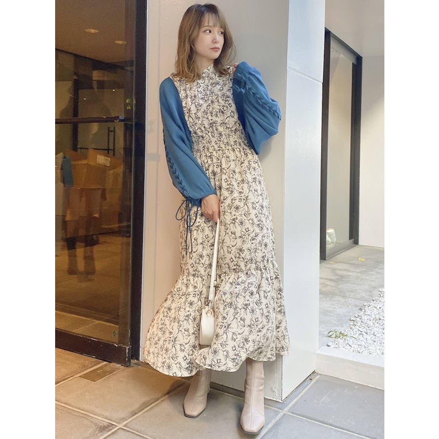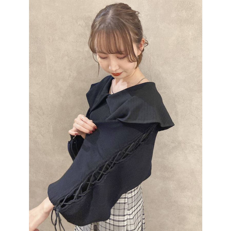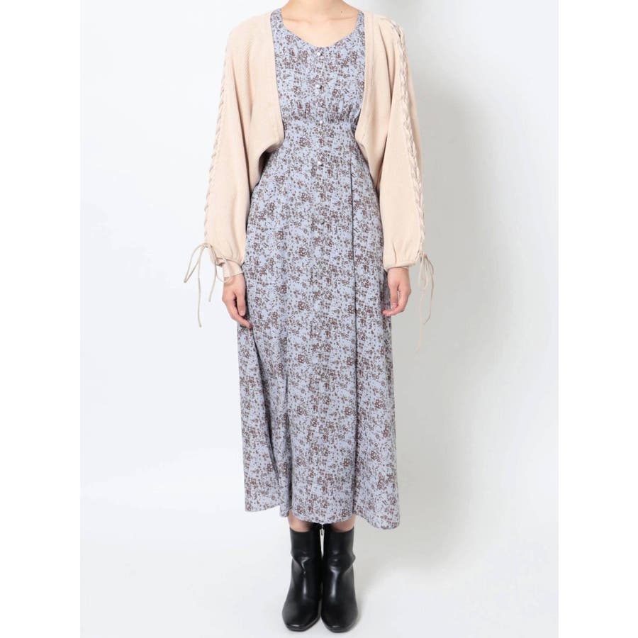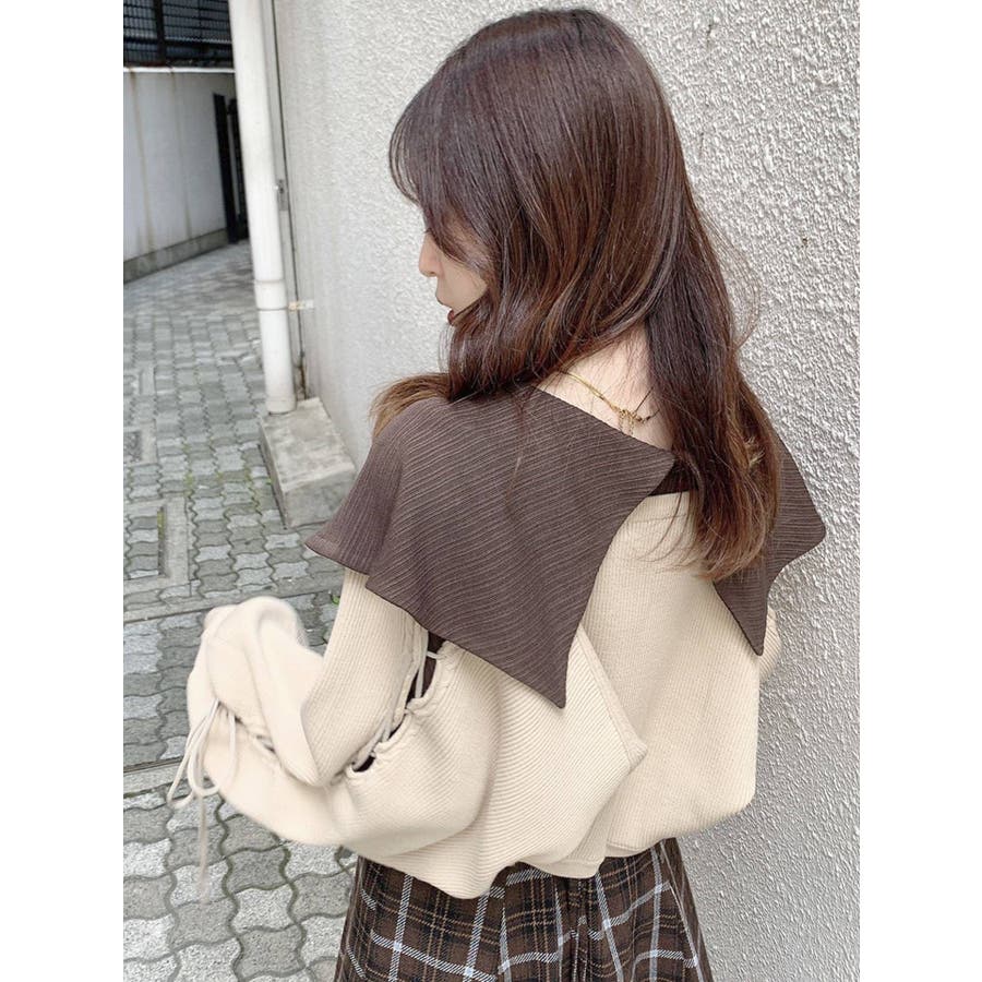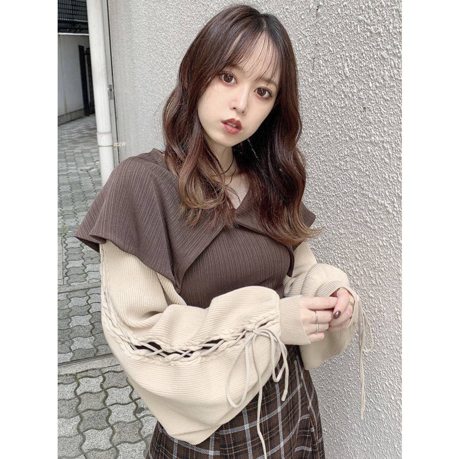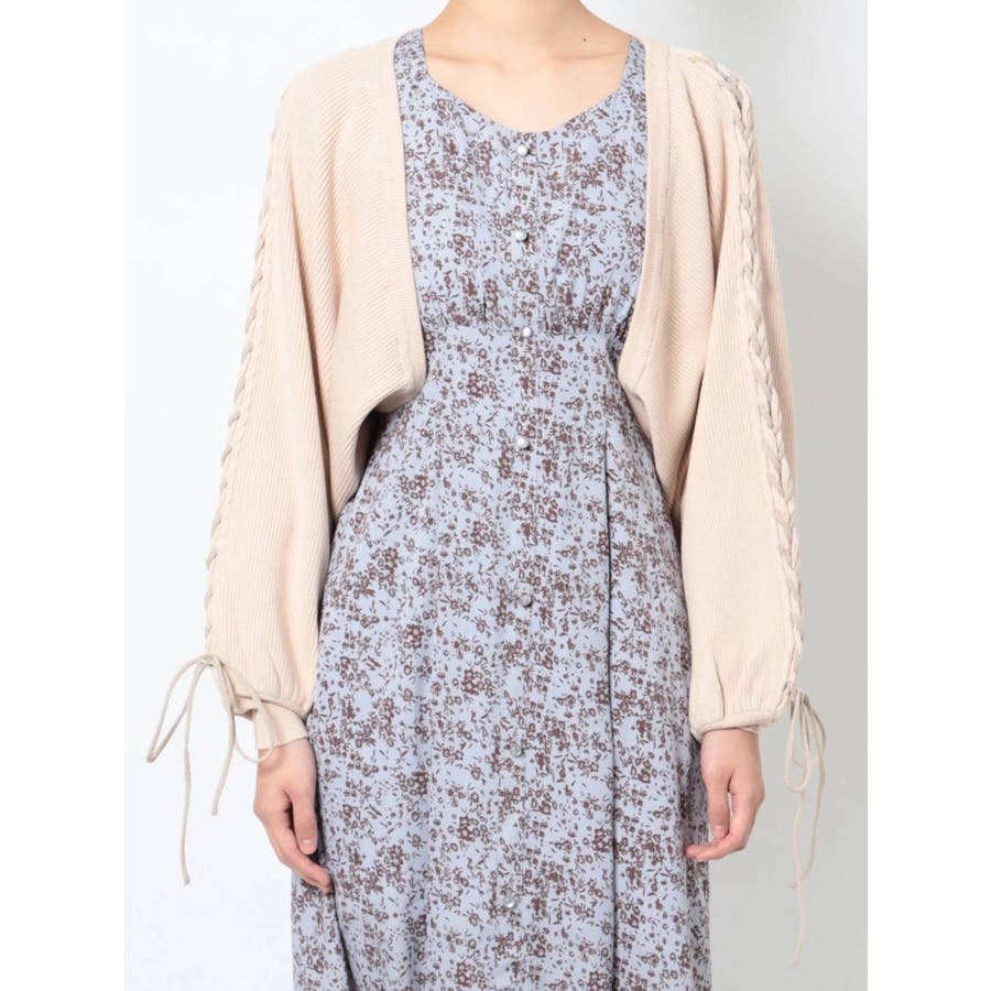 ボリューム感のあるたぷっと袖がガーリーなアイテム?腕全体にレースアップを入れ込んで抜け感を出しました。ショート丈でスタイルアップを演出します。さらっとした糸でキレイ目な印象に。【スタイリング】シャツワンピースなどに合わせてコーデに使っても可愛いです。ブラウスアイテムなども簡単に温かみを待たせてくれるのでおすすめです。