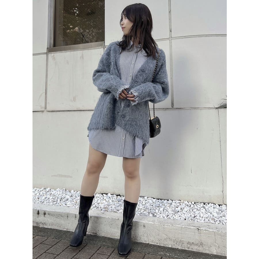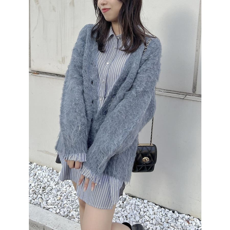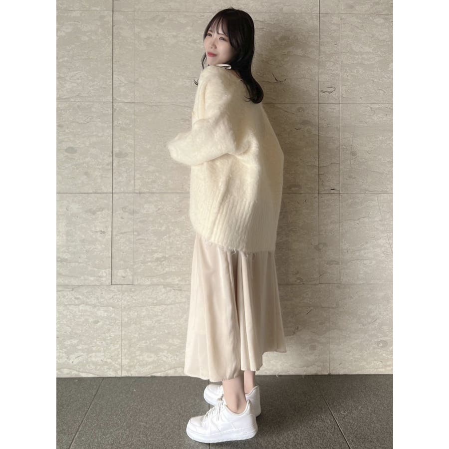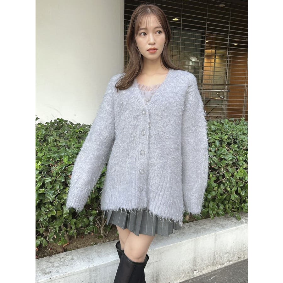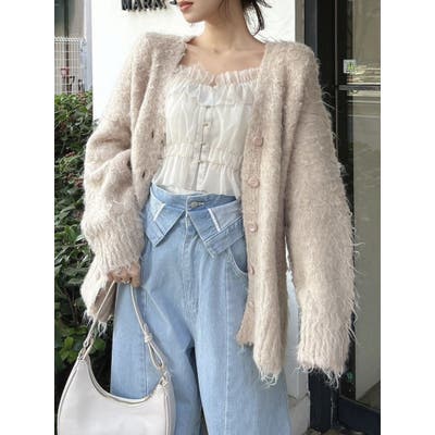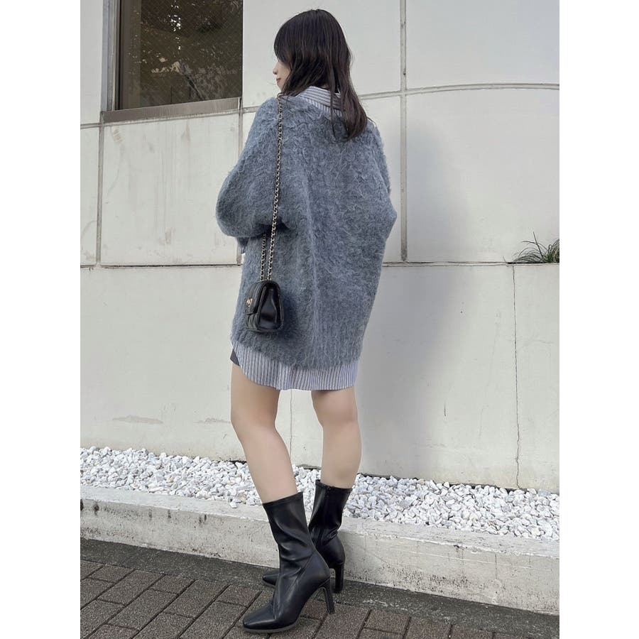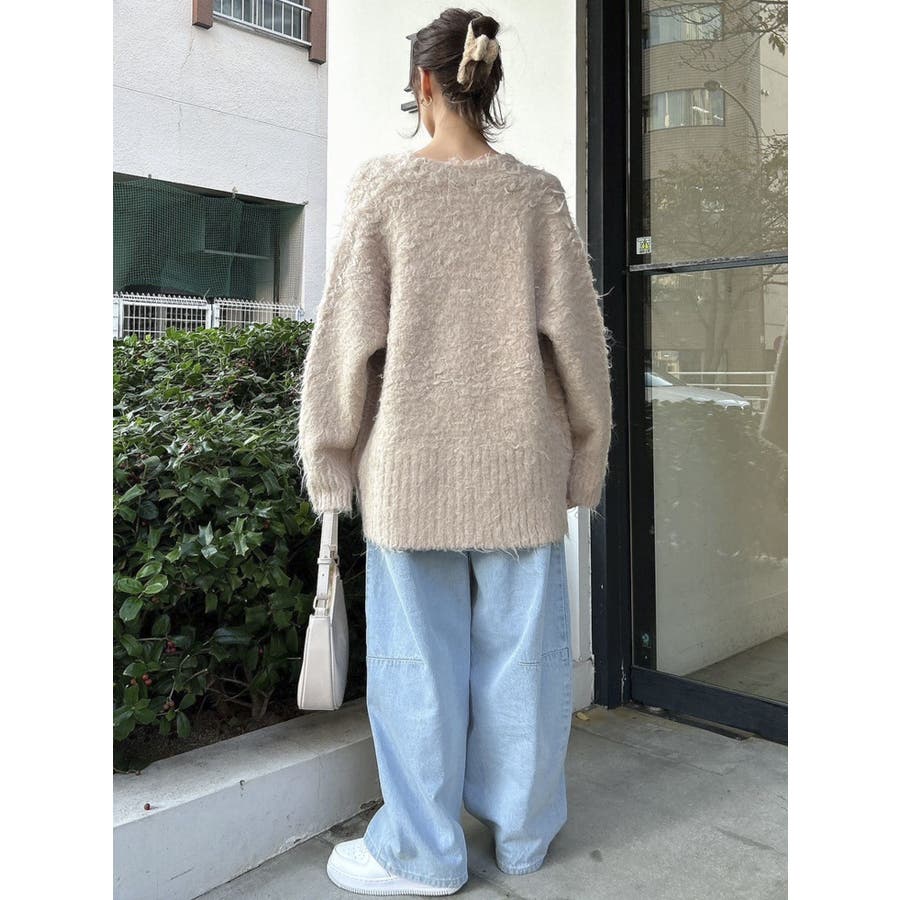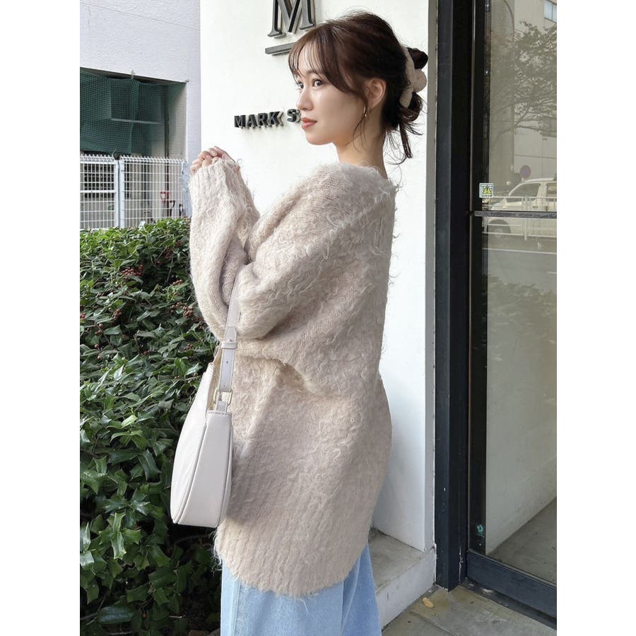毛足が長くボリューム感がありながら、Vネックなので首回りはすっきりとしたシルエットに。袖のボリューム感は女性らしい印象を醸してプルオーバーや薄手のニットの上にも羽織れます。ヒップが隠れるくらいになるので温かさも担保してくれます。 【スタイリング】タイトシルエットのトップスに合わせて着たり、スウェットの上に羽織ったりと幅広く楽しめます。パンツを合わせたカジュアルスタイルやレースボトムなどを合わせてフェミニンさのあるスタイリングも。
