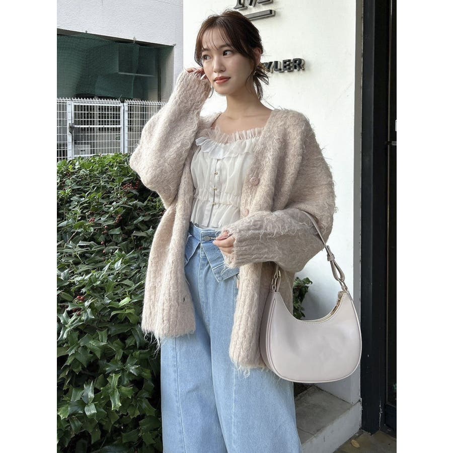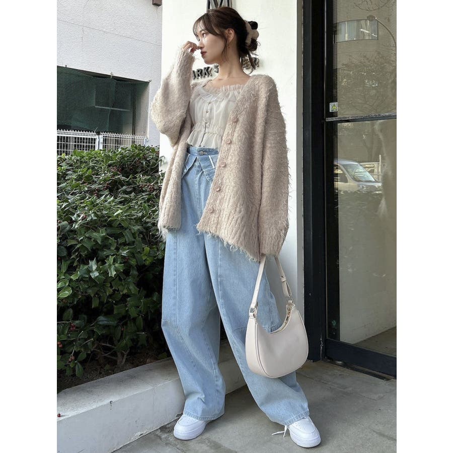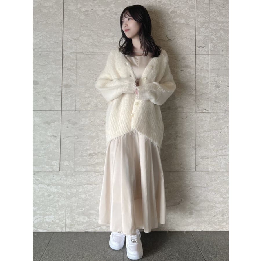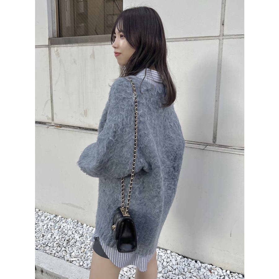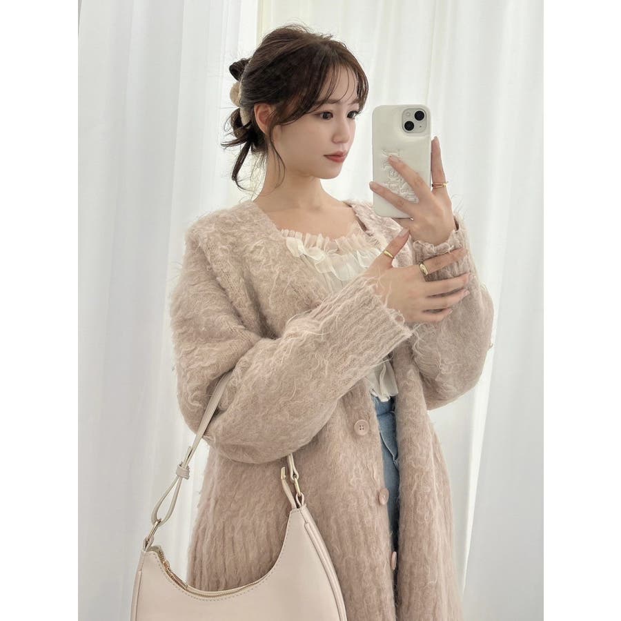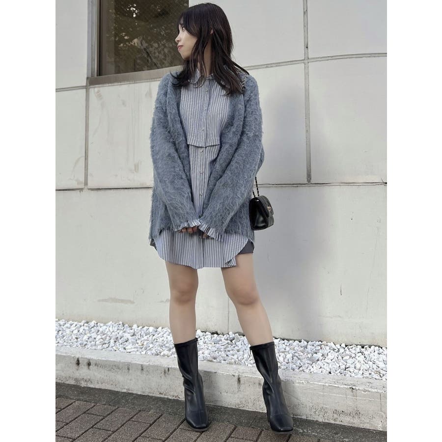 毛足が長くボリューム感がありながら、Vネックなので首回りはすっきりとしたシルエットに。袖のボリューム感は女性らしい印象を醸してプルオーバーや薄手のニットの上にも羽織れます。ヒップが隠れるくらいになるので温かさも担保してくれます。 【スタイリング】タイトシルエットのトップスに合わせて着たり、スウェットの上に羽織ったりと幅広く楽しめます。パンツを合わせたカジュアルスタイルやレースボトムなどを合わせてフェミニンさのあるスタイリングも。