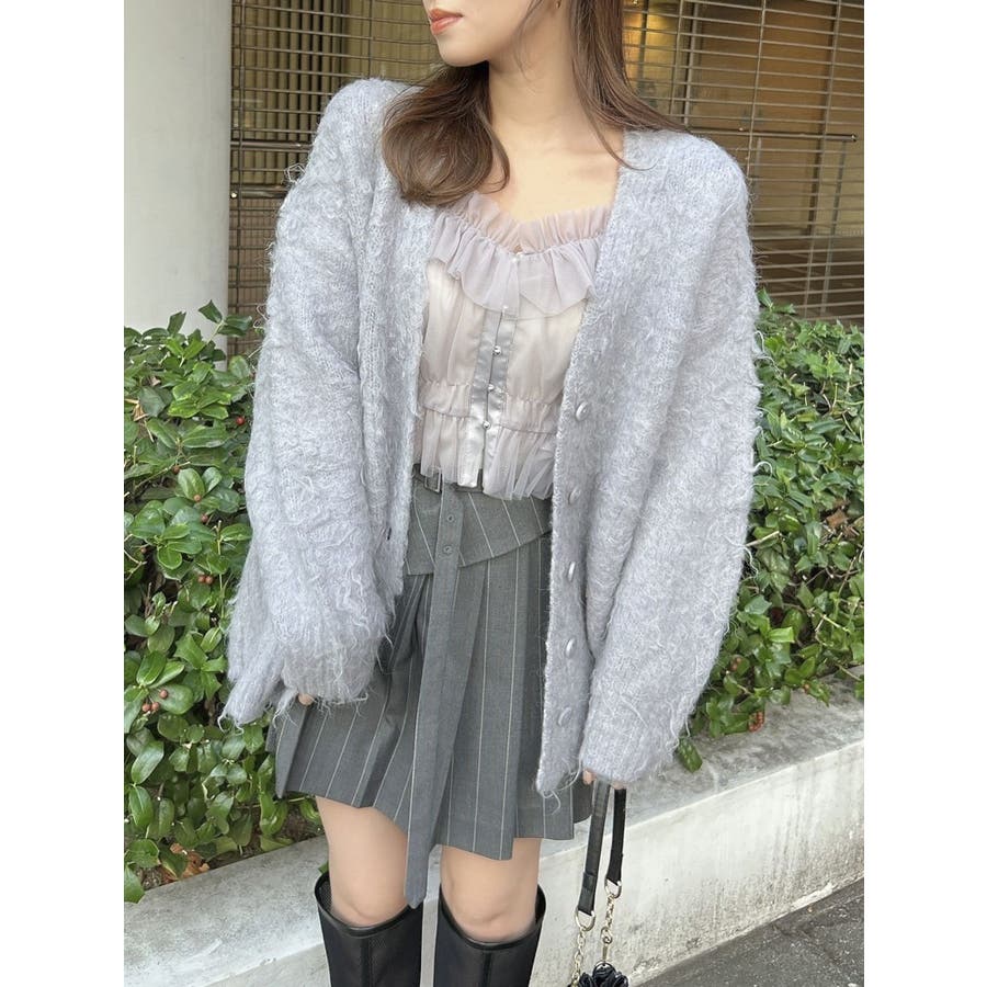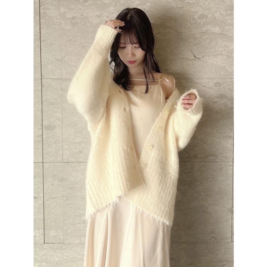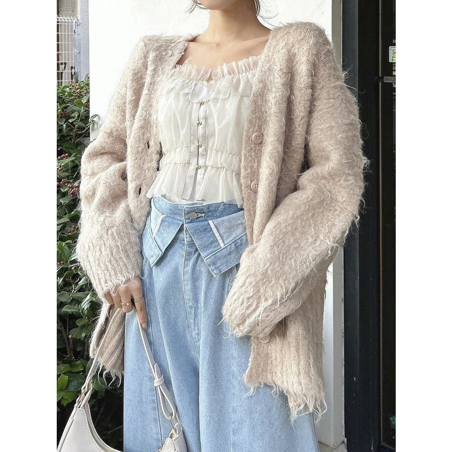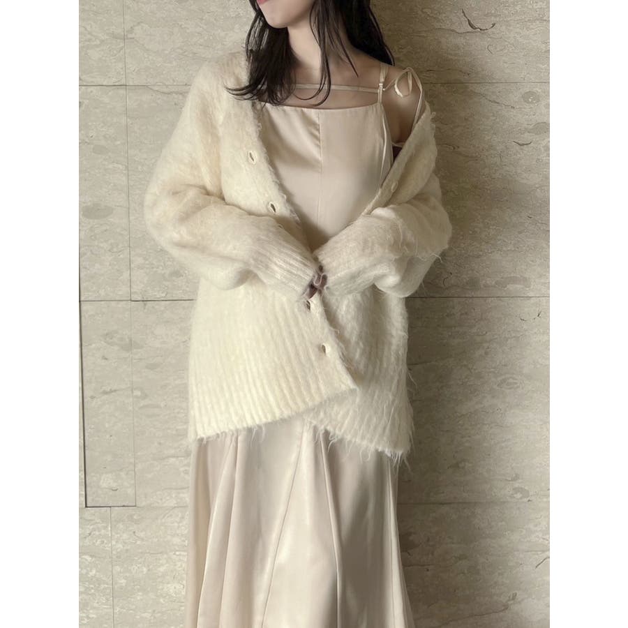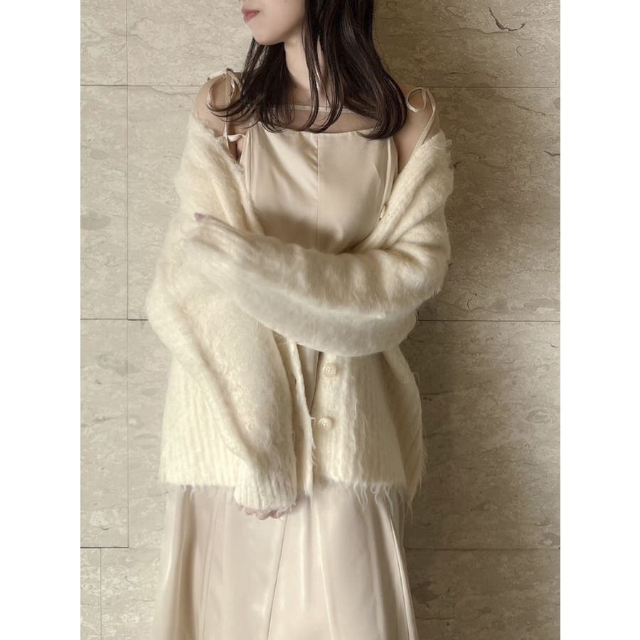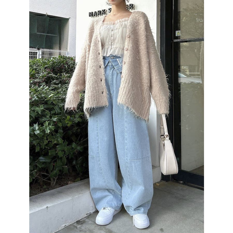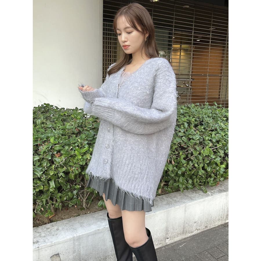 毛足が長くボリューム感がありながら、Vネックなので首回りはすっきりとしたシルエットに。袖のボリューム感は女性らしい印象を醸してプルオーバーや薄手のニットの上にも羽織れます。ヒップが隠れるくらいになるので温かさも担保してくれます。 【スタイリング】タイトシルエットのトップスに合わせて着たり、スウェットの上に羽織ったりと幅広く楽しめます。パンツを合わせたカジュアルスタイルやレースボトムなどを合わせてフェミニンさのあるスタイリングも。
