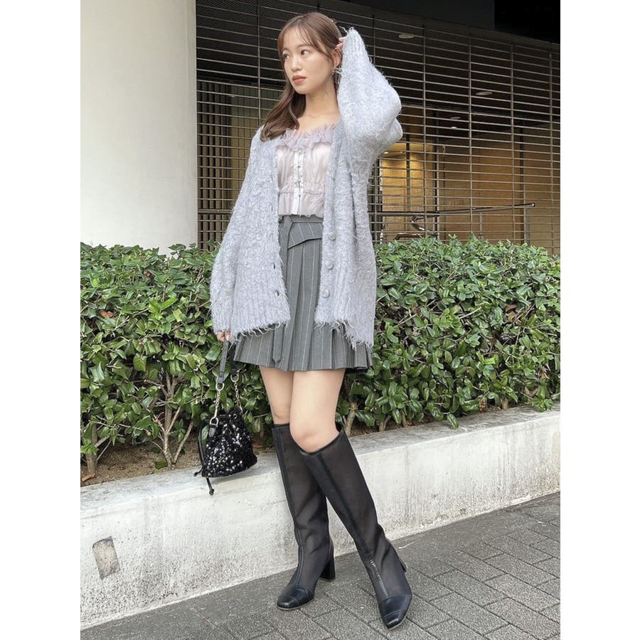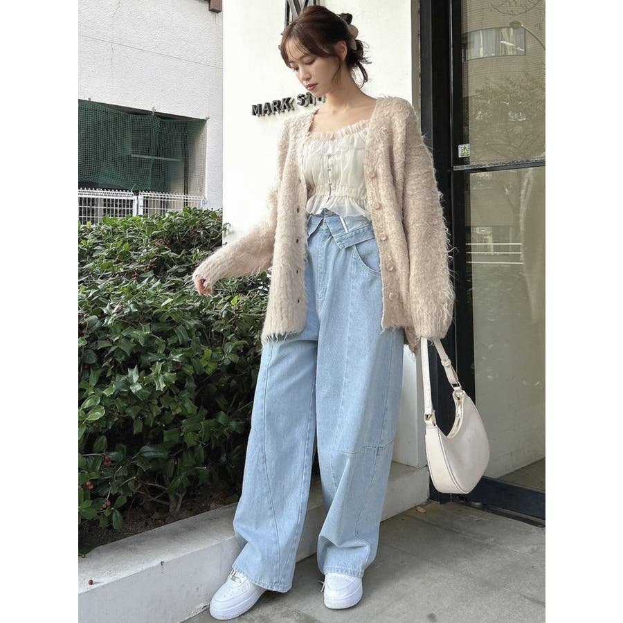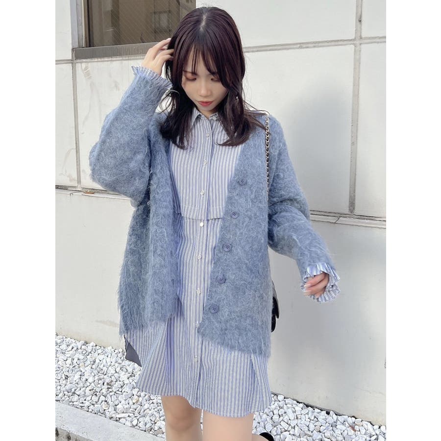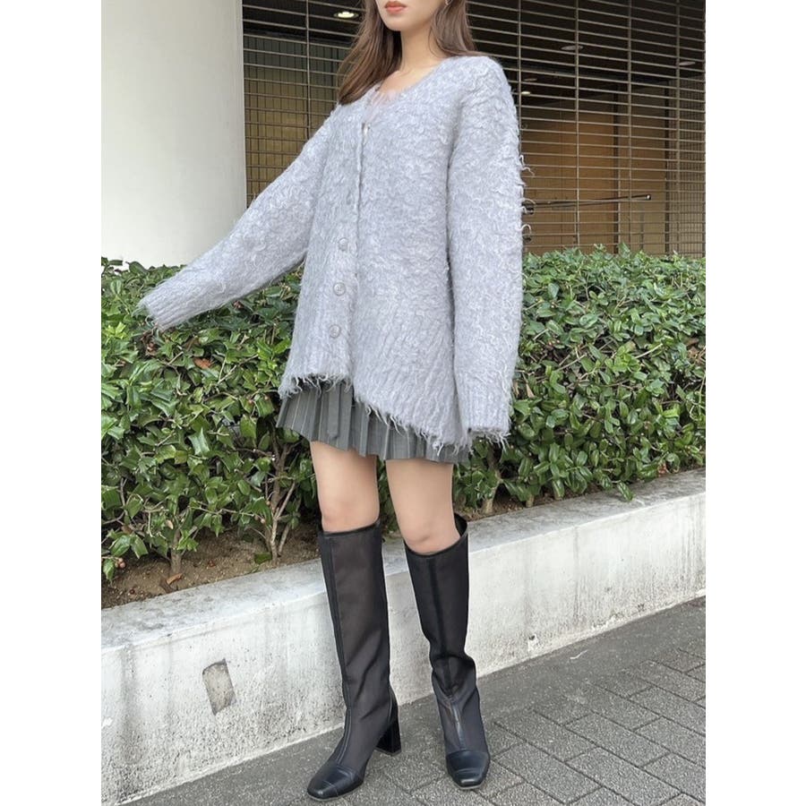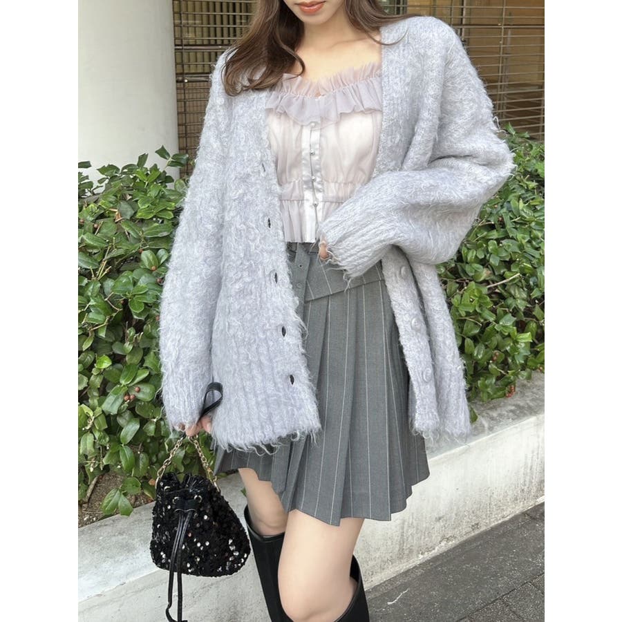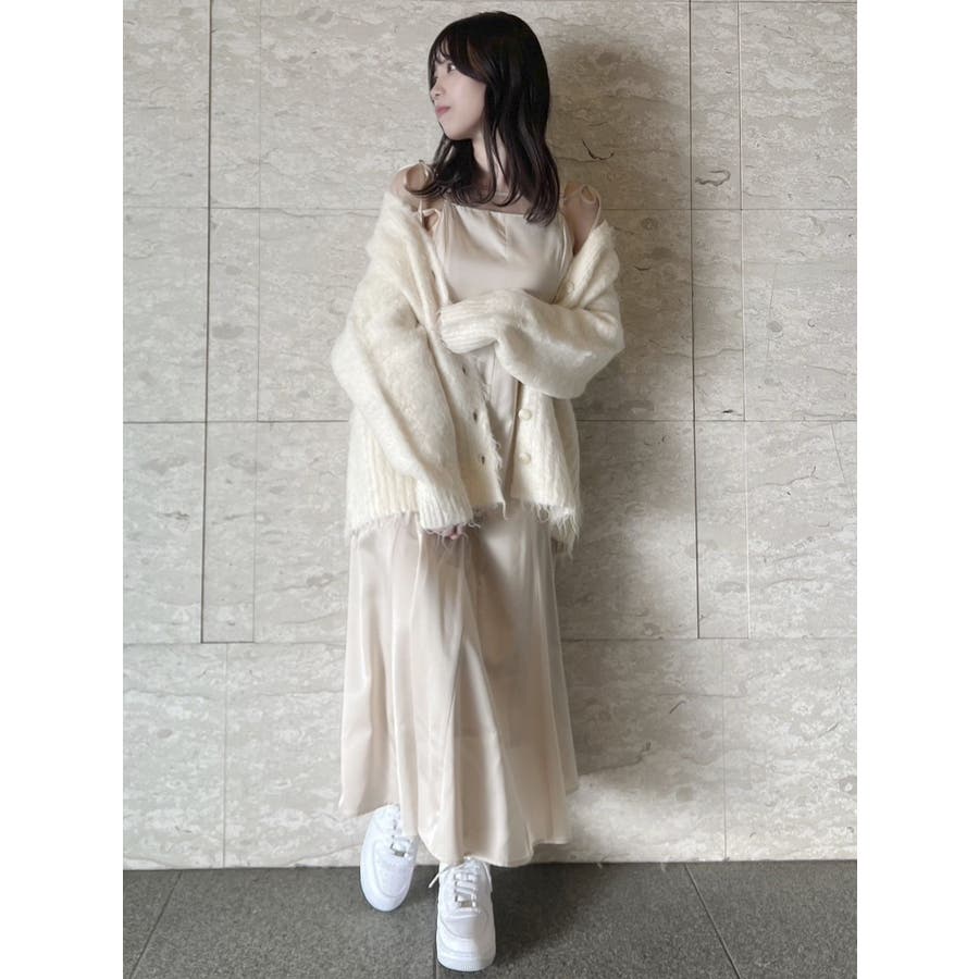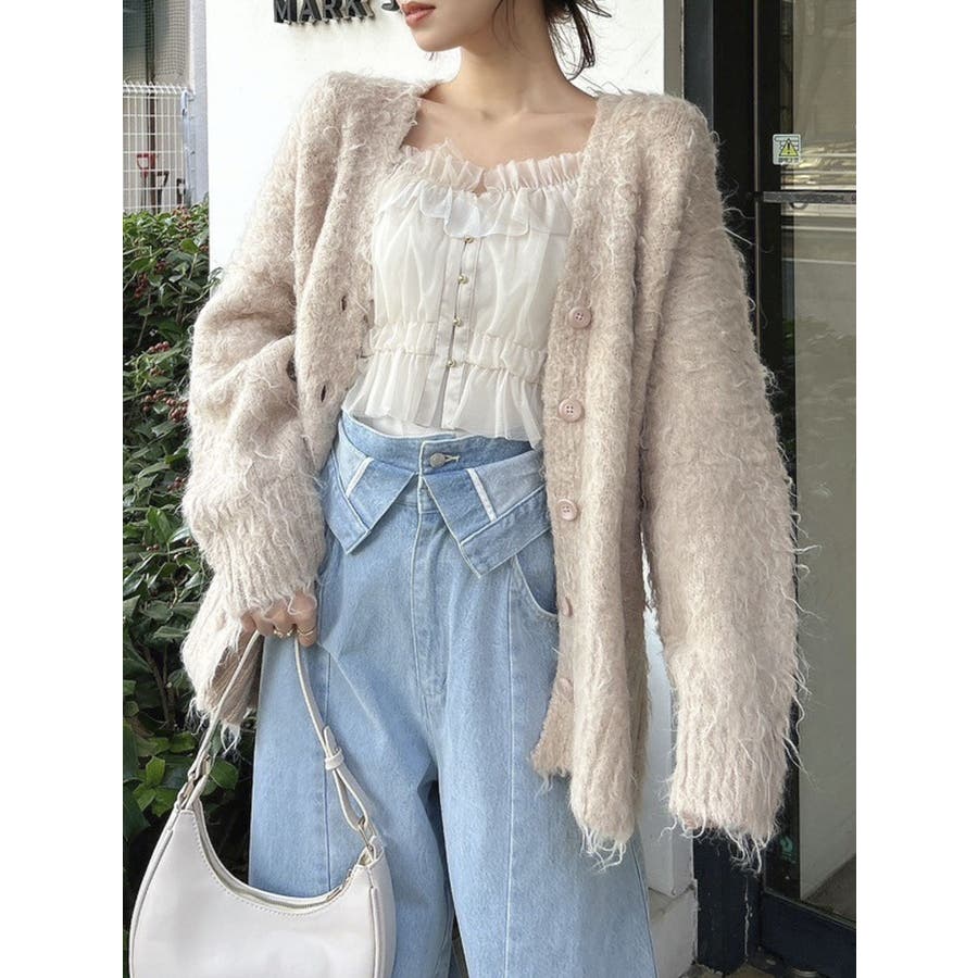 毛足が長くボリューム感がありながら、Vネックなので首回りはすっきりとしたシルエットに。袖のボリューム感は女性らしい印象を醸してプルオーバーや薄手のニットの上にも羽織れます。ヒップが隠れるくらいになるので温かさも担保してくれます。 【スタイリング】タイトシルエットのトップスに合わせて着たり、スウェットの上に羽織ったりと幅広く楽しめます。パンツを合わせたカジュアルスタイルやレースボトムなどを合わせてフェミニンさのあるスタイリングも。