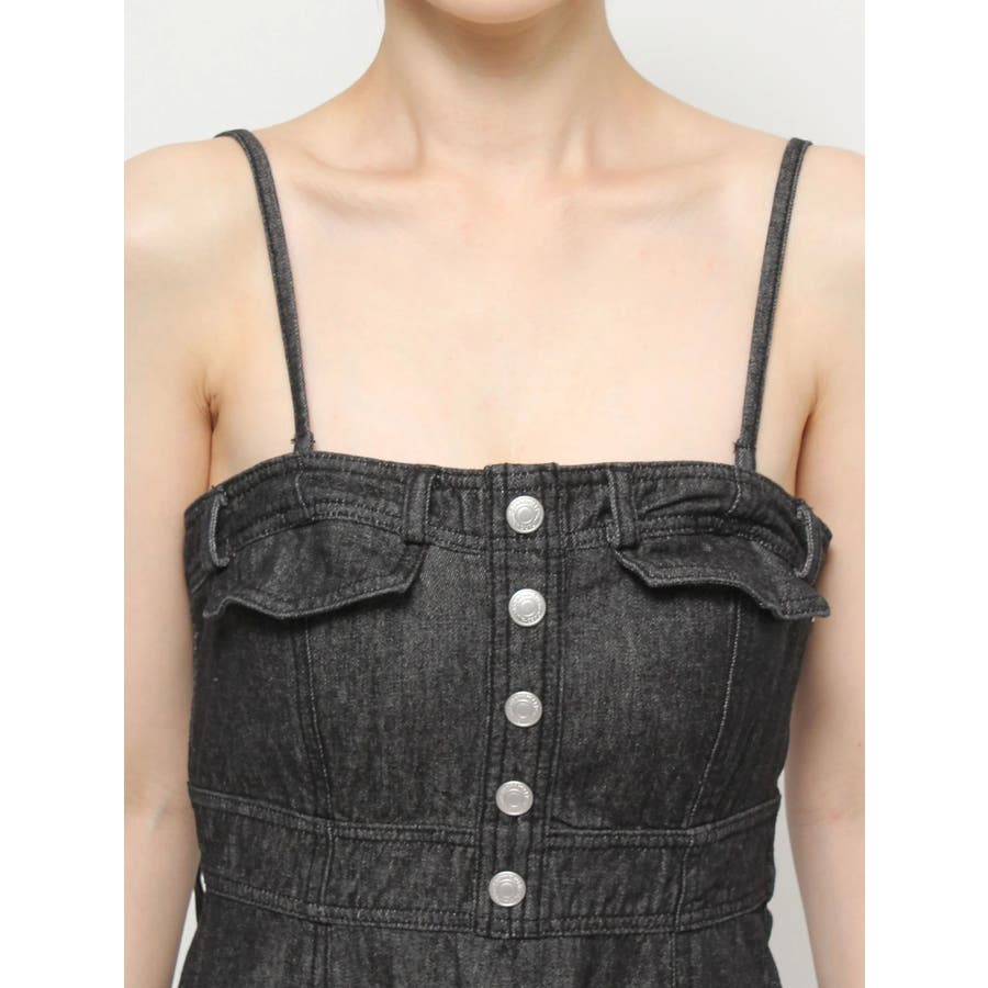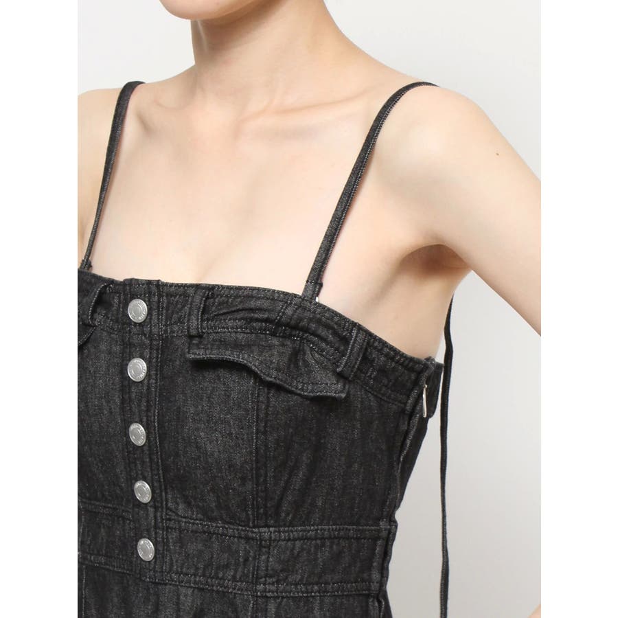 デニムパンツの様なフロントボタンが印象的なデザインです。胸元をコルセットの様に引き閉めて身幅をコンパクトにSETします。綿タイプの素材を使ってナチュラルさを演出。キャミストラップなどは細めに仕上げておりレディライクなディテールに注目。【スタイリング】ロンTとのコーデで抜け感あるスタイリングがお勧めです。シアーのカットソーを合わせてキレイ目に着る事も可能です。