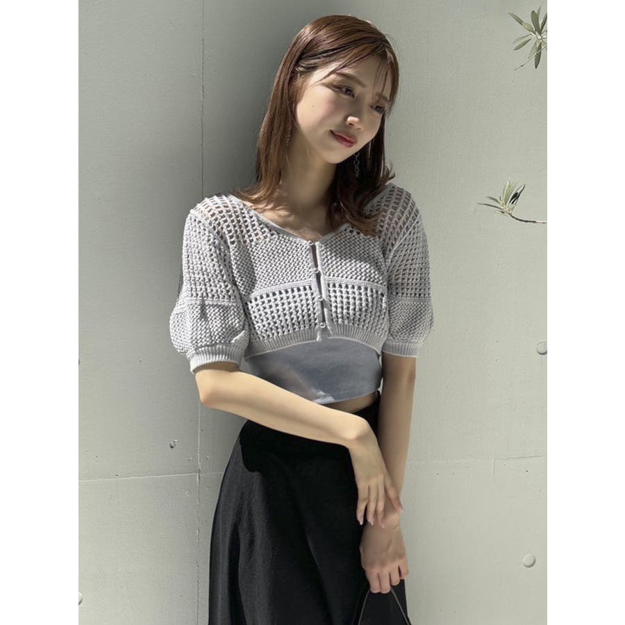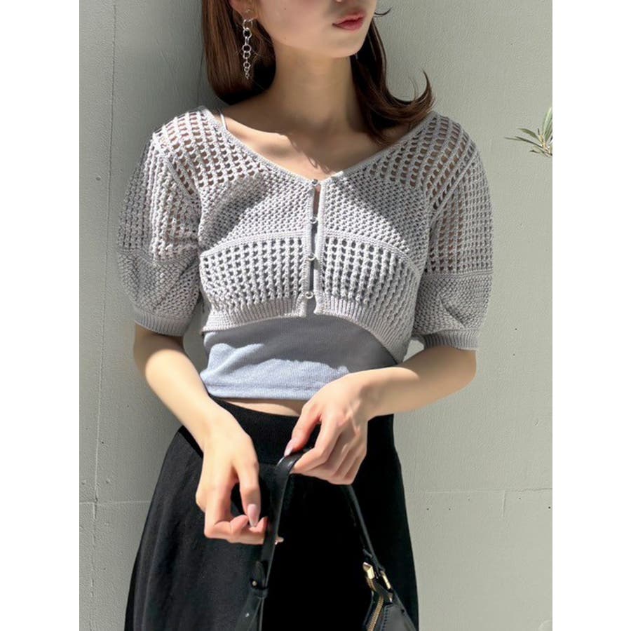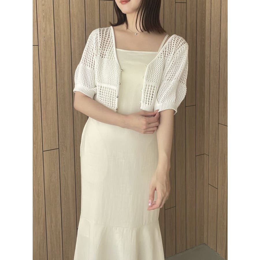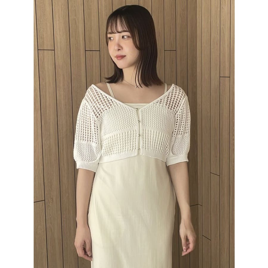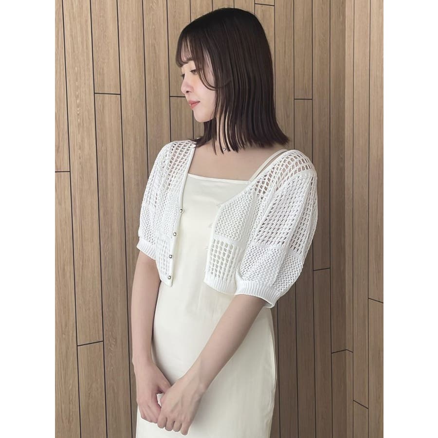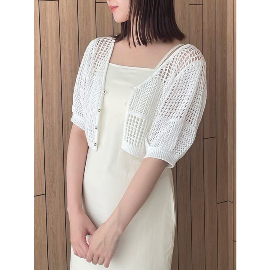 フロントのボタンがアクセントの透かし編みカーディガン。部分的に異なる編地を使用しており、着回しやすくも特別感のある1枚に。コンパクトな丈感が足長効果を発揮します。ボタンを閉じてトップス風にも着用可能です。 【スタイリング】キャミワンピースやデザインキャミソールと合わせると、程よい肌見せで涼しげな印象に。トレンドのデニムとも相性が良く、カジュアルなアイテムとの合わせもお楽しみいただけます。