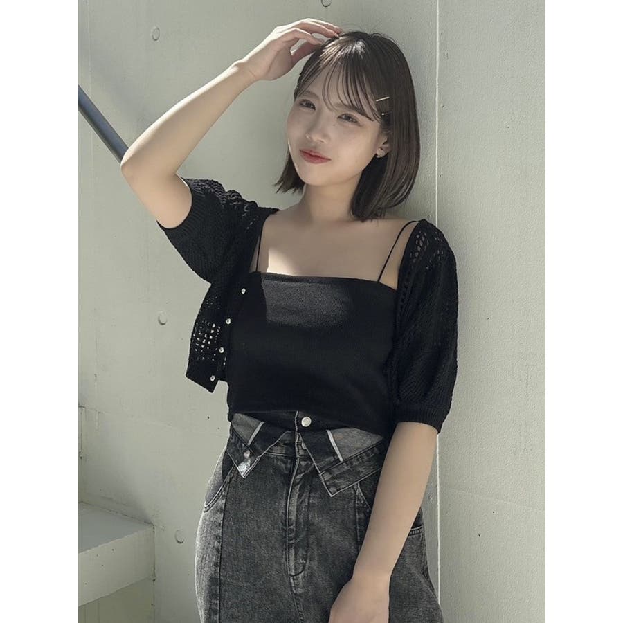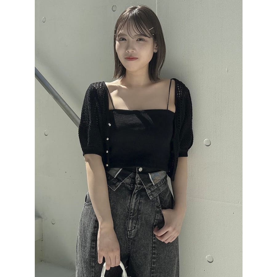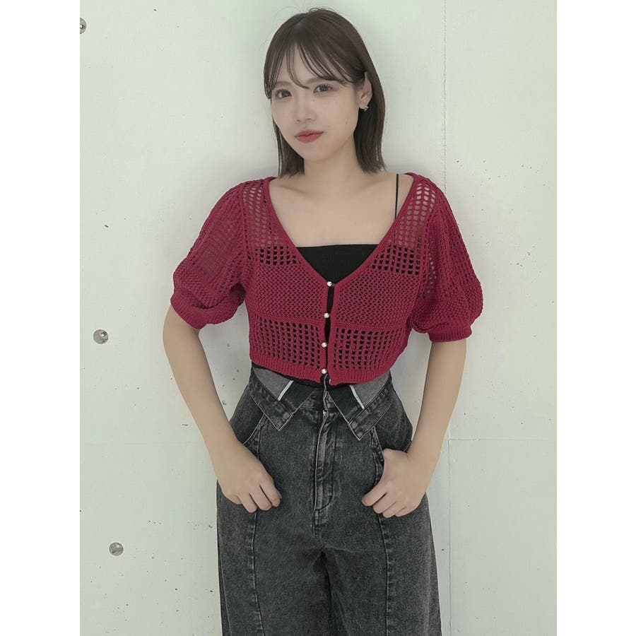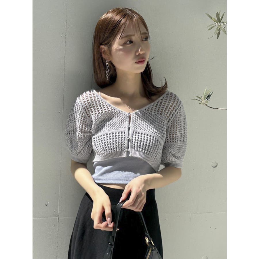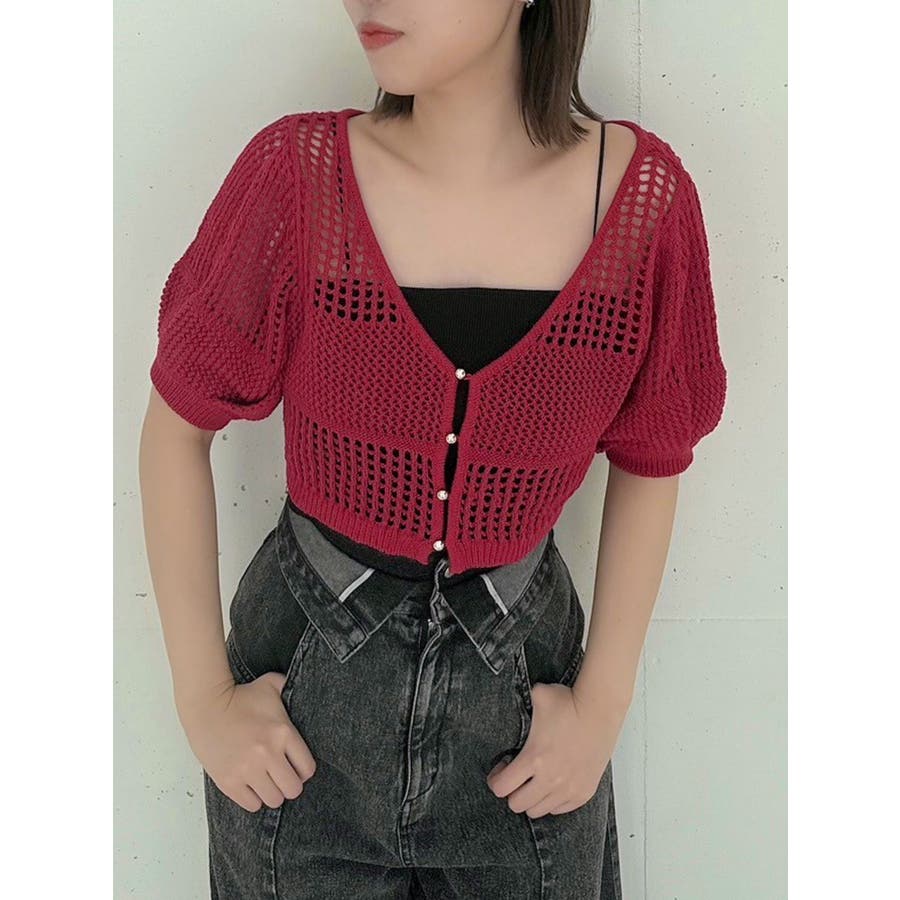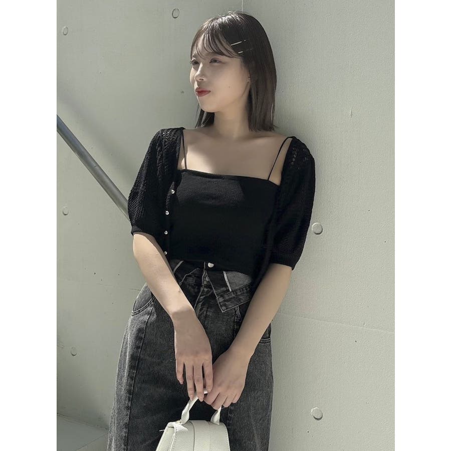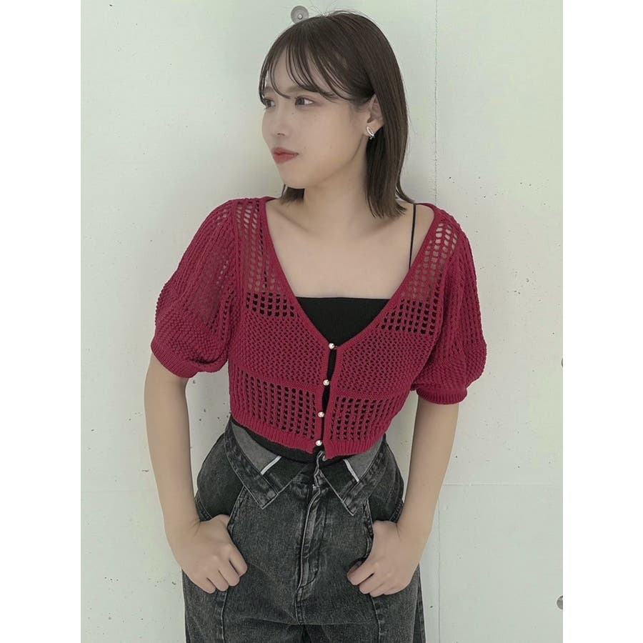 フロントのボタンがアクセントの透かし編みカーディガン。部分的に異なる編地を使用しており、着回しやすくも特別感のある1枚に。コンパクトな丈感が足長効果を発揮します。ボタンを閉じてトップス風にも着用可能です。 【スタイリング】キャミワンピースやデザインキャミソールと合わせると、程よい肌見せで涼しげな印象に。トレンドのデニムとも相性が良く、カジュアルなアイテムとの合わせもお楽しみいただけます。