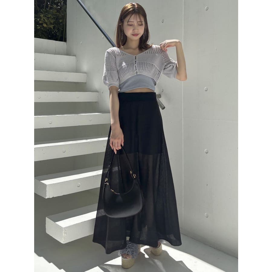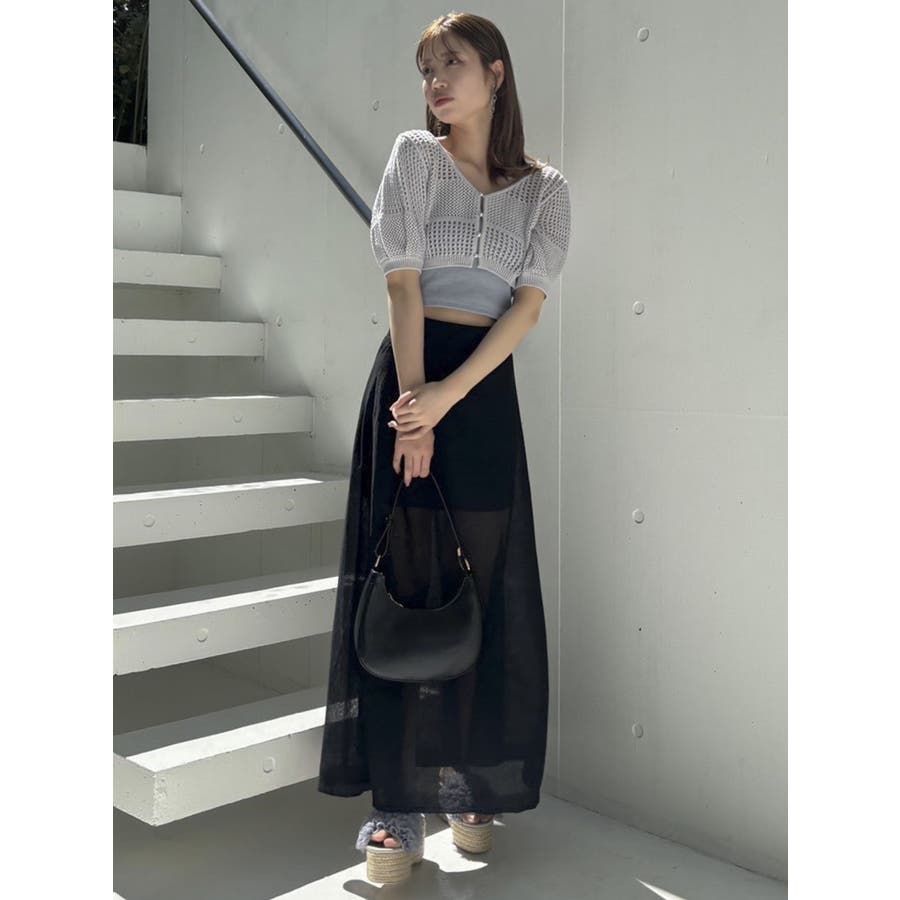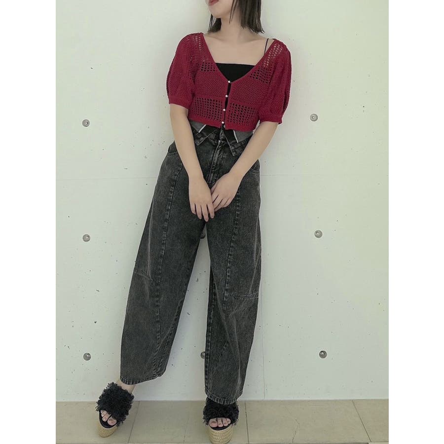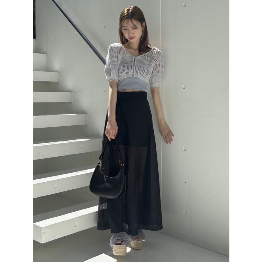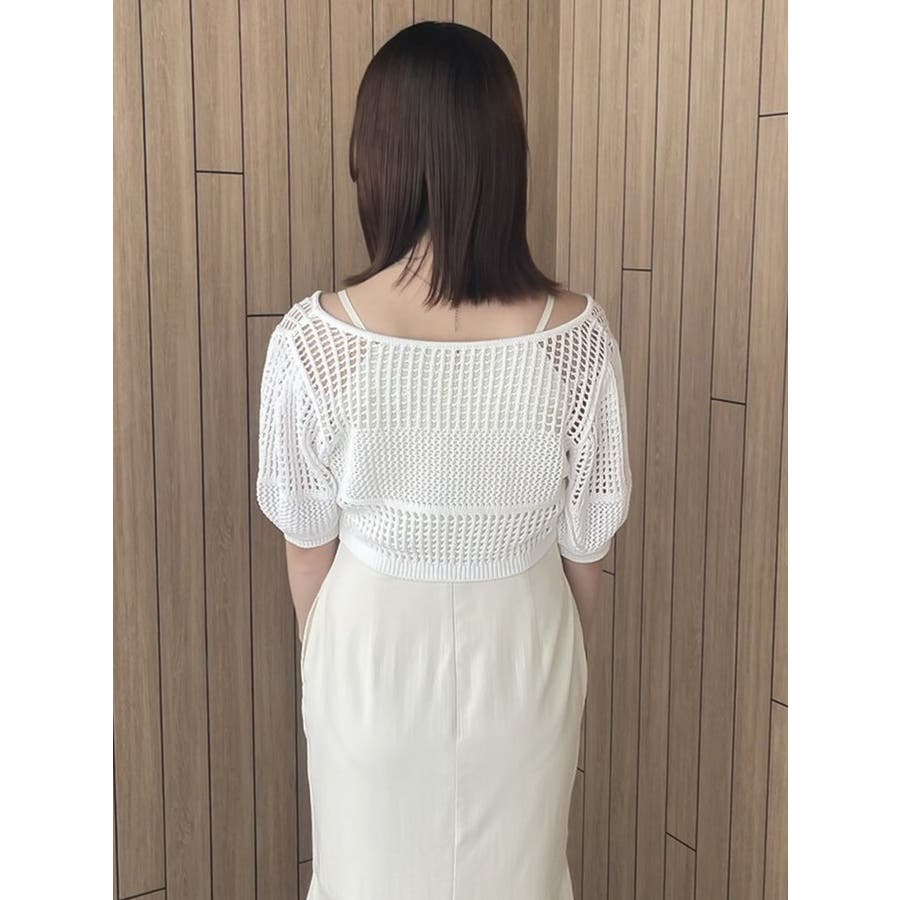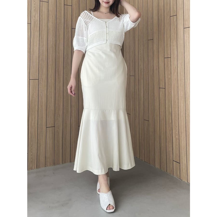 フロントのボタンがアクセントの透かし編みカーディガン。部分的に異なる編地を使用しており、着回しやすくも特別感のある1枚に。コンパクトな丈感が足長効果を発揮します。ボタンを閉じてトップス風にも着用可能です。 【スタイリング】キャミワンピースやデザインキャミソールと合わせると、程よい肌見せで涼しげな印象に。トレンドのデニムとも相性が良く、カジュアルなアイテムとの合わせもお楽しみいただけます。