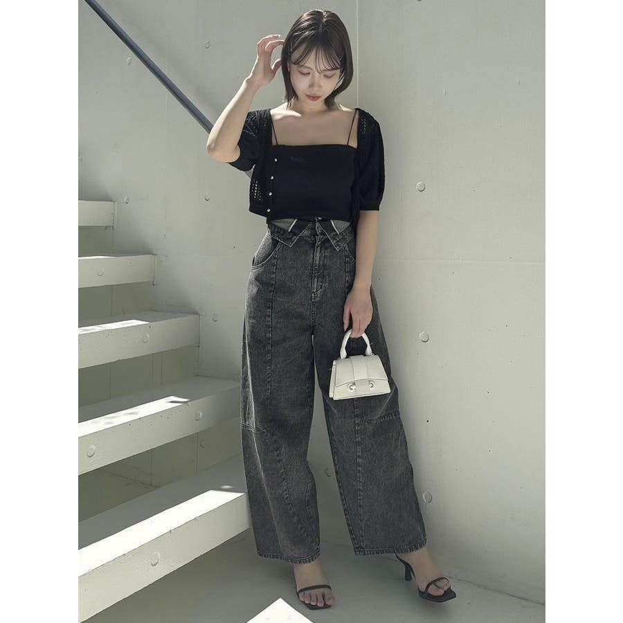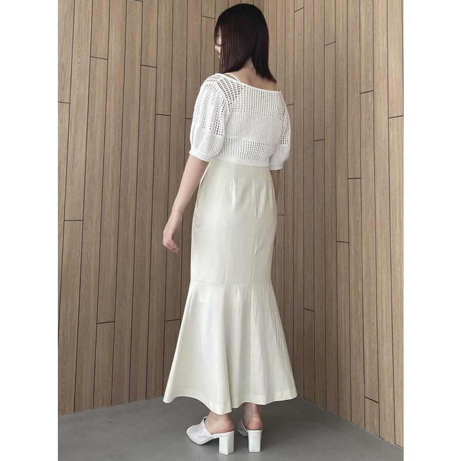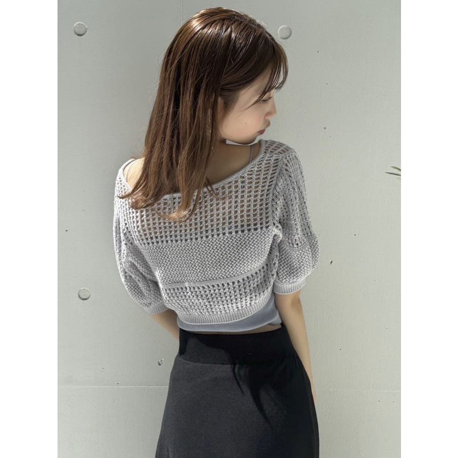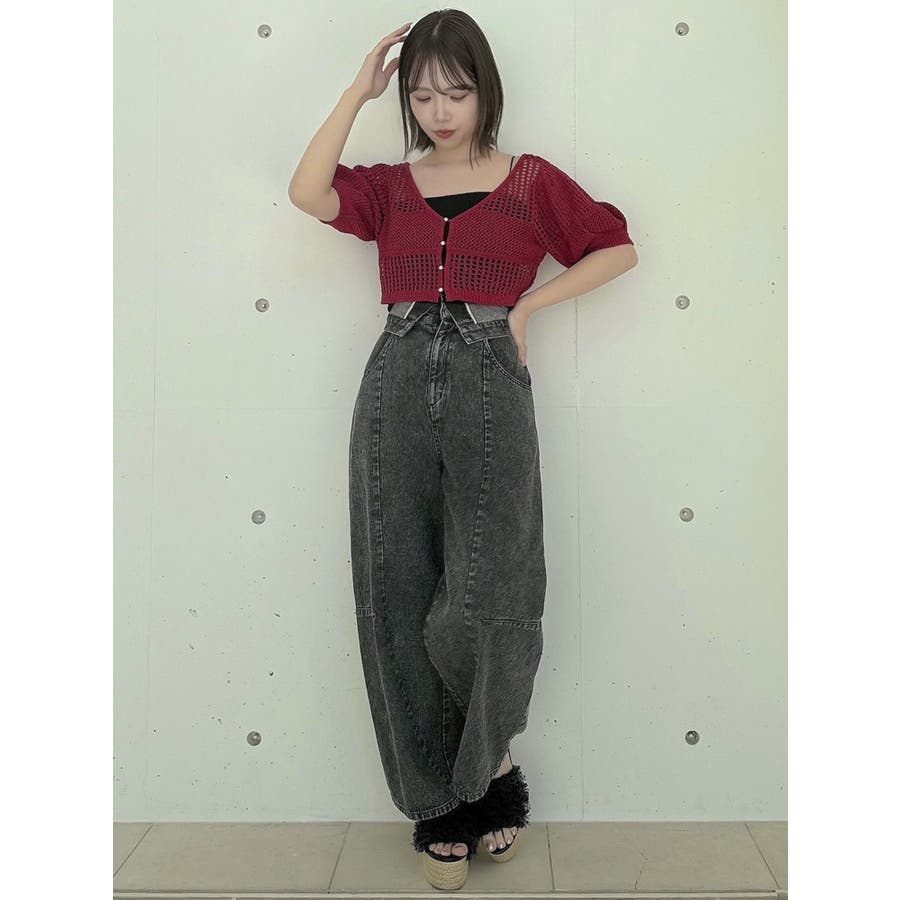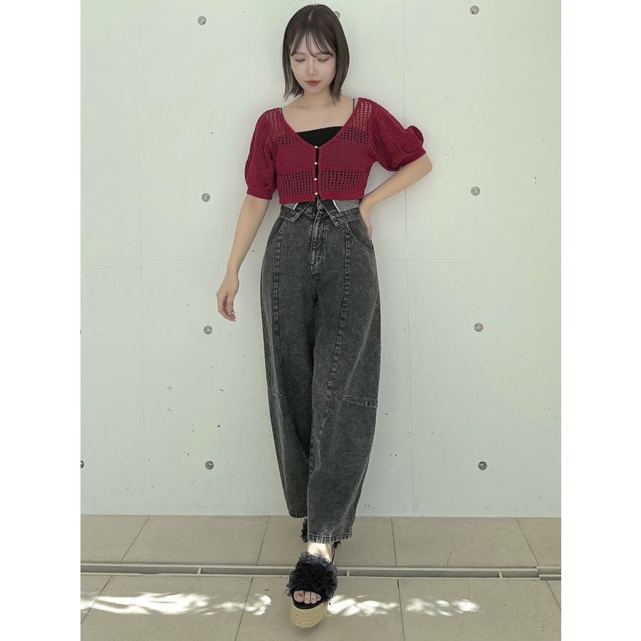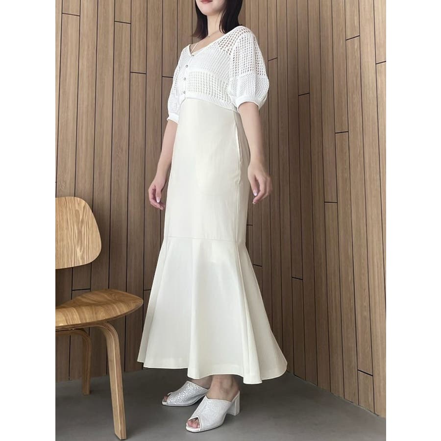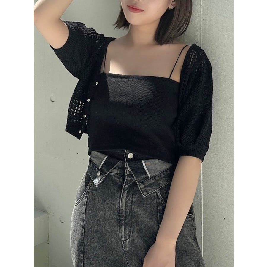 フロントのボタンがアクセントの透かし編みカーディガン。部分的に異なる編地を使用しており、着回しやすくも特別感のある1枚に。コンパクトな丈感が足長効果を発揮します。ボタンを閉じてトップス風にも着用可能です。 【スタイリング】キャミワンピースやデザインキャミソールと合わせると、程よい肌見せで涼しげな印象に。トレンドのデニムとも相性が良く、カジュアルなアイテムとの合わせもお楽しみいただけます。