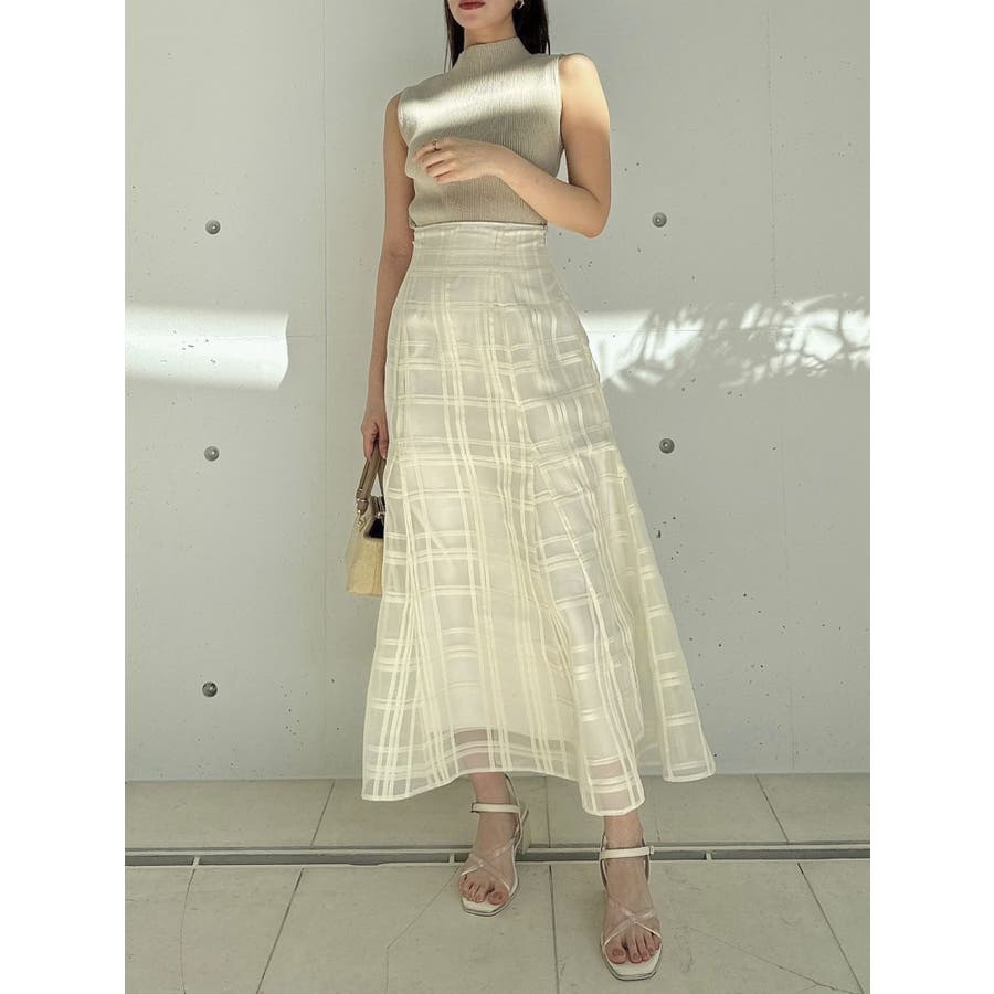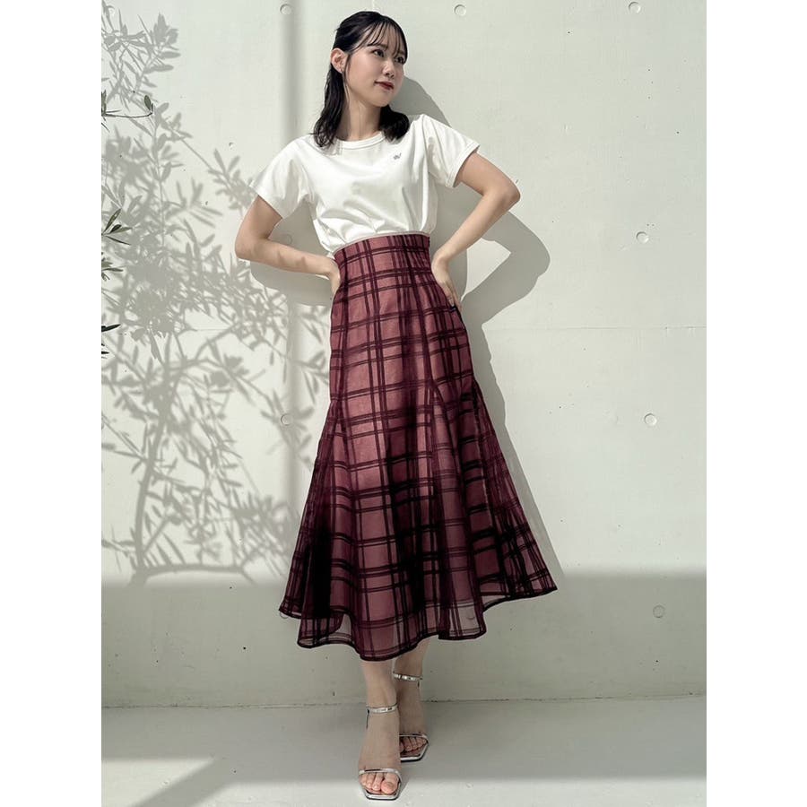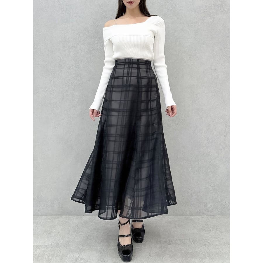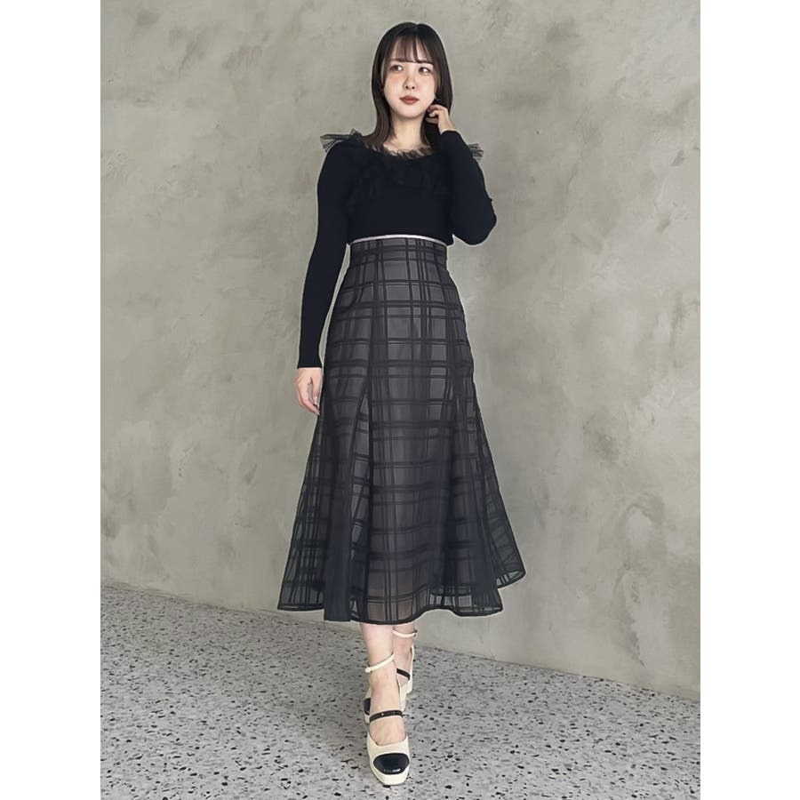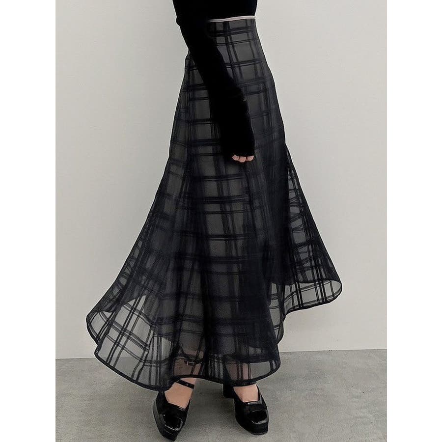 大胆なシアーチェック柄が印象的で存在感を発揮するスカート。計算尽くしたこだわりの切り替えラインでスタイルアップが叶います。厚手のニットやアウターを合わせても程よい透け感で重くなりづらく、コーデを軽やかに彩ります。【スタイリング】きれいめなハイゲージニットやミニシャギー系ニットと合わせたエレガントなスタイリングがおすすめ。足元はブーツやパンプスを合わせて上品な合わせがかわいいです。