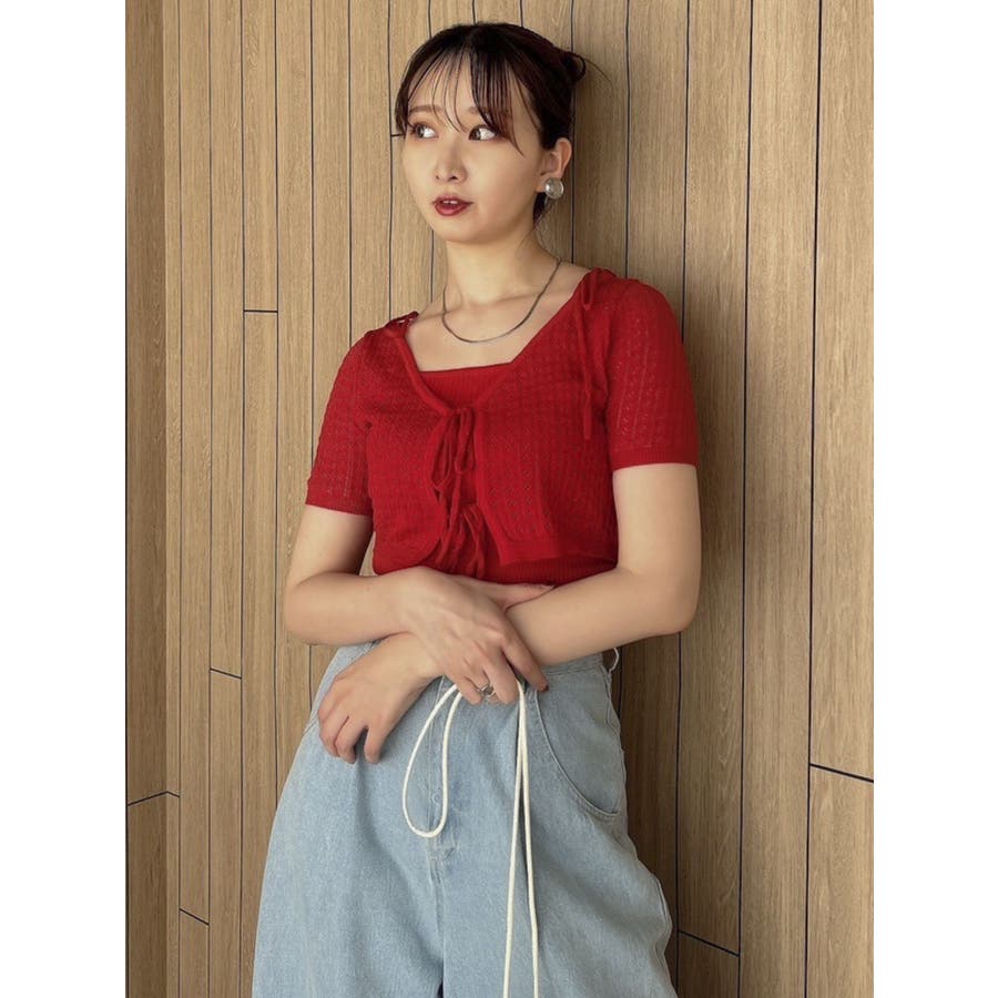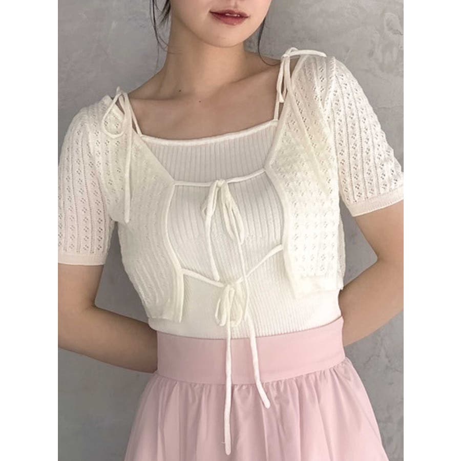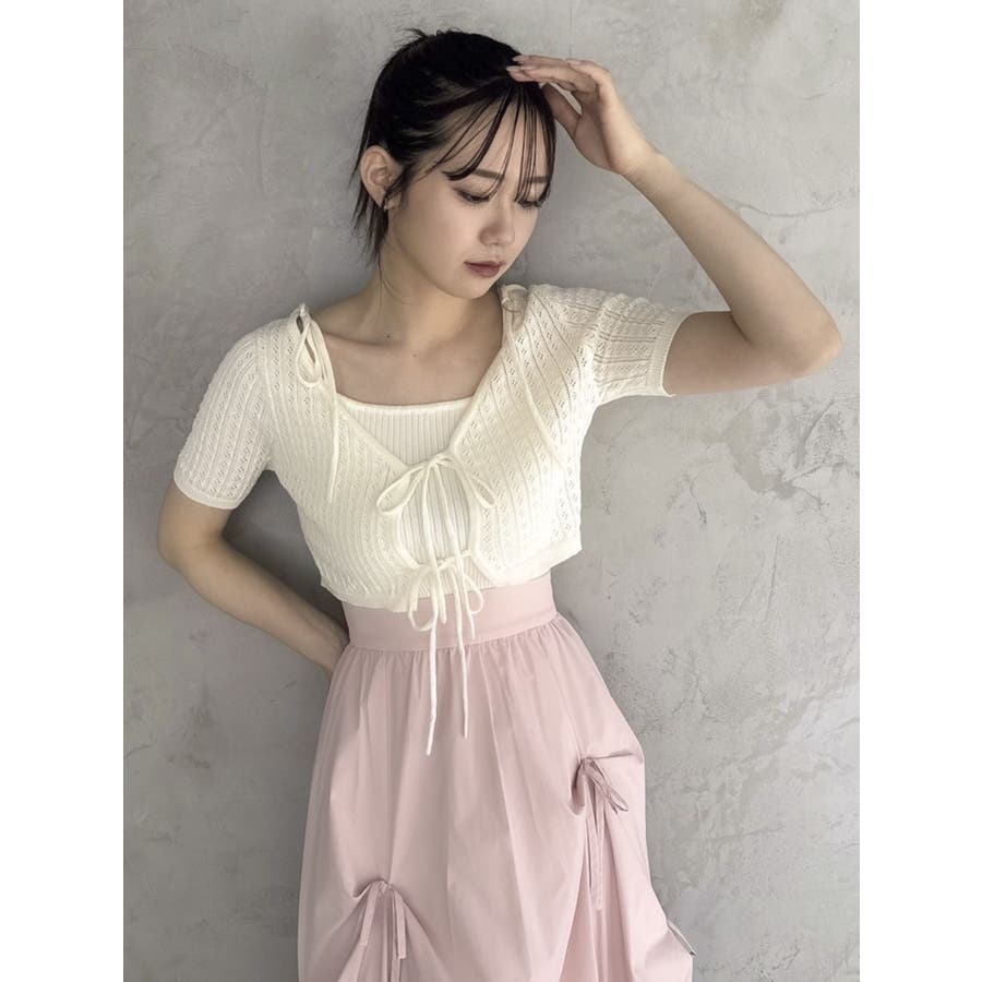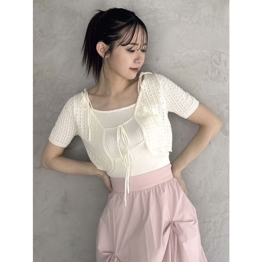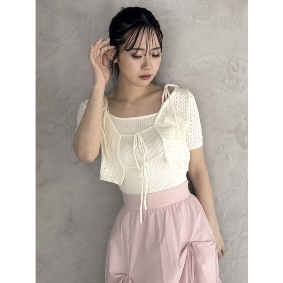 トレンドのフロントリボンがポイントの透かし編みカーディガンと、ショルダーリボンのニットキャミソールのお得なセット。カーディガンは透かし柄になっておりレイヤードしても軽やかに。それぞれ単品でも着用いただけるので着回し力抜群です。 【スタイリング】デニム合わせでリボンデザインをカジュアルMIXに着こなすスタイルがおすすめ。カーディガンはショート丈になっており、ワンピースに羽織るとスタイルアップ効果を高めます。