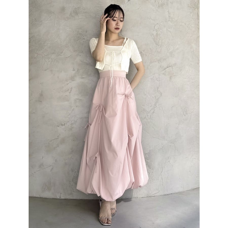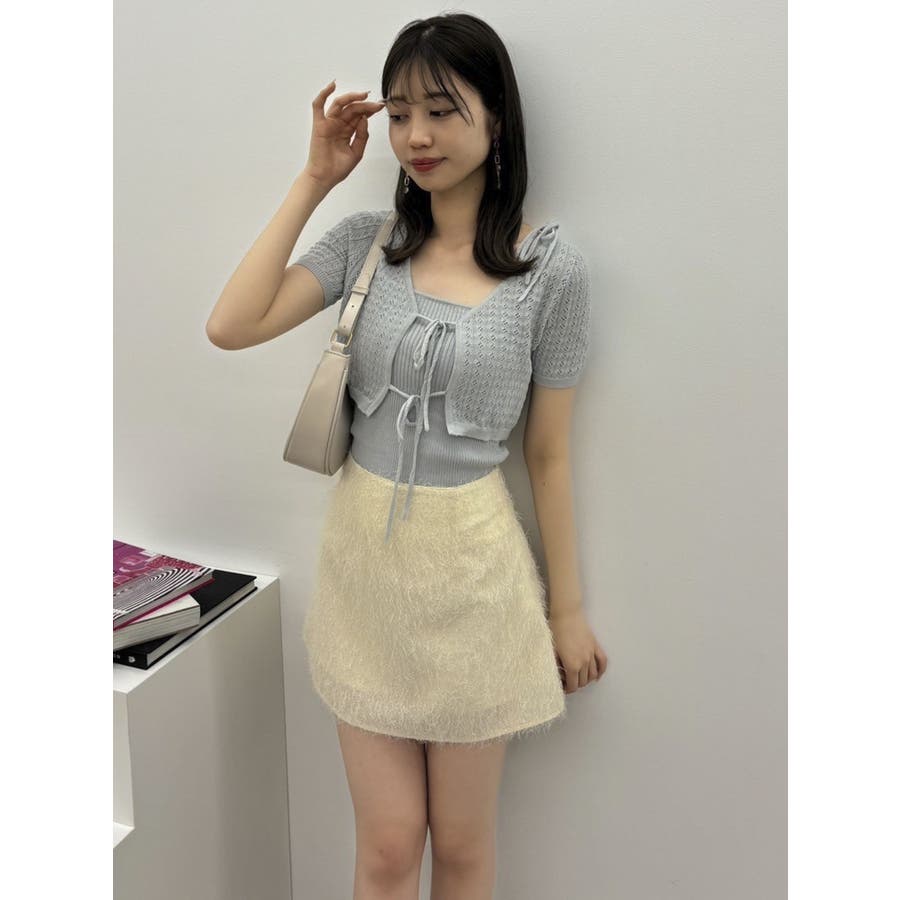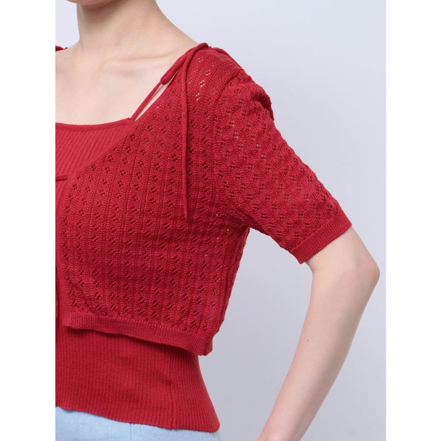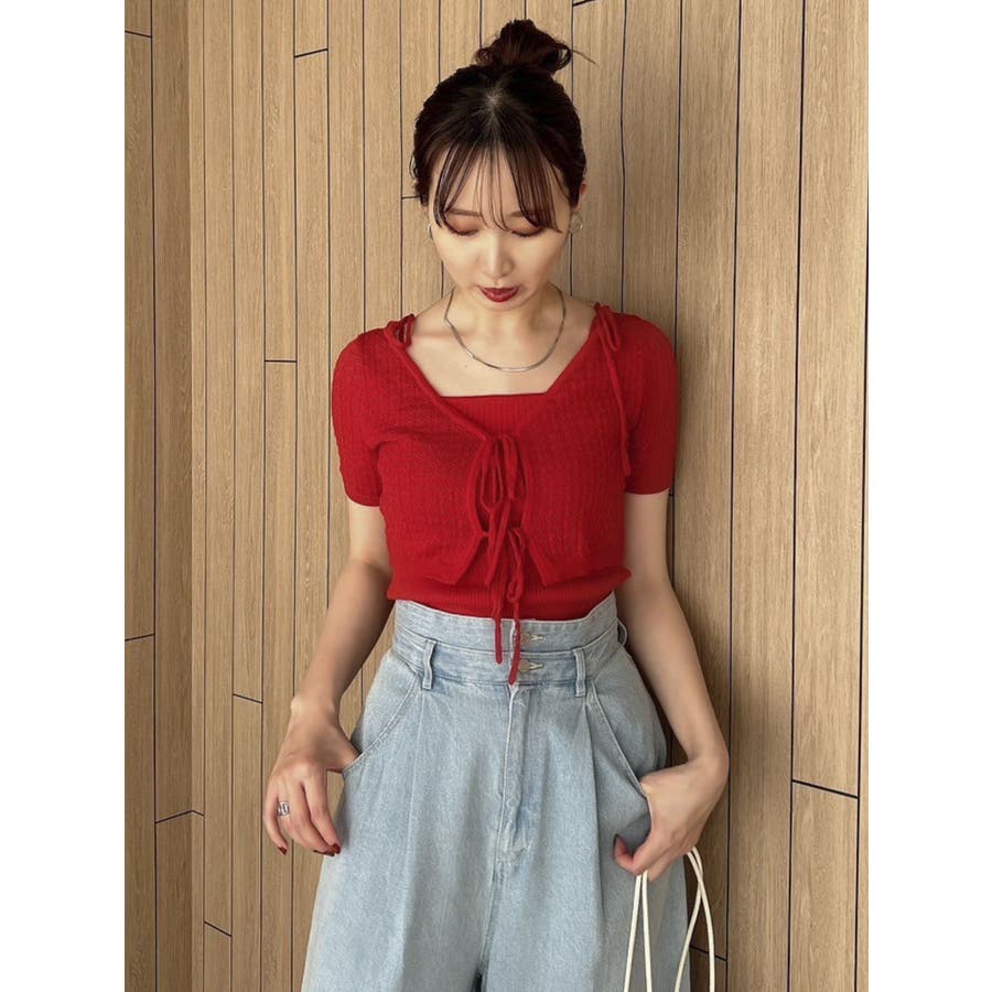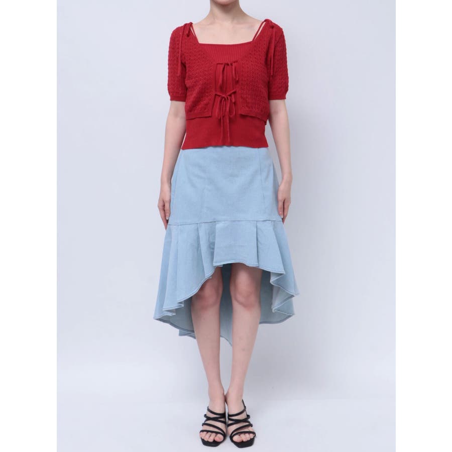 トレンドのフロントリボンがポイントの透かし編みカーディガンと、ショルダーリボンのニットキャミソールのお得なセット。カーディガンは透かし柄になっておりレイヤードしても軽やかに。それぞれ単品でも着用いただけるので着回し力抜群です。 【スタイリング】デニム合わせでリボンデザインをカジュアルMIXに着こなすスタイルがおすすめ。カーディガンはショート丈になっており、ワンピースに羽織るとスタイルアップ効果を高めます。