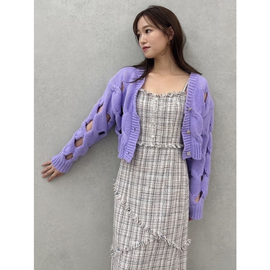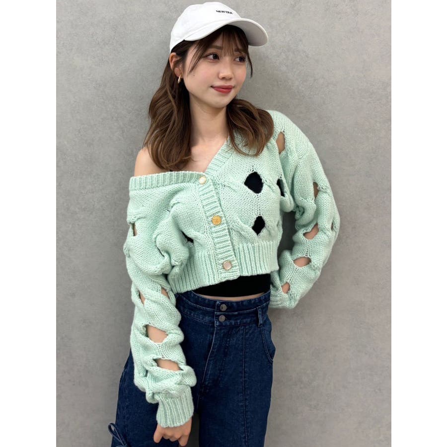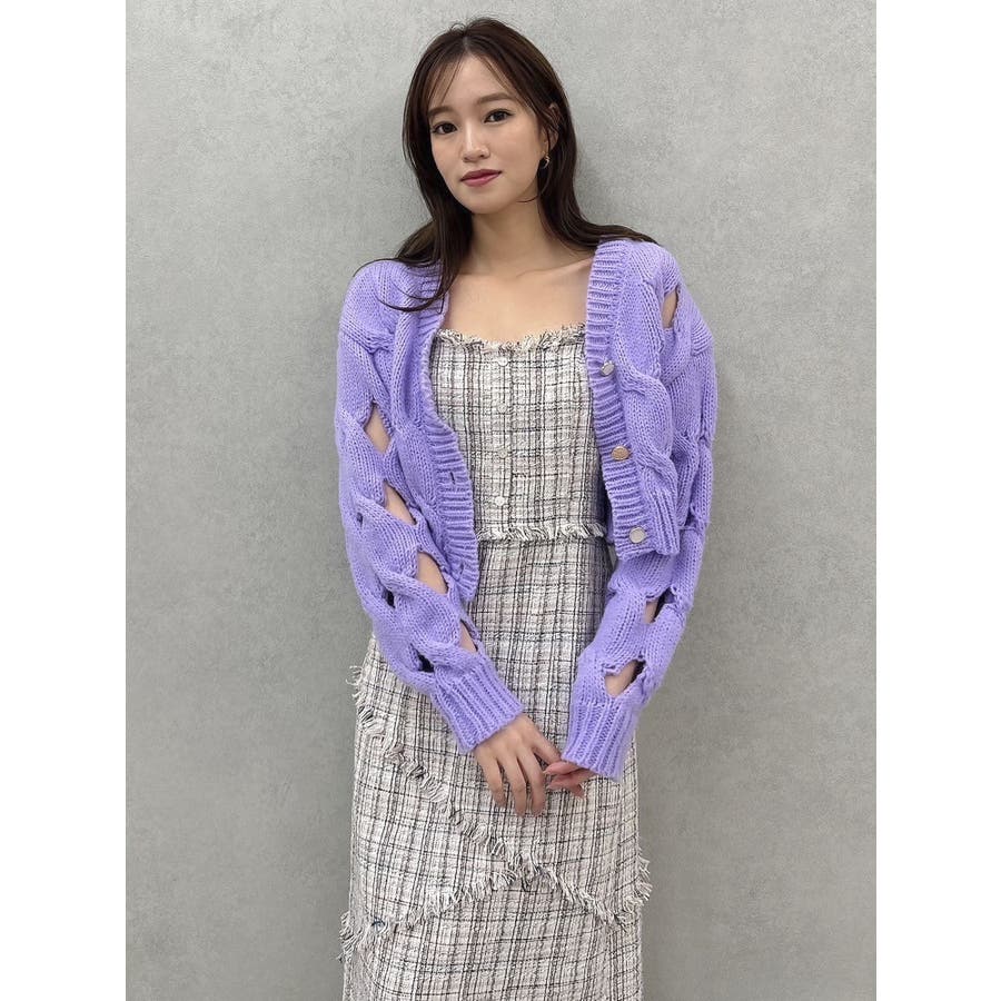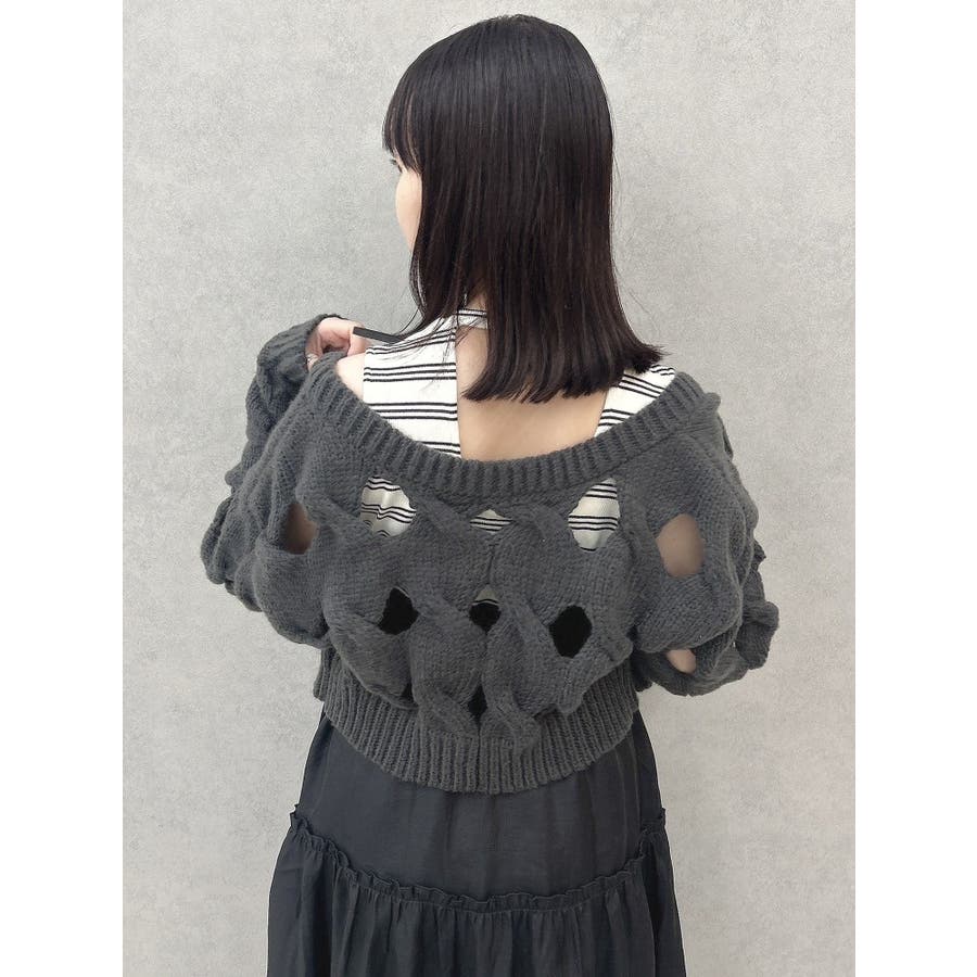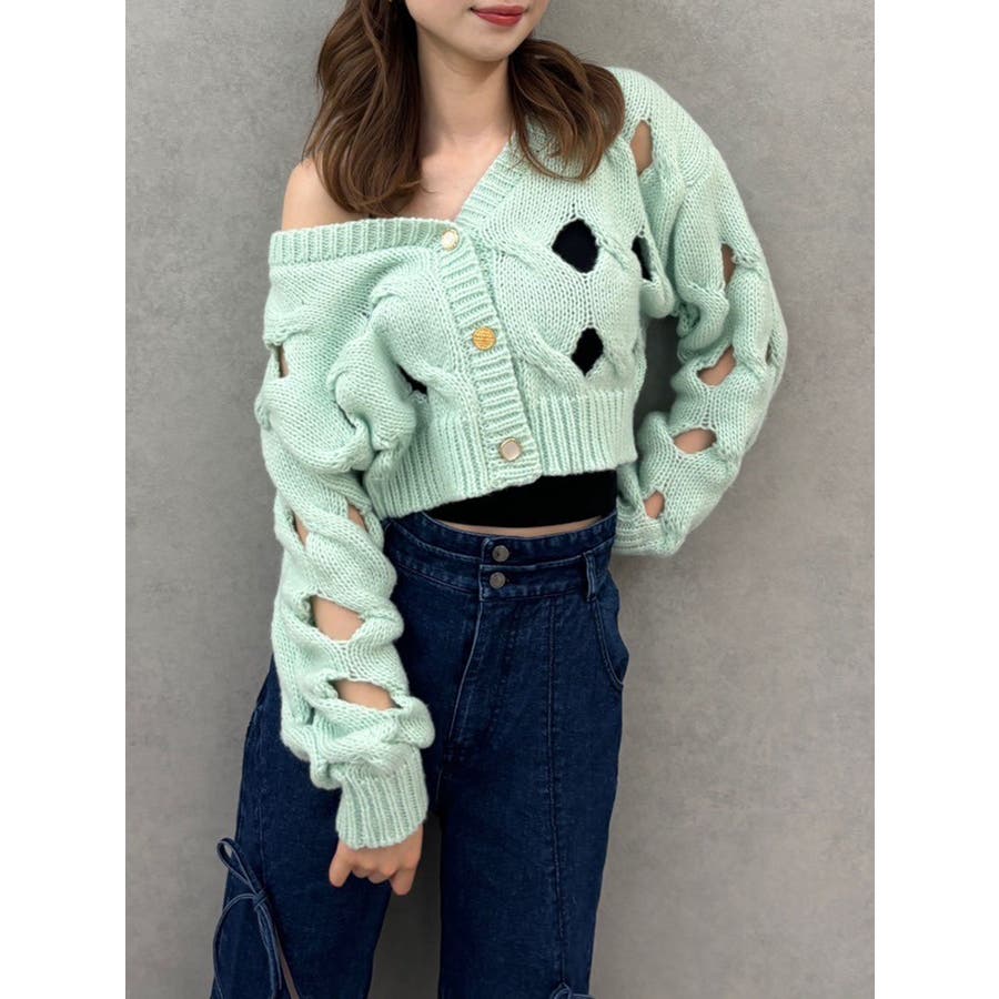 立体感のあるケーブル編みに大きめのスリットを施したショートカーディガン。アイレットから素肌やインナーをのぞかせて、つや感のある印象に。フロントのマルチ釦がコーディネートに華やかさをプラスします。1枚羽織るとこなれ感のあるニットは活躍間違いなしの一着です。【スタイリング】ショート丈なのでハイウエストパンツやデニムとも好相性。クロップド丈なのでワンピースの羽織りとしても重宝します。インナーにカラーのシアーカットソーやニットを合わせたレイヤードスタイルもお楽しみ頂けます。
