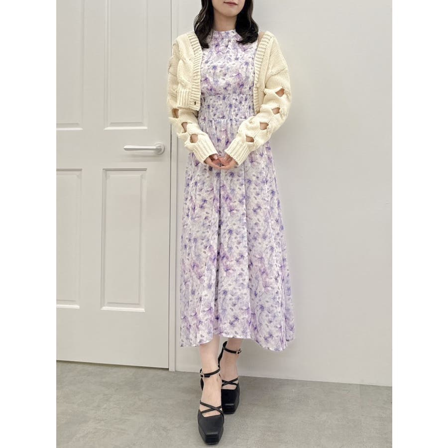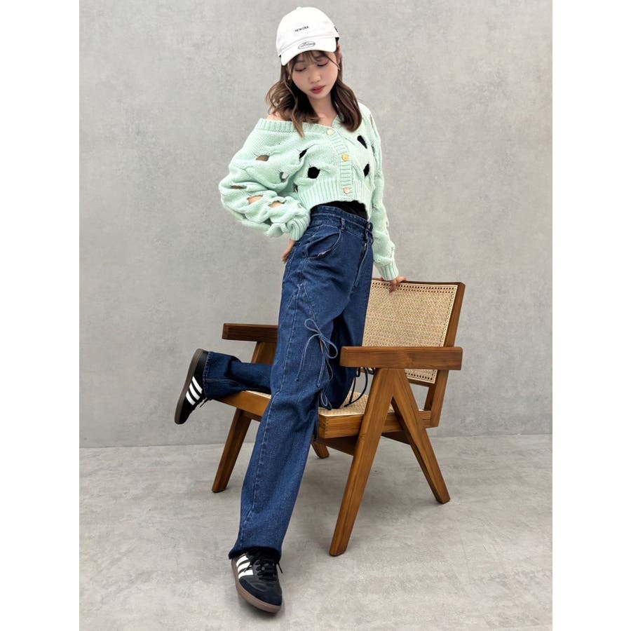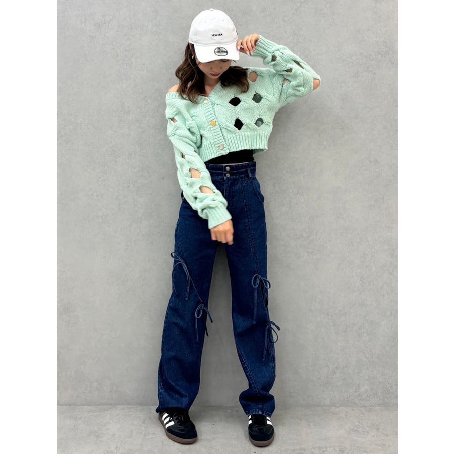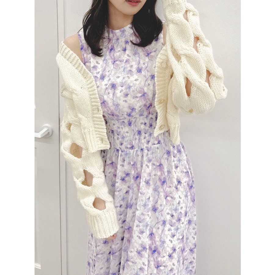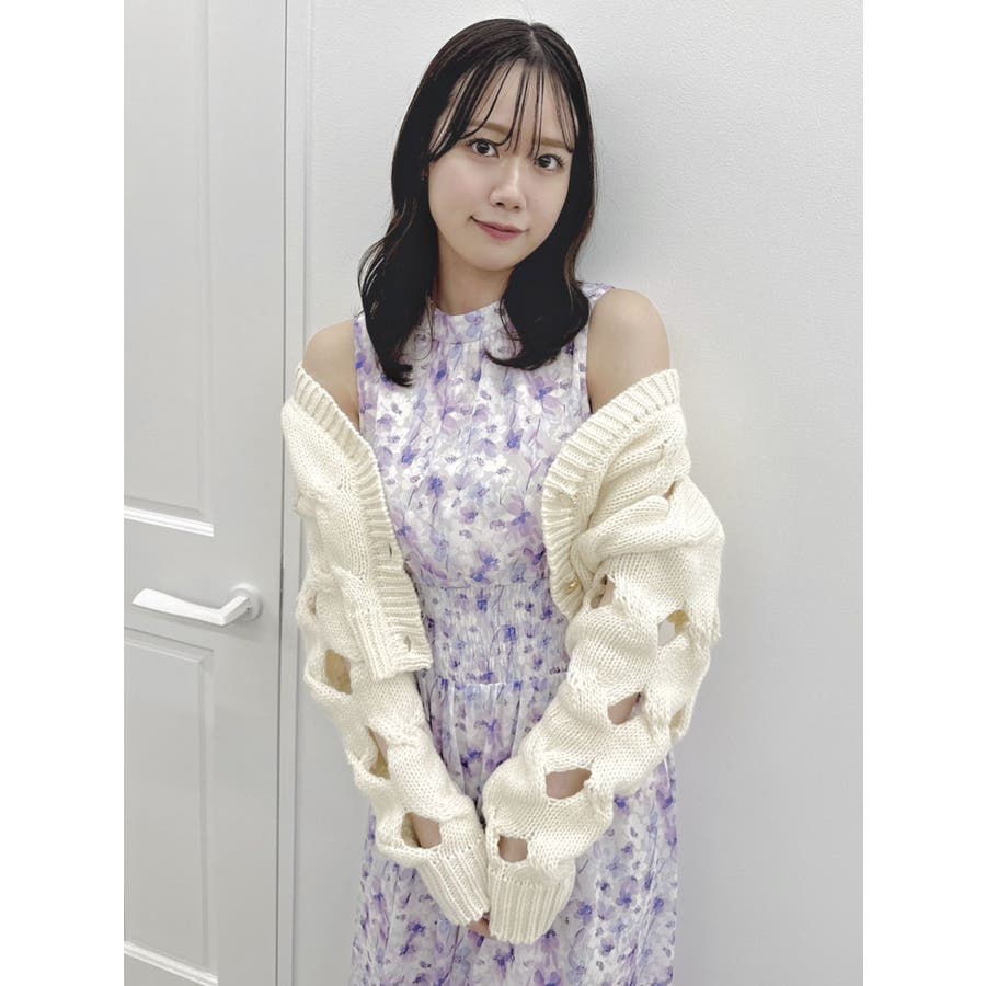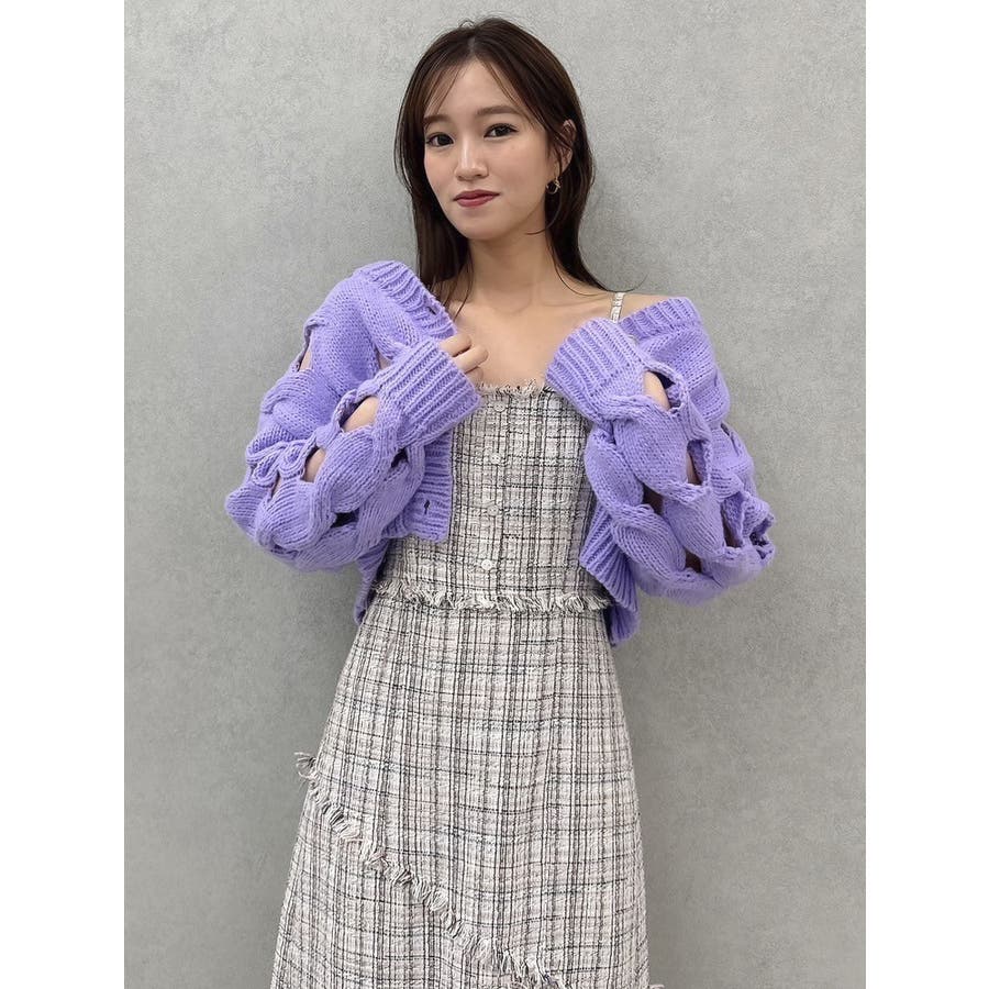 立体感のあるケーブル編みに大きめのスリットを施したショートカーディガン。アイレットから素肌やインナーをのぞかせて、つや感のある印象に。フロントのマルチ釦がコーディネートに華やかさをプラスします。1枚羽織るとこなれ感のあるニットは活躍間違いなしの一着です。【スタイリング】ショート丈なのでハイウエストパンツやデニムとも好相性。クロップド丈なのでワンピースの羽織りとしても重宝します。インナーにカラーのシアーカットソーやニットを合わせたレイヤードスタイルもお楽しみ頂けます。