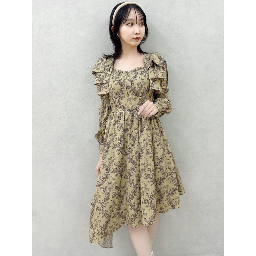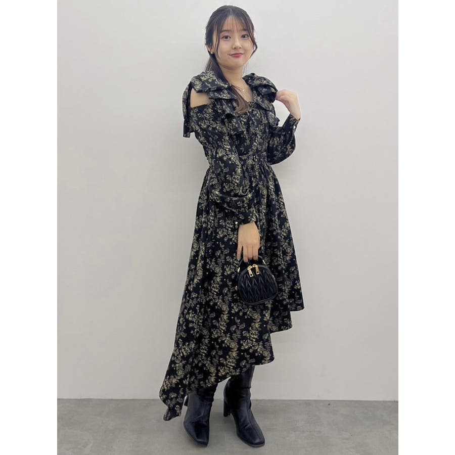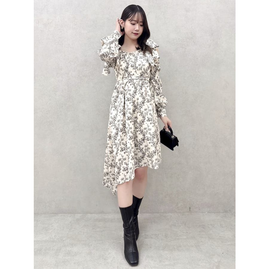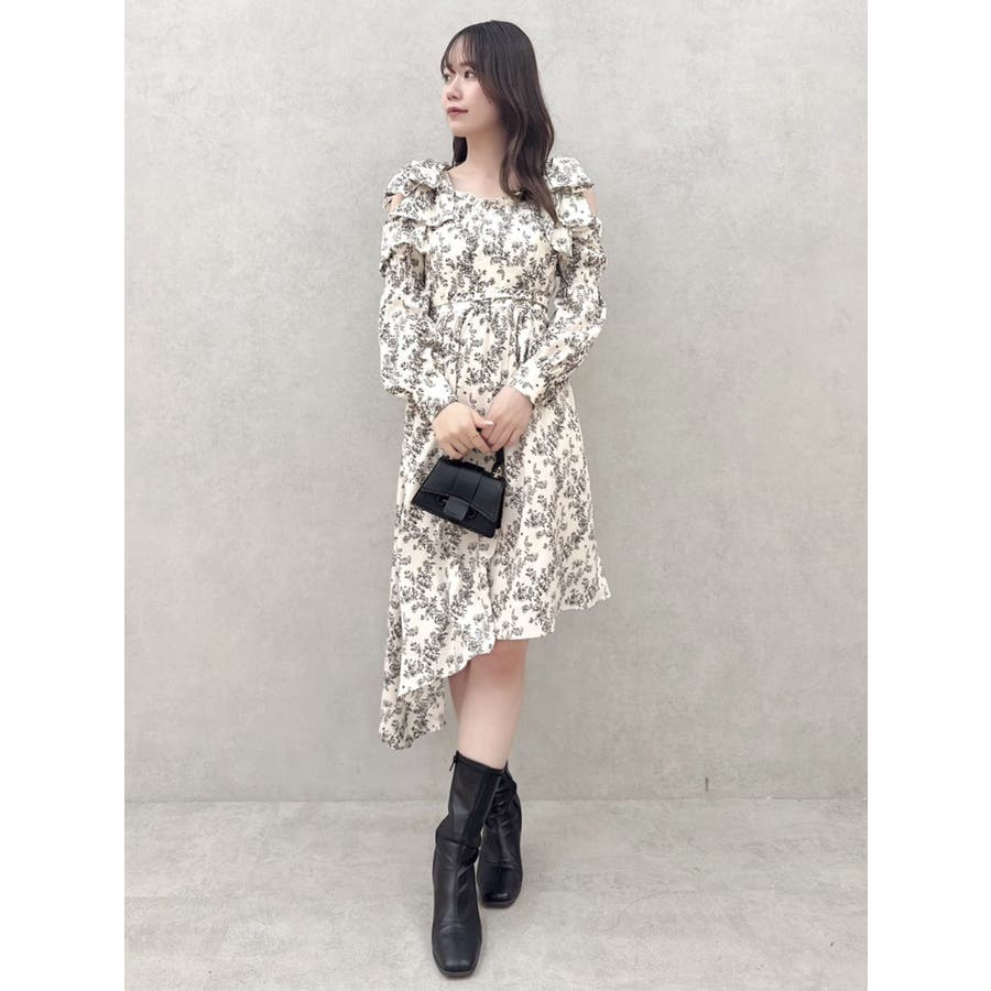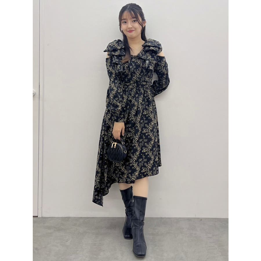 【商品】肩部分のリボンでSWEETな印象に仕上がったワンピースです。ウエスト部分のベルトマークでスタイルアップ。アシンメトリーになった裾のデザインがdazzlin(ダズリン)らしい遊び心を閉じ込めています。【スタイリング】ライダースジャケットやテーラードジャケットを合わせてマニッシュなコーデがおすすめです。甘辛なスタイリングが楽しめます。
