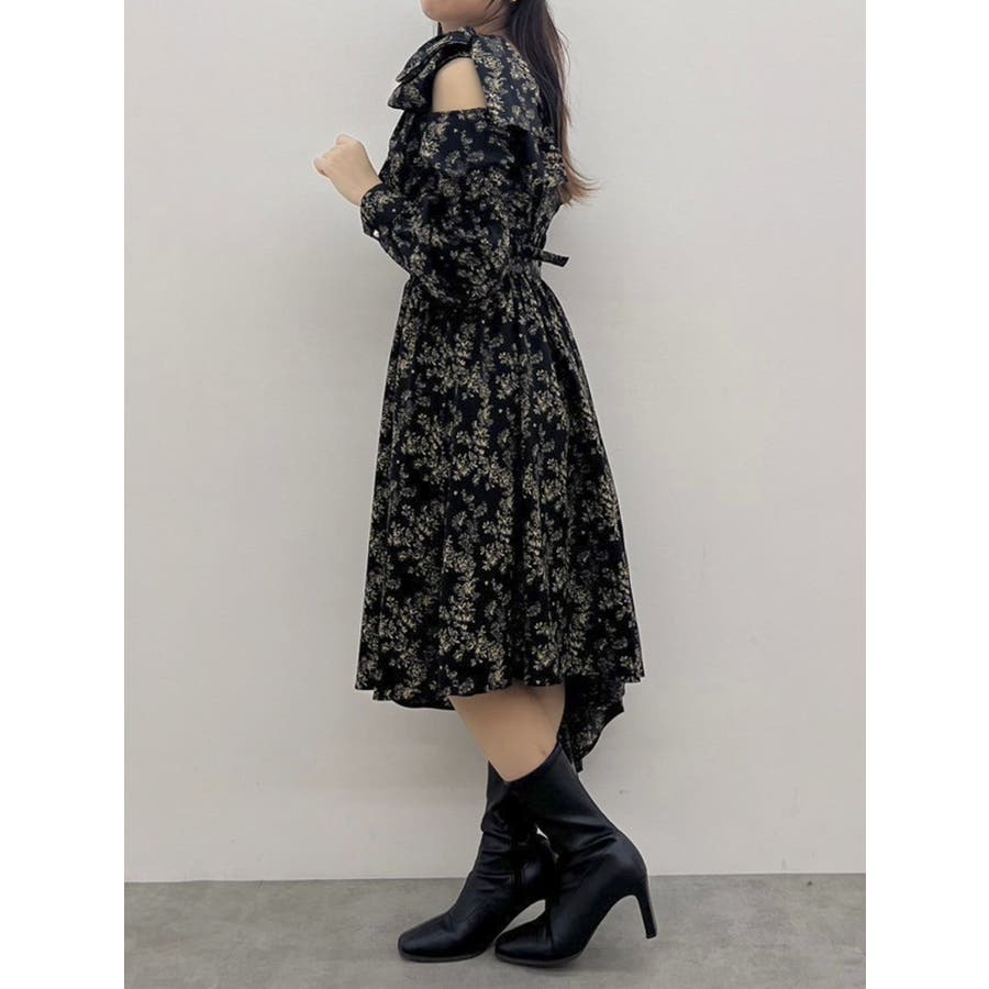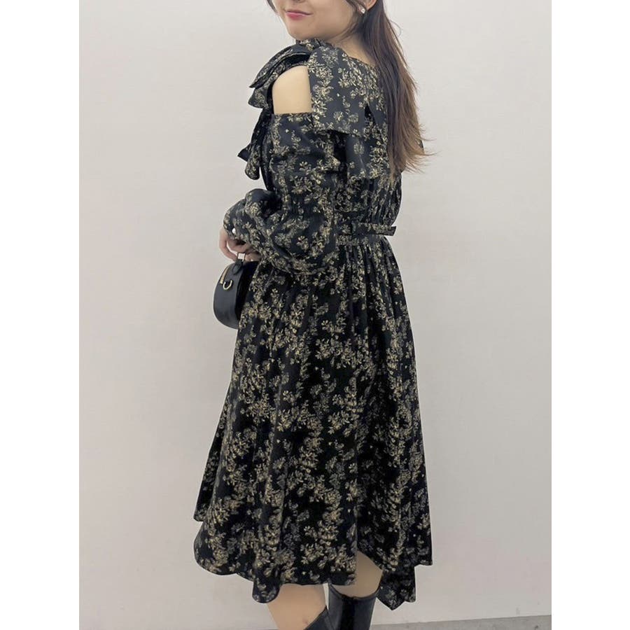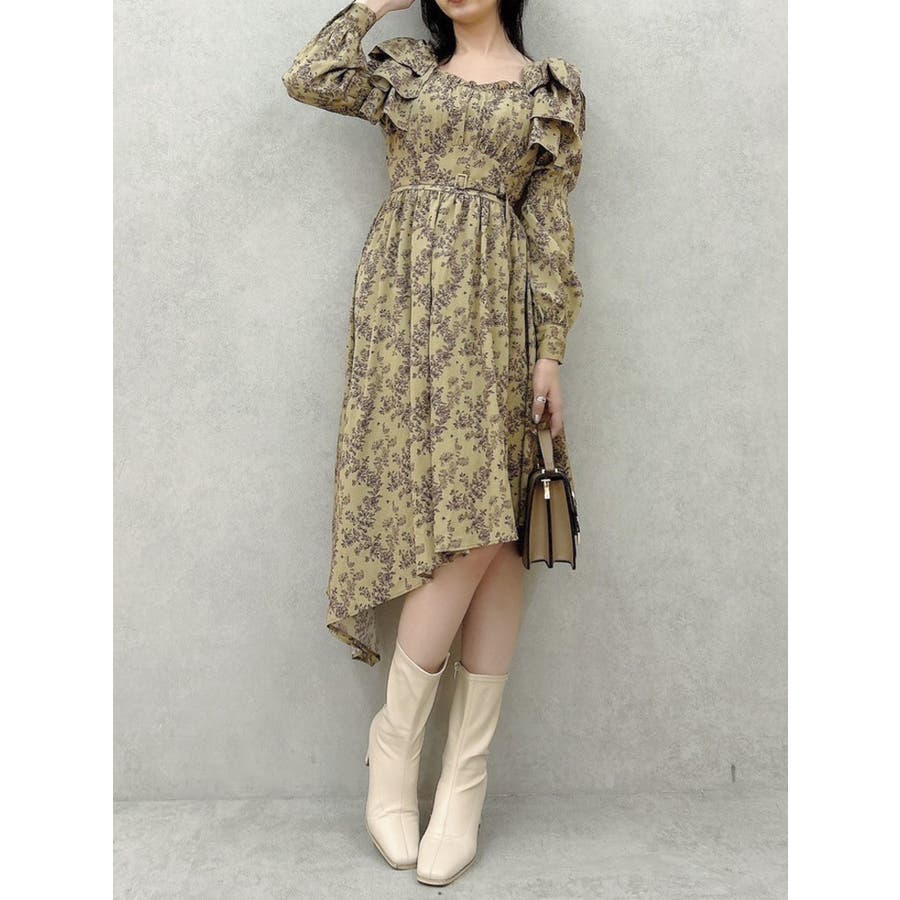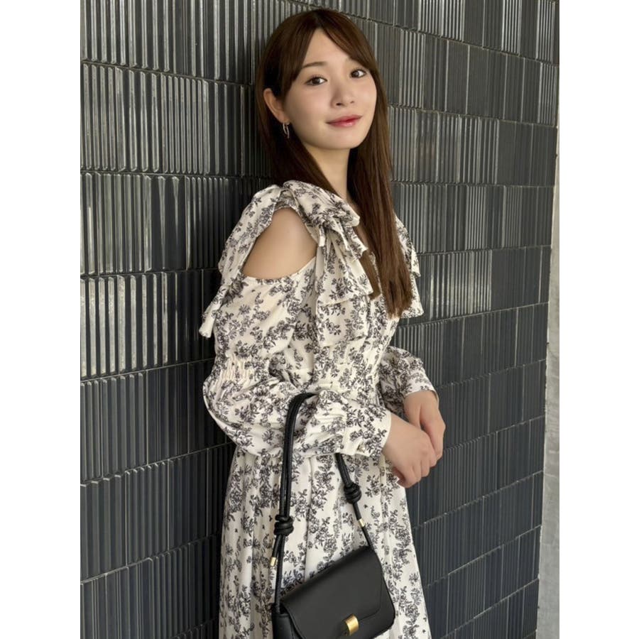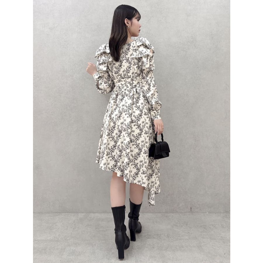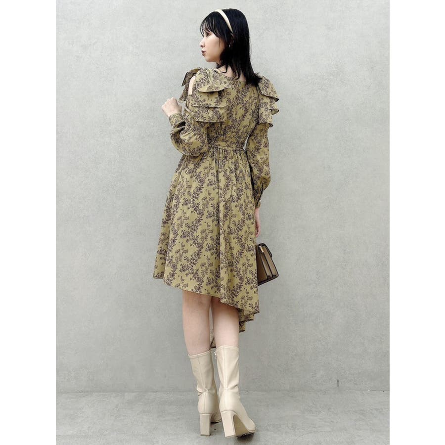 【商品】肩部分のリボンでSWEETな印象に仕上がったワンピースです。ウエスト部分のベルトマークでスタイルアップ。アシンメトリーになった裾のデザインがdazzlin(ダズリン)らしい遊び心を閉じ込めています。【スタイリング】ライダースジャケットやテーラードジャケットを合わせてマニッシュなコーデがおすすめです。甘辛なスタイリングが楽しめます。