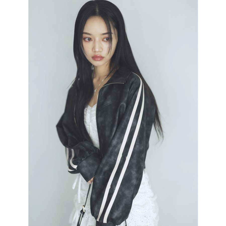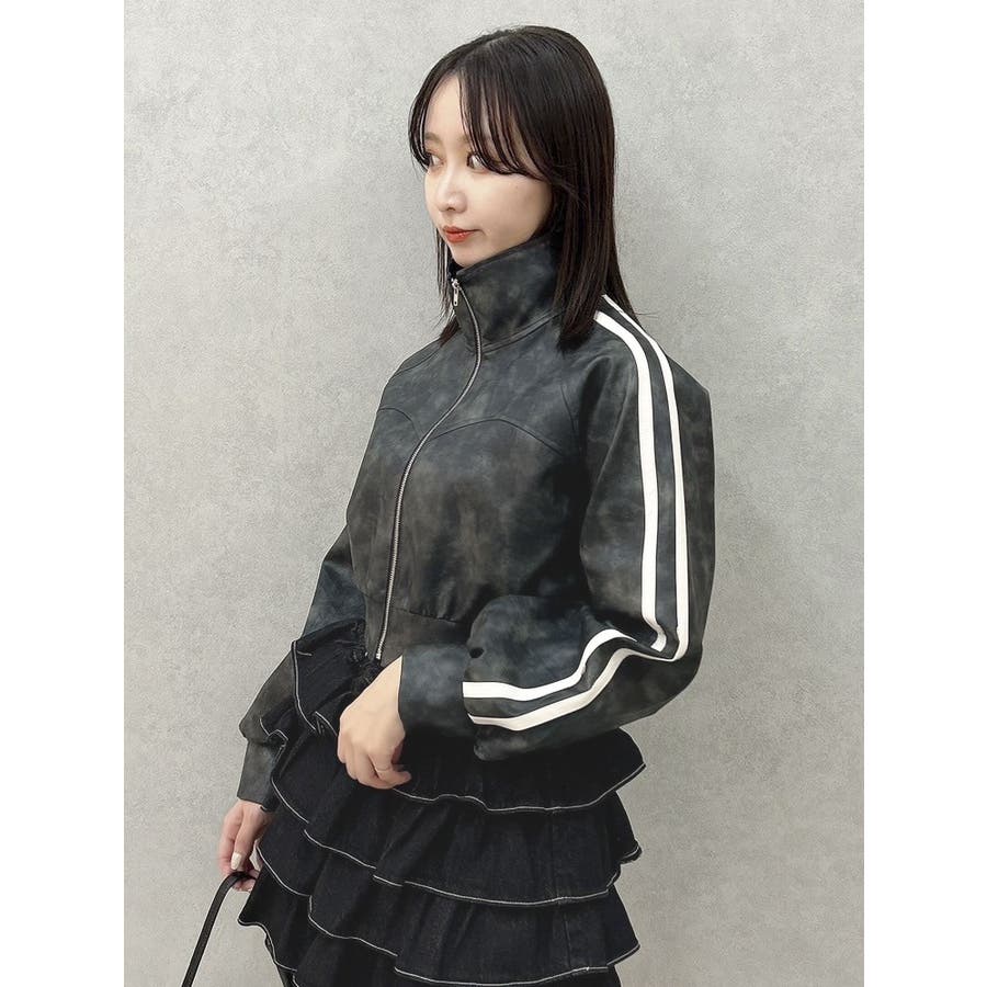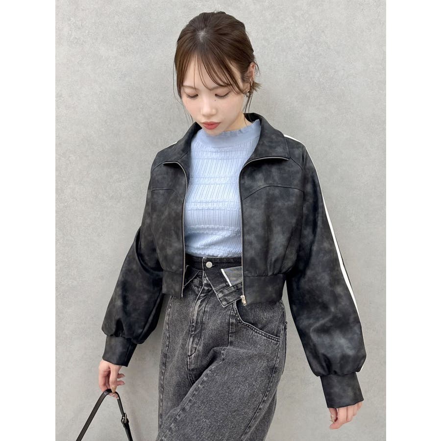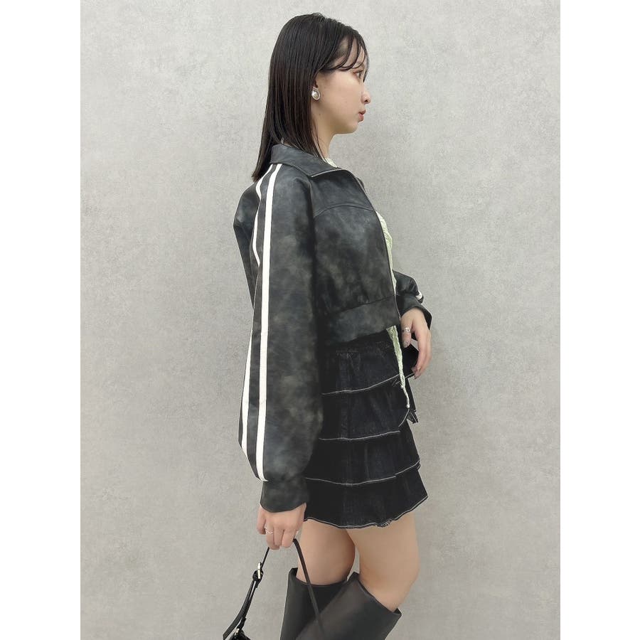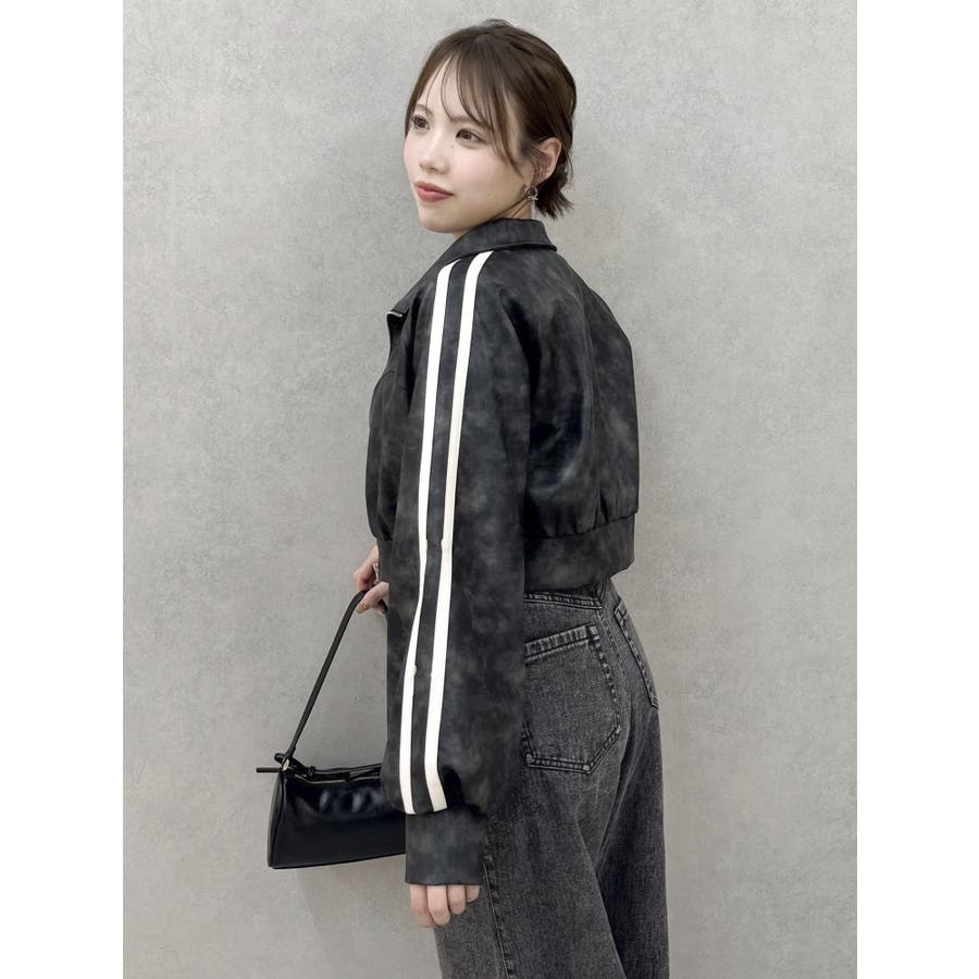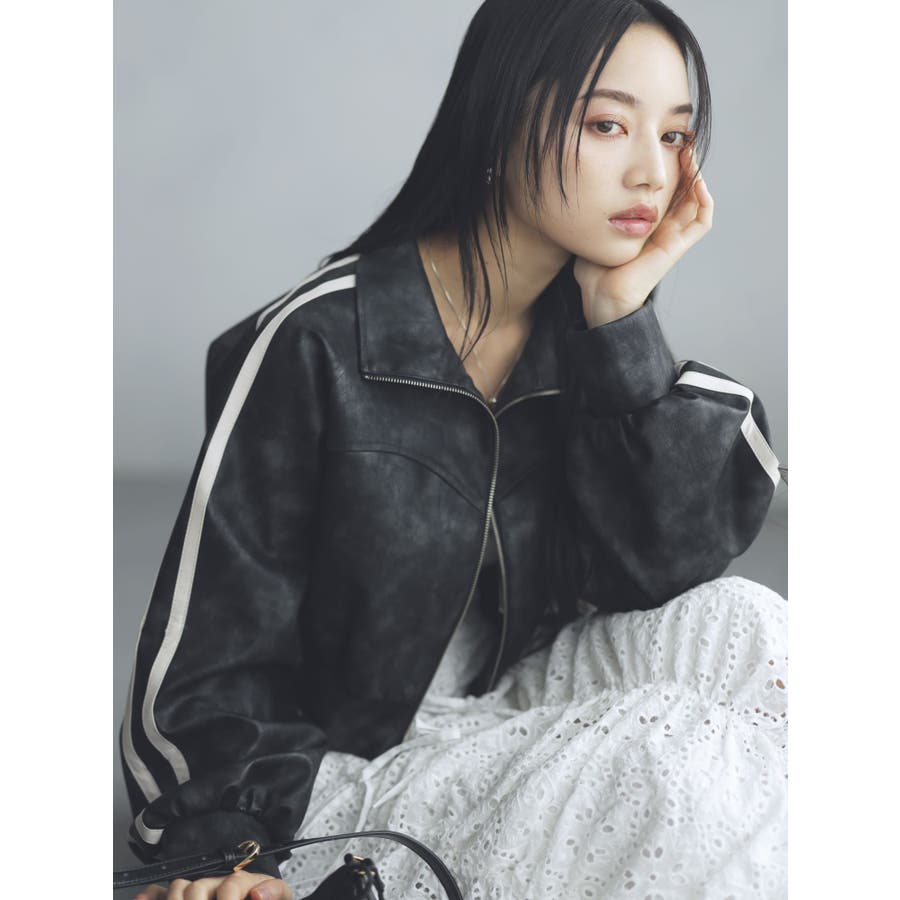 【商品】コンパクトサイズでトップス感覚で着られる羽織として登場。ムラ感のある合皮を採用して表情を作りました。襟や裾も共生地にする事でキレイ目な印象へと誘います。【スタイリング】キャミワンピース合わせで甘さと辛さをMIXさせたバランス良いスタイルに。プリーツスカート合わせも今季らしくスポーティに決まります。