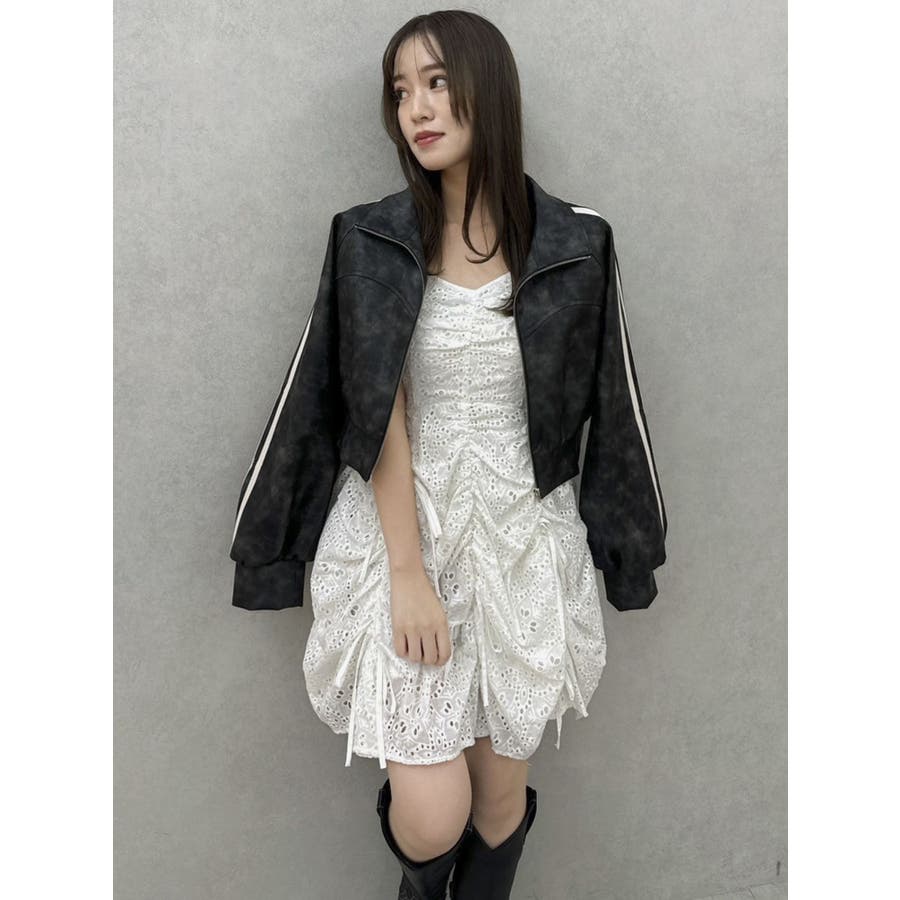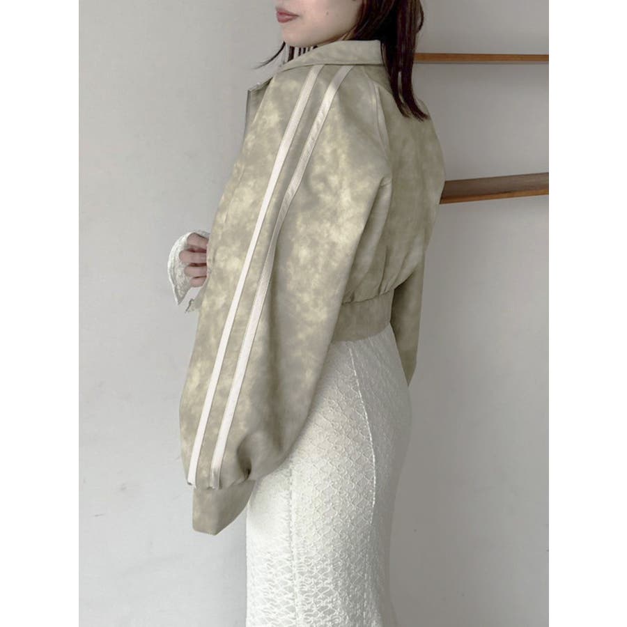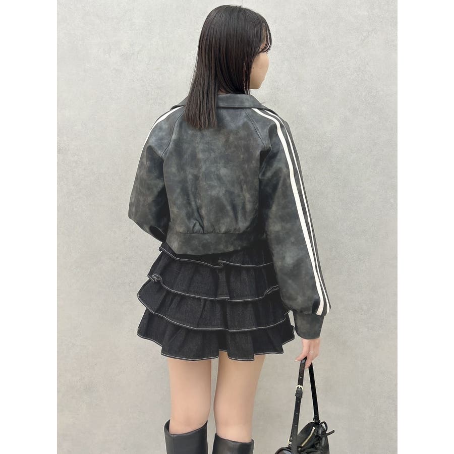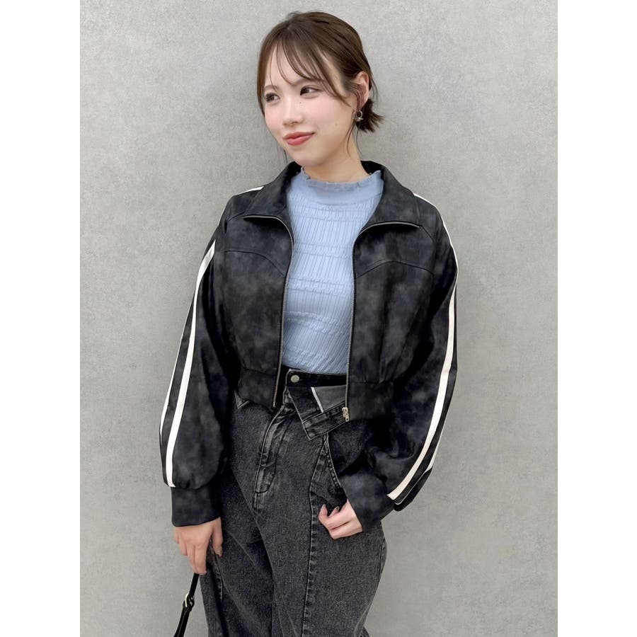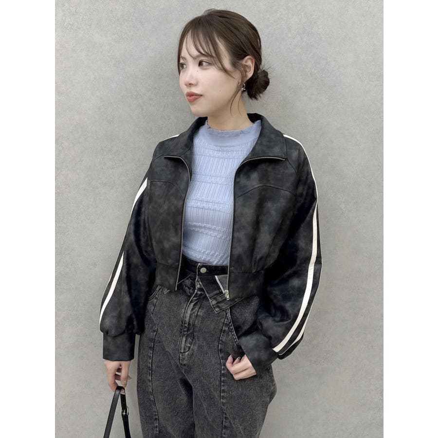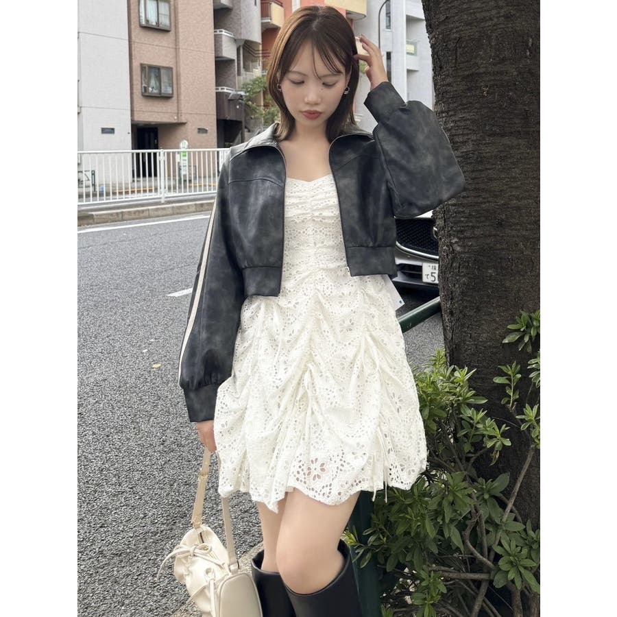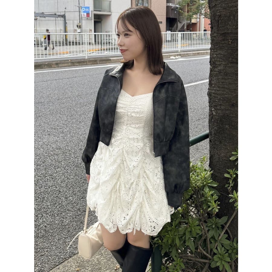 【商品】コンパクトサイズでトップス感覚で着られる羽織として登場。ムラ感のある合皮を採用して表情を作りました。襟や裾も共生地にする事でキレイ目な印象へと誘います。【スタイリング】キャミワンピース合わせで甘さと辛さをMIXさせたバランス良いスタイルに。プリーツスカート合わせも今季らしくスポーティに決まります。