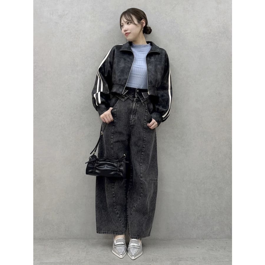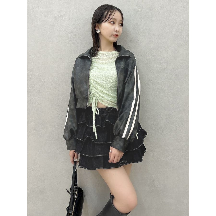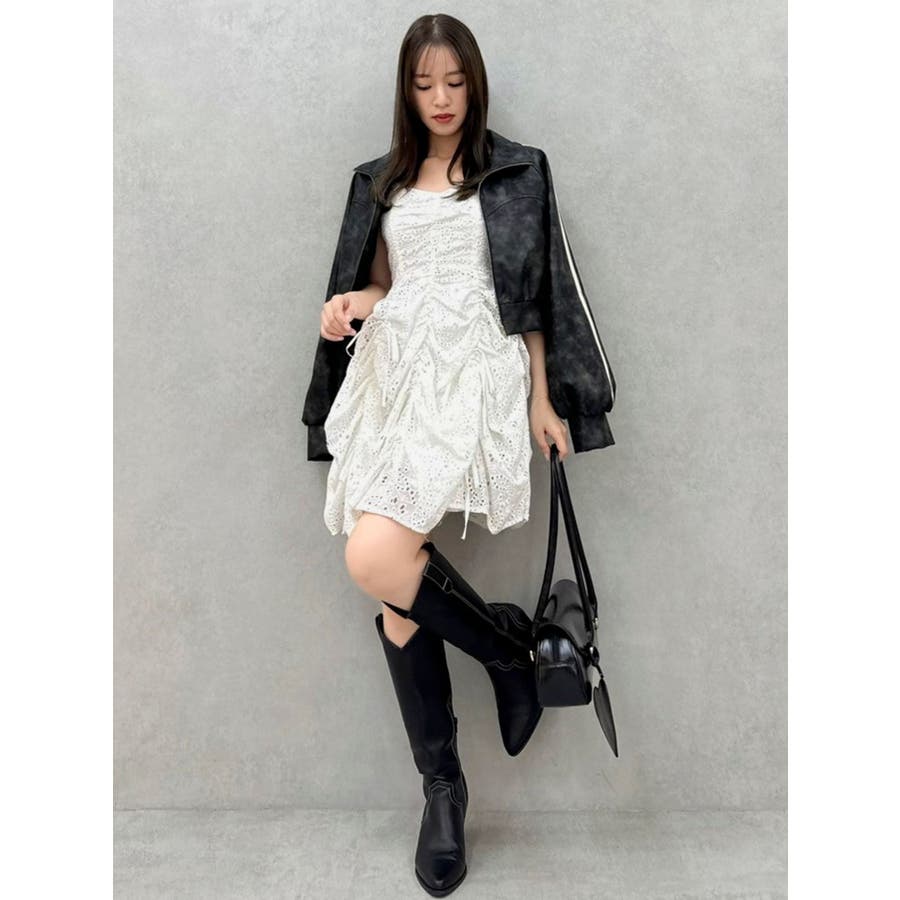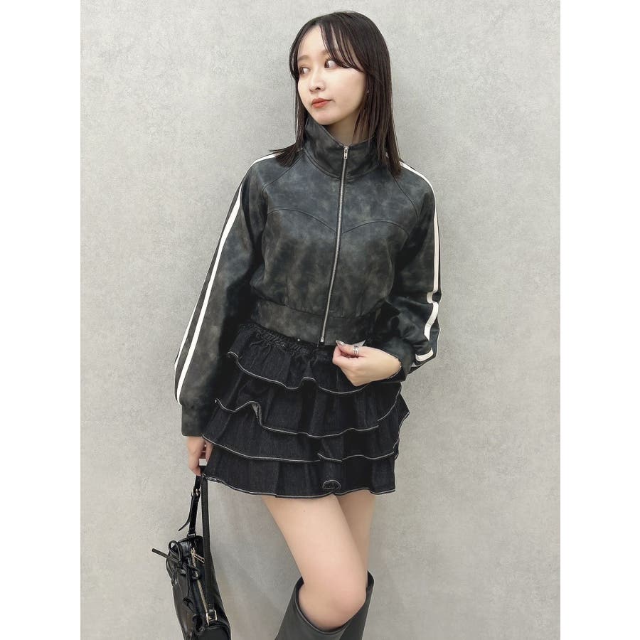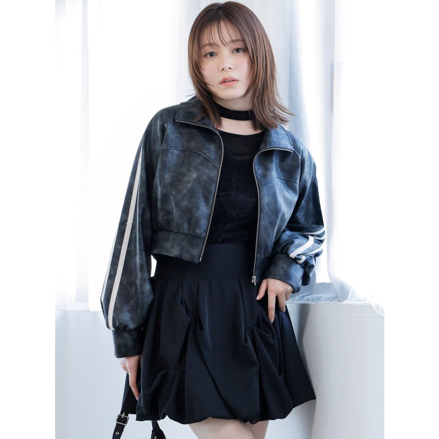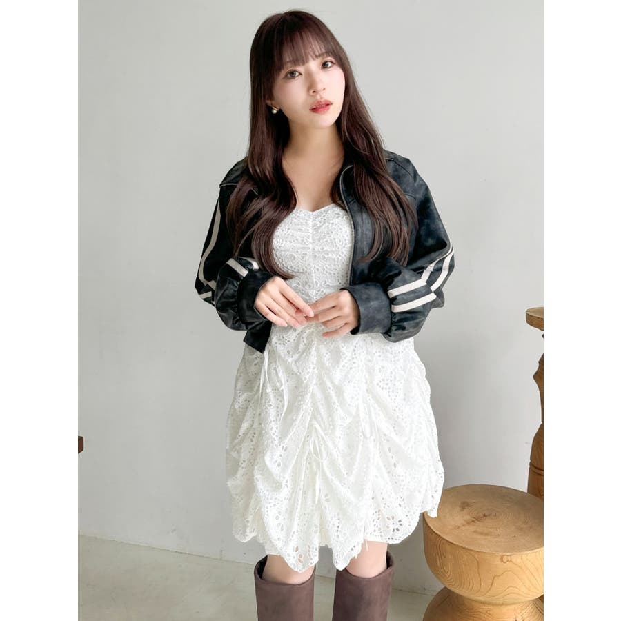 【商品】コンパクトサイズでトップス感覚で着られる羽織として登場。ムラ感のある合皮を採用して表情を作りました。襟や裾も共生地にする事でキレイ目な印象へと誘います。【スタイリング】キャミワンピース合わせで甘さと辛さをMIXさせたバランス良いスタイルに。プリーツスカート合わせも今季らしくスポーティに決まります。