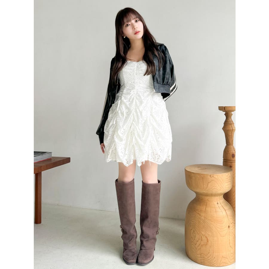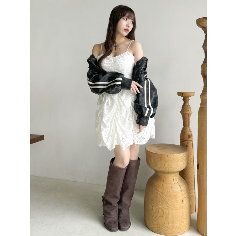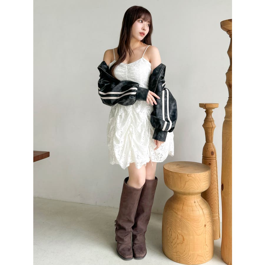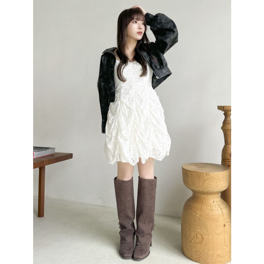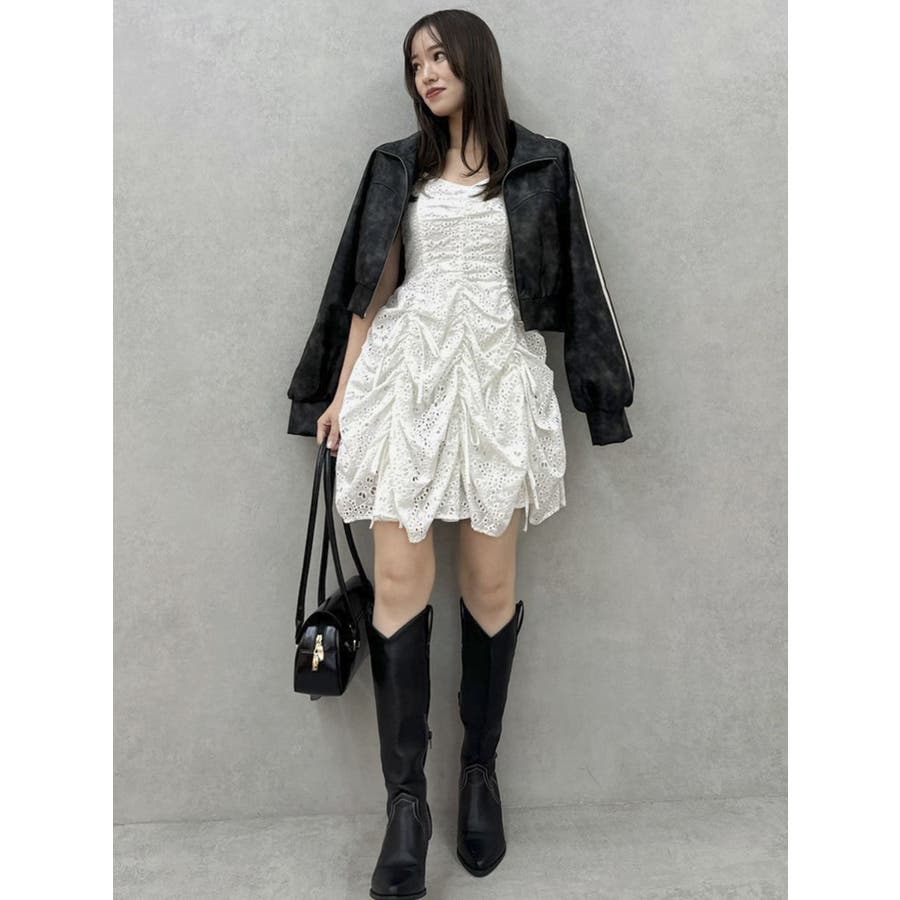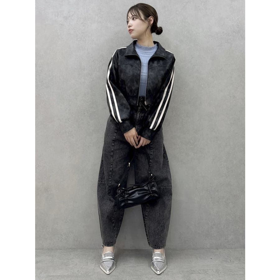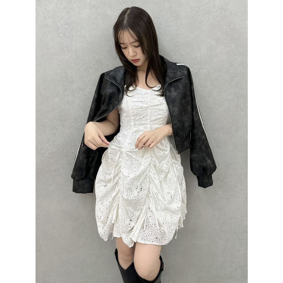 【商品】コンパクトサイズでトップス感覚で着られる羽織として登場。ムラ感のある合皮を採用して表情を作りました。襟や裾も共生地にする事でキレイ目な印象へと誘います。【スタイリング】キャミワンピース合わせで甘さと辛さをMIXさせたバランス良いスタイルに。プリーツスカート合わせも今季らしくスポーティに決まります。