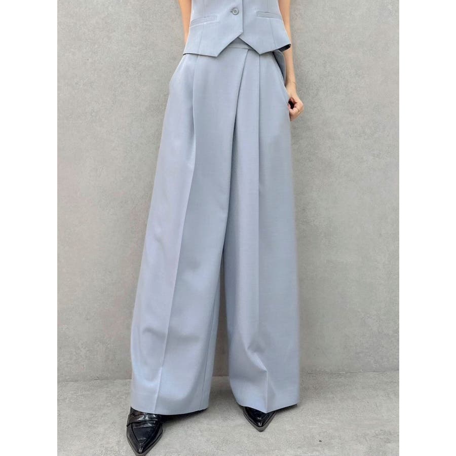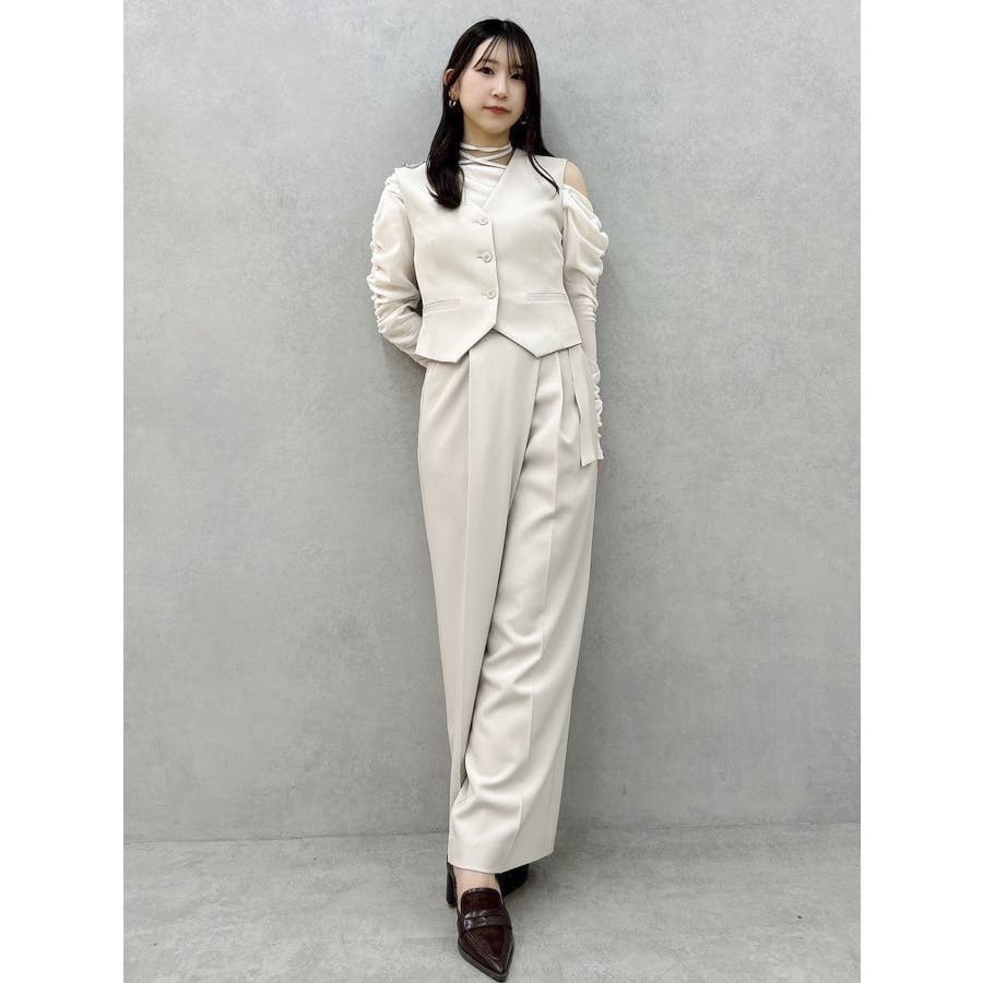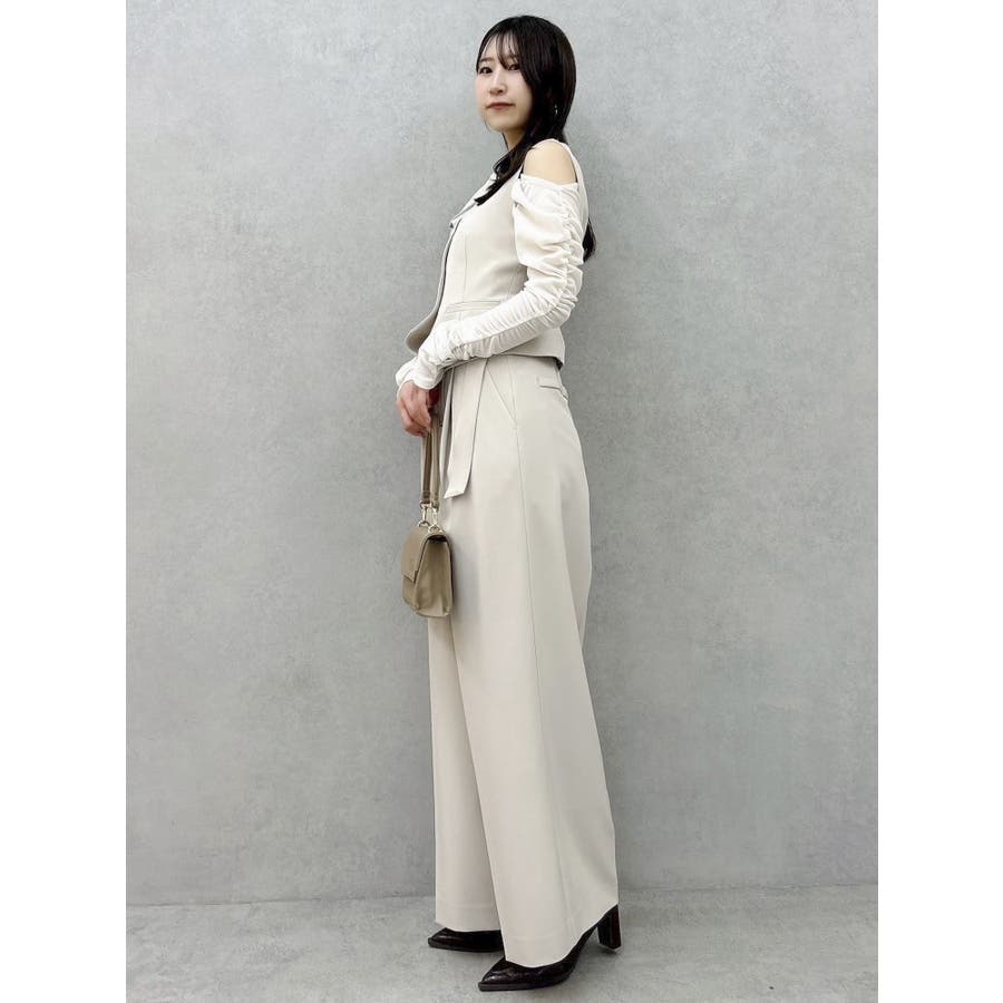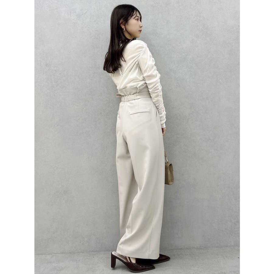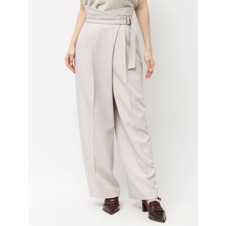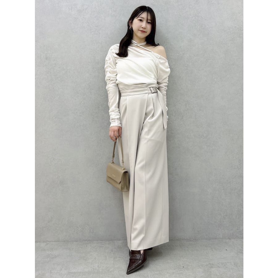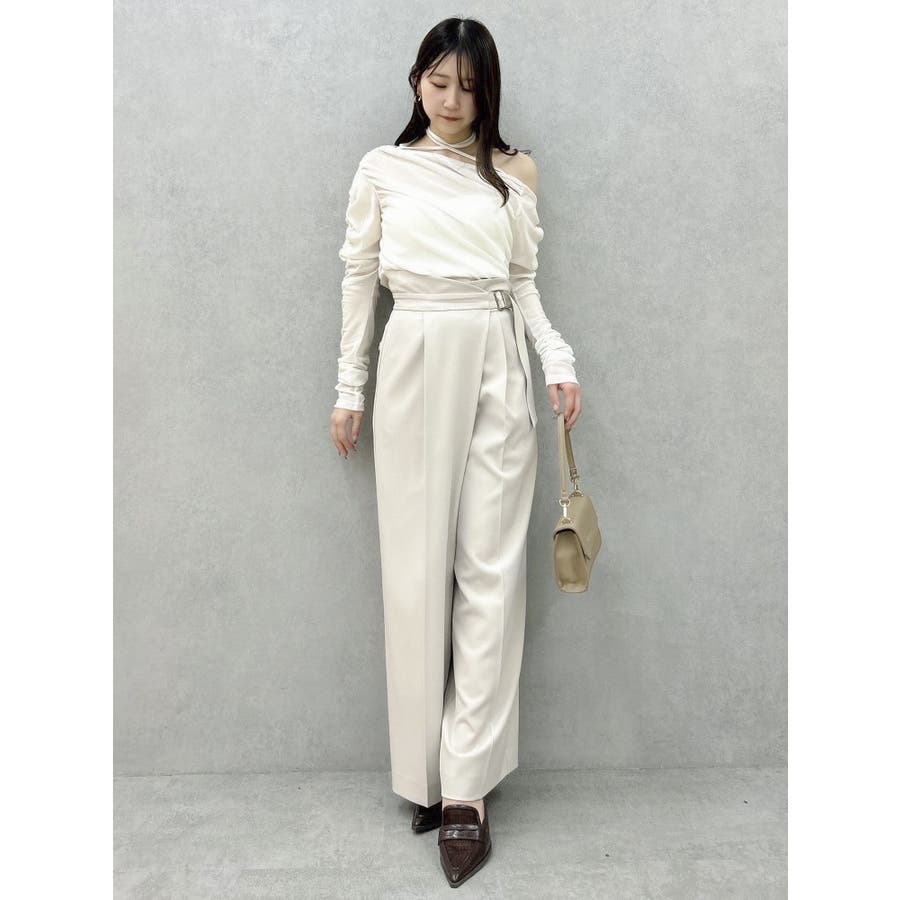 【商品】程よいワイド感とセンタープレスが脚長効果抜群の穿くだけでスタイルアップパンツ。アシメウエストデザインでINスタイルが決まり、モードな印象がありながらきれいめにも見せられるので、様々なシーンで活躍してくれてます。【スタイリング】シャツブラウスやきれいめのカットソーを合わせたONスタイルにも、オフショルやキャミソールを合わせたOFFスタイルにも合わせやすく、スタイルアップが期待できるパンツです。