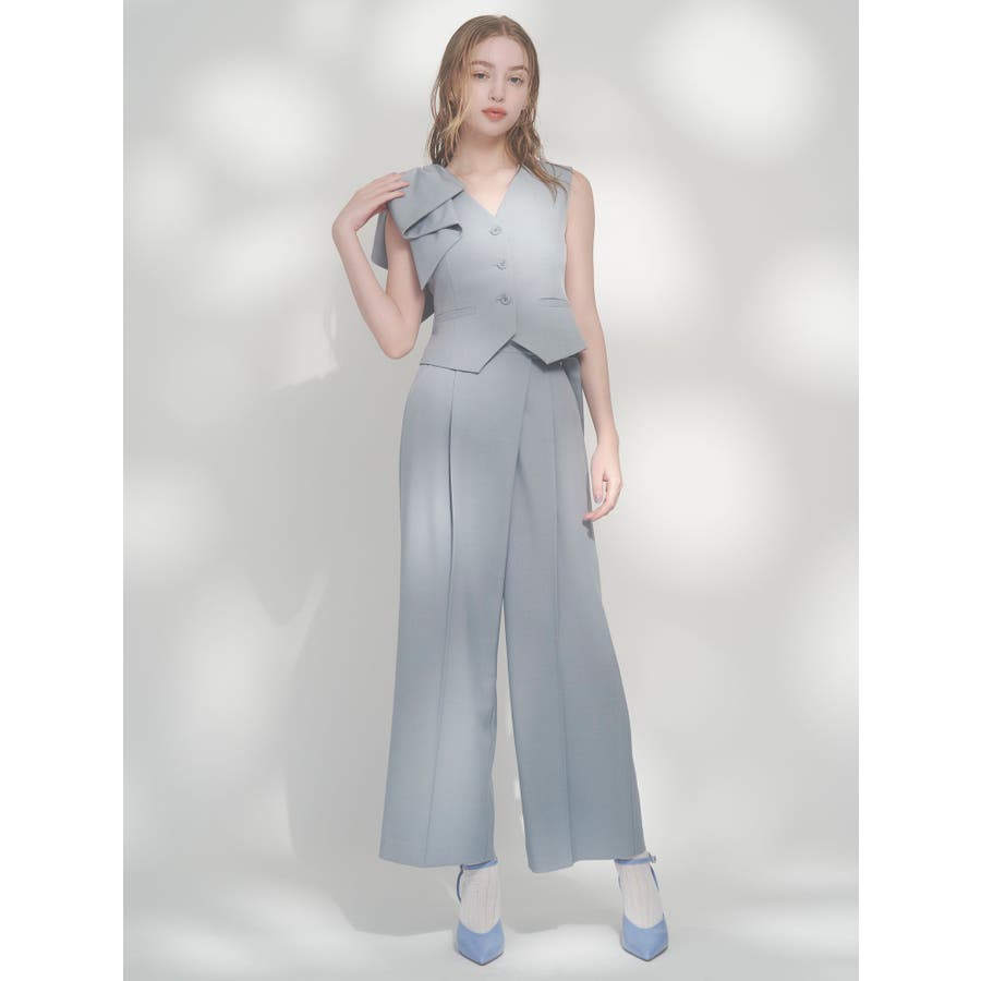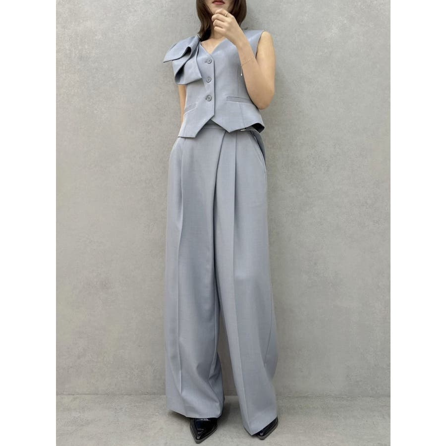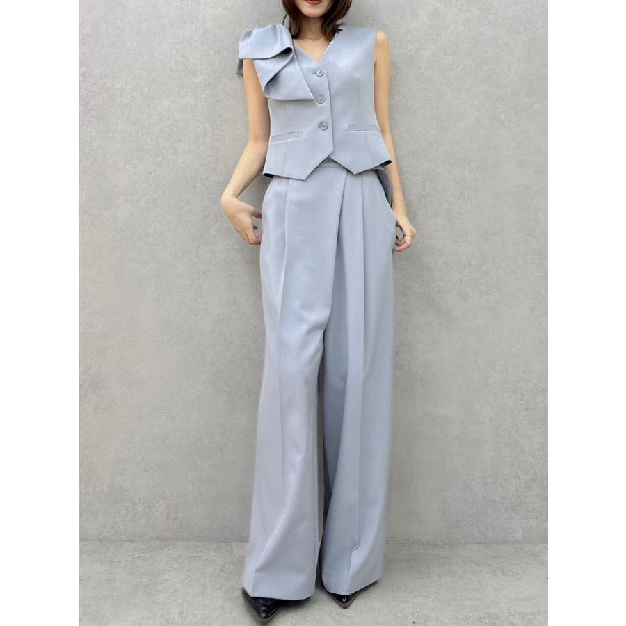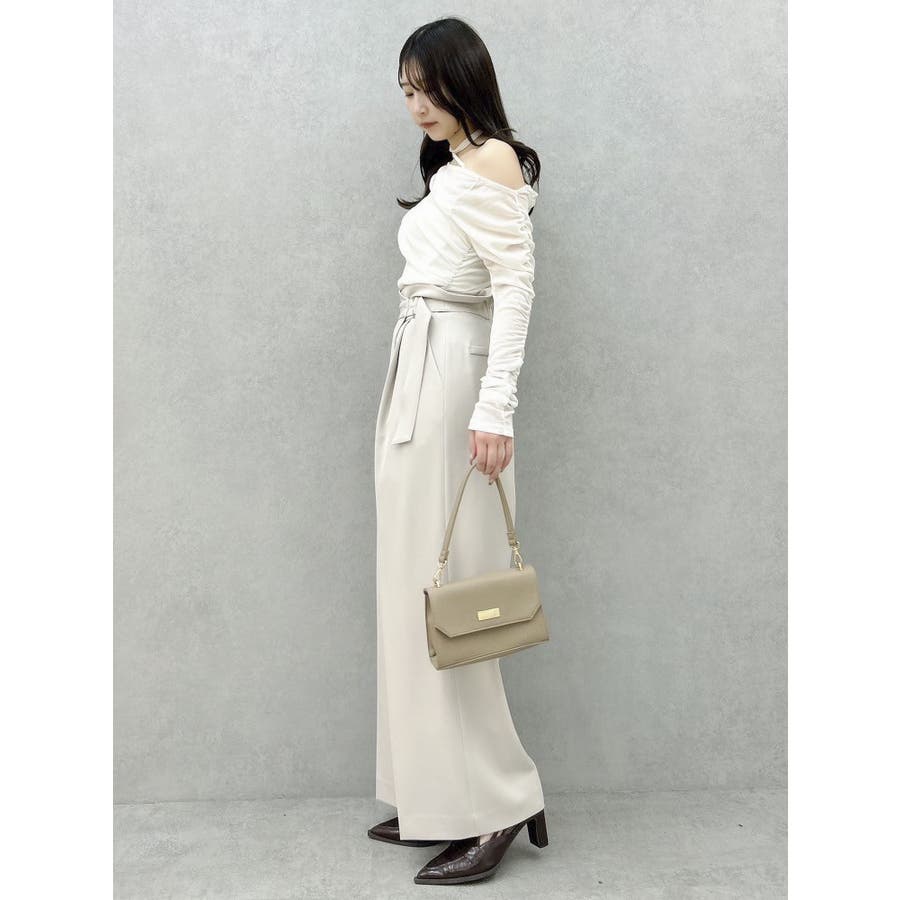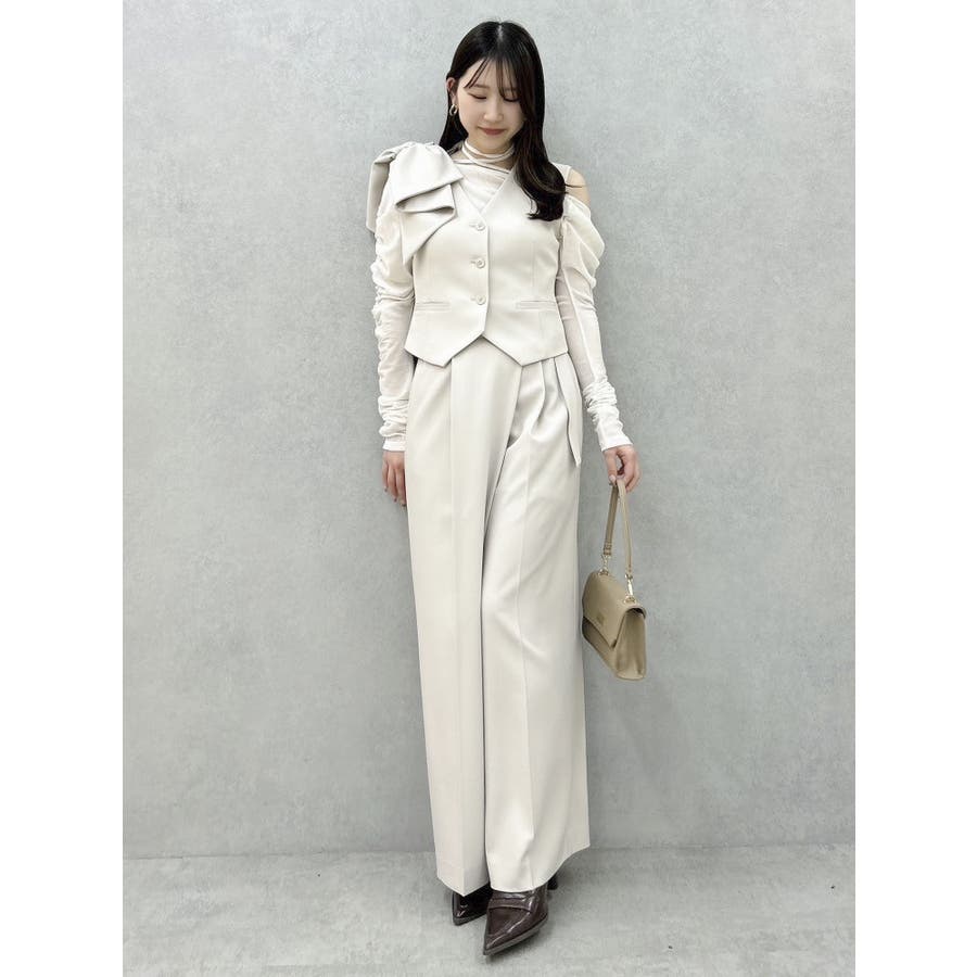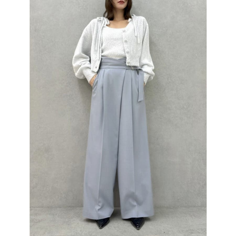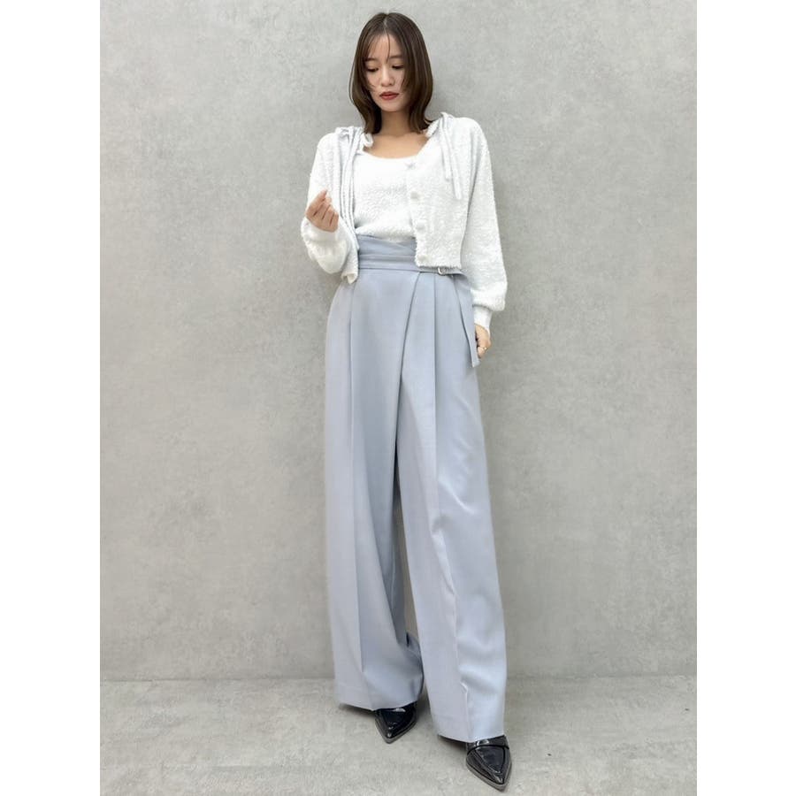 【商品】程よいワイド感とセンタープレスが脚長効果抜群の穿くだけでスタイルアップパンツ。アシメウエストデザインでINスタイルが決まり、モードな印象がありながらきれいめにも見せられるので、様々なシーンで活躍してくれてます。【スタイリング】シャツブラウスやきれいめのカットソーを合わせたONスタイルにも、オフショルやキャミソールを合わせたOFFスタイルにも合わせやすく、スタイルアップが期待できるパンツです。